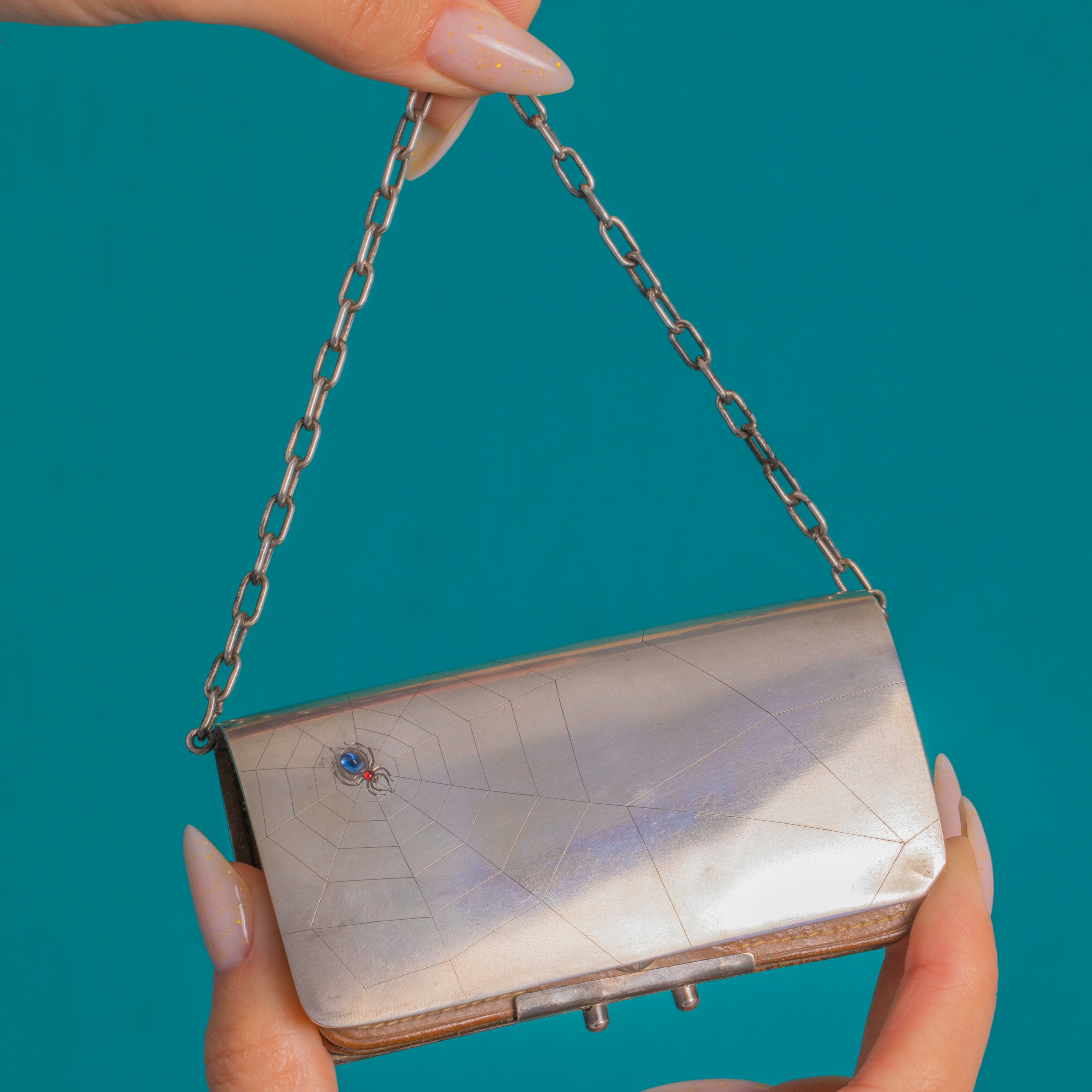 A wonderfully whimsical yet refined Arts & Crafts miniature purse, crafted in Silver with a radiating engraved spider’s web and a charming applied spider. Its abdomen glows with a Blue Sapphire cabochon, while a tiny Red Paste cabochon forms the head — a playful, gothic-tinged motif realised with elegant restraint.