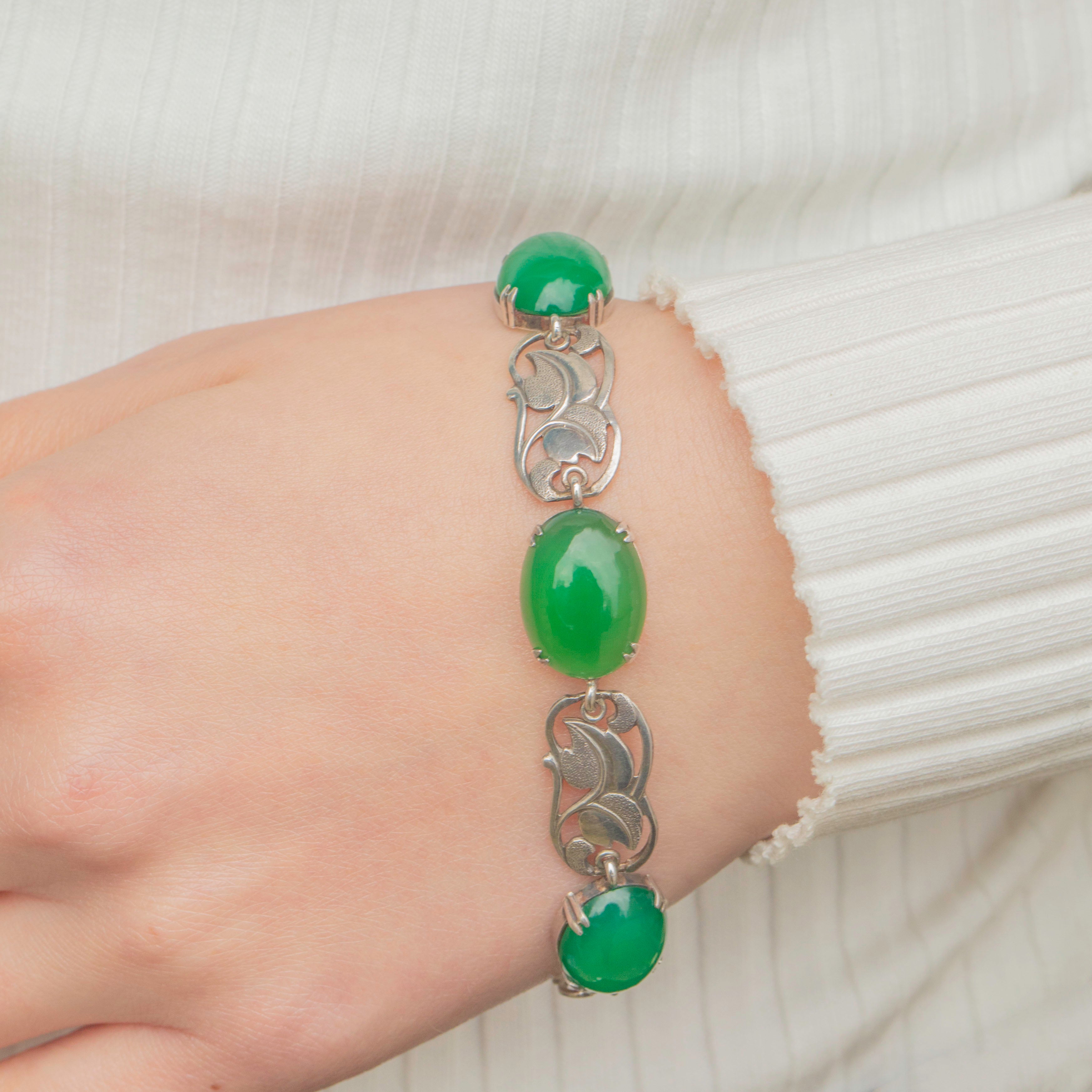 Add antique charm to your collection with this Arts and Crafts Silver Chrysoprase floral bracelet!