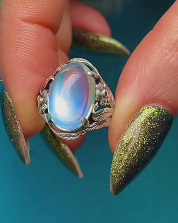 EXCELLENT. Especially when considering her grand age, this Arts and Crafts Silver Moonstone ring is in excellent condition! The Moonstone is set securely within the claw settings emanating a soft blue schiller, with a smooth finish. The foliate details are all securely soldered with no damage to note, illuminated by the antique patina in the grooves. With a well rounded ring shank to finish, this antique Moonstone ring glides onto your hand a dream!