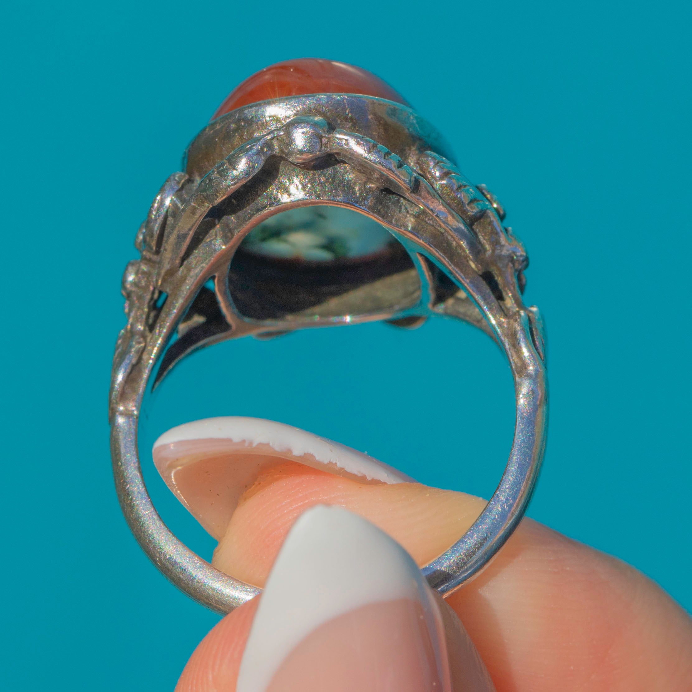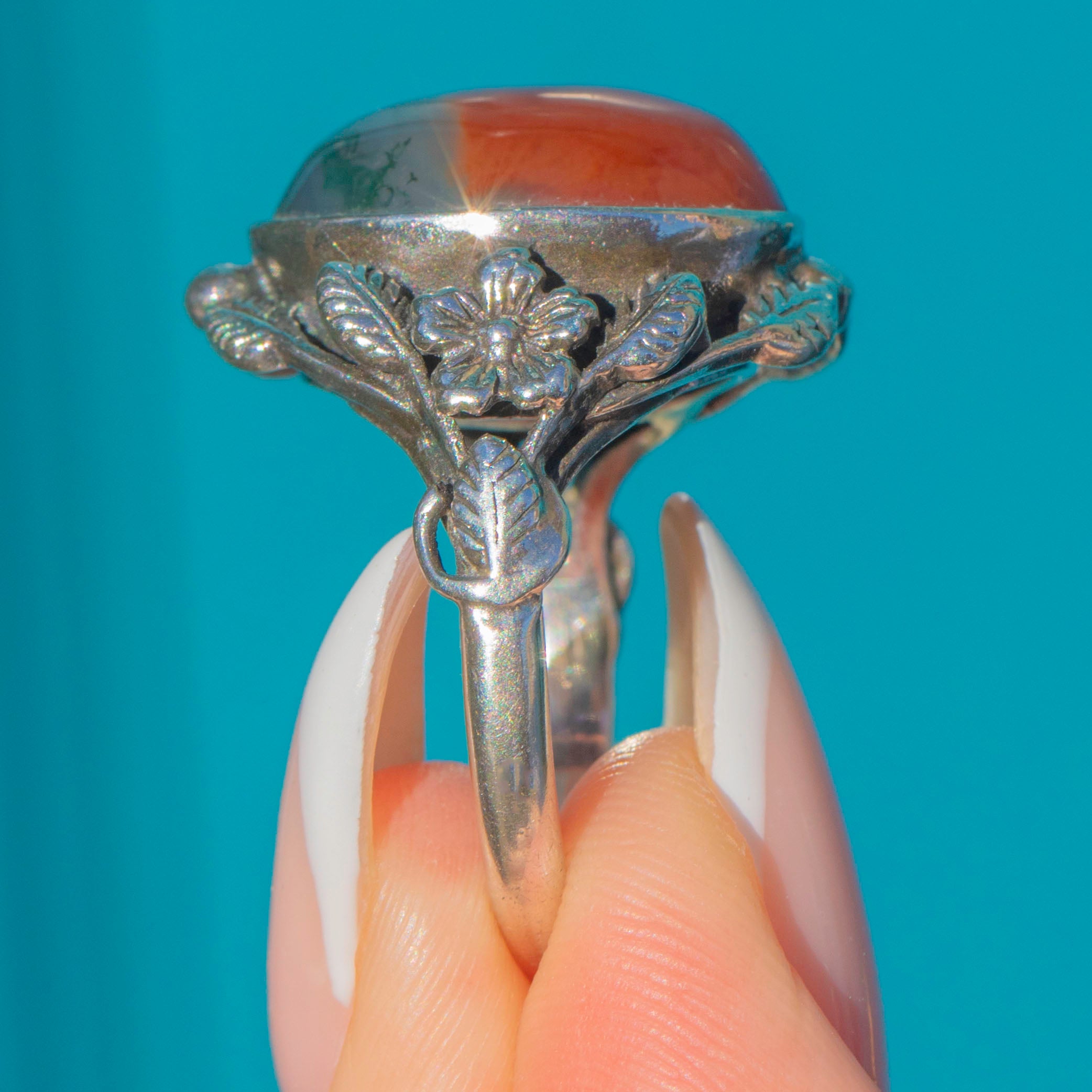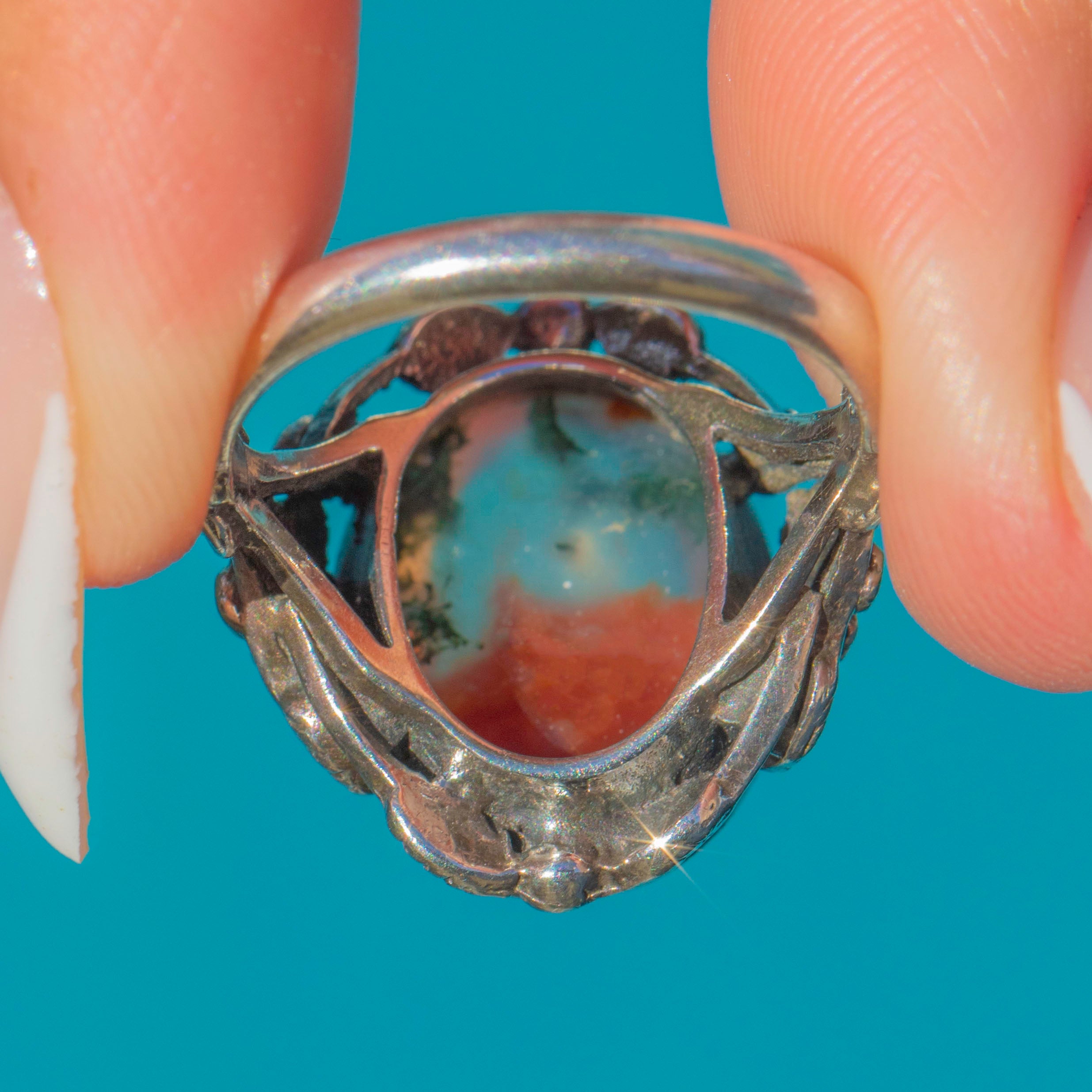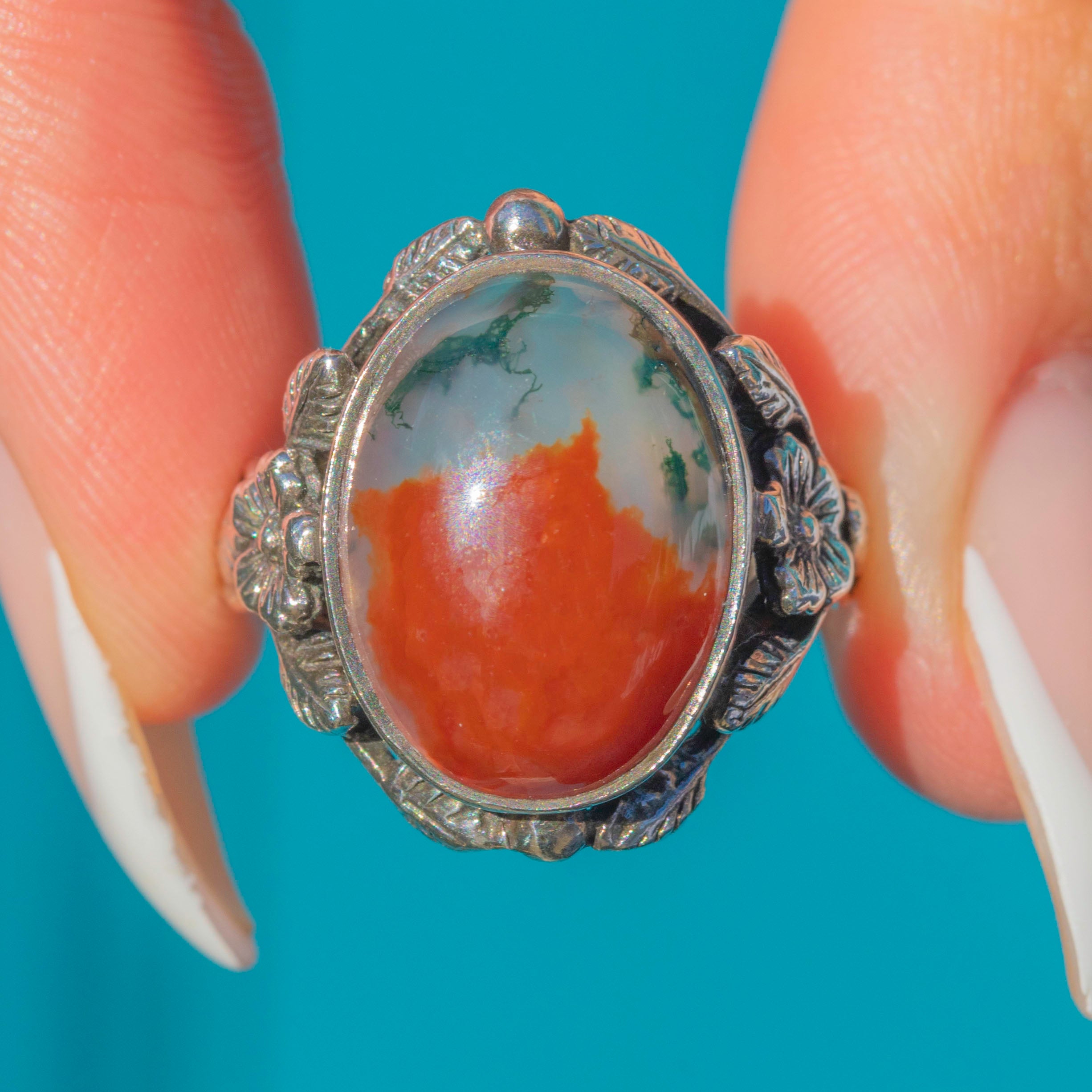 EXCELLENT. The Moss Agate is free from chips or scratches, and the Silver band shows no signs of wear. The patina is deep and attractive, complementing the natural tones of the gemstone beautifully.