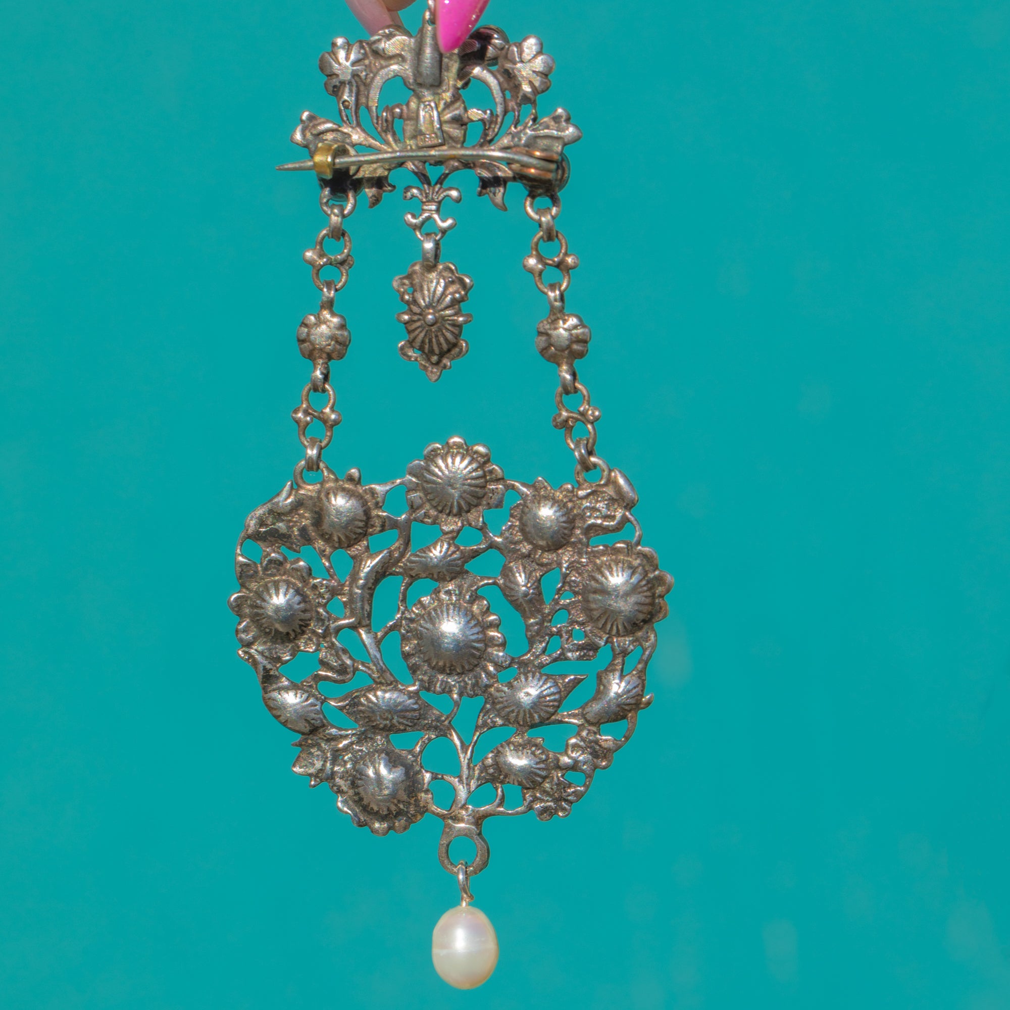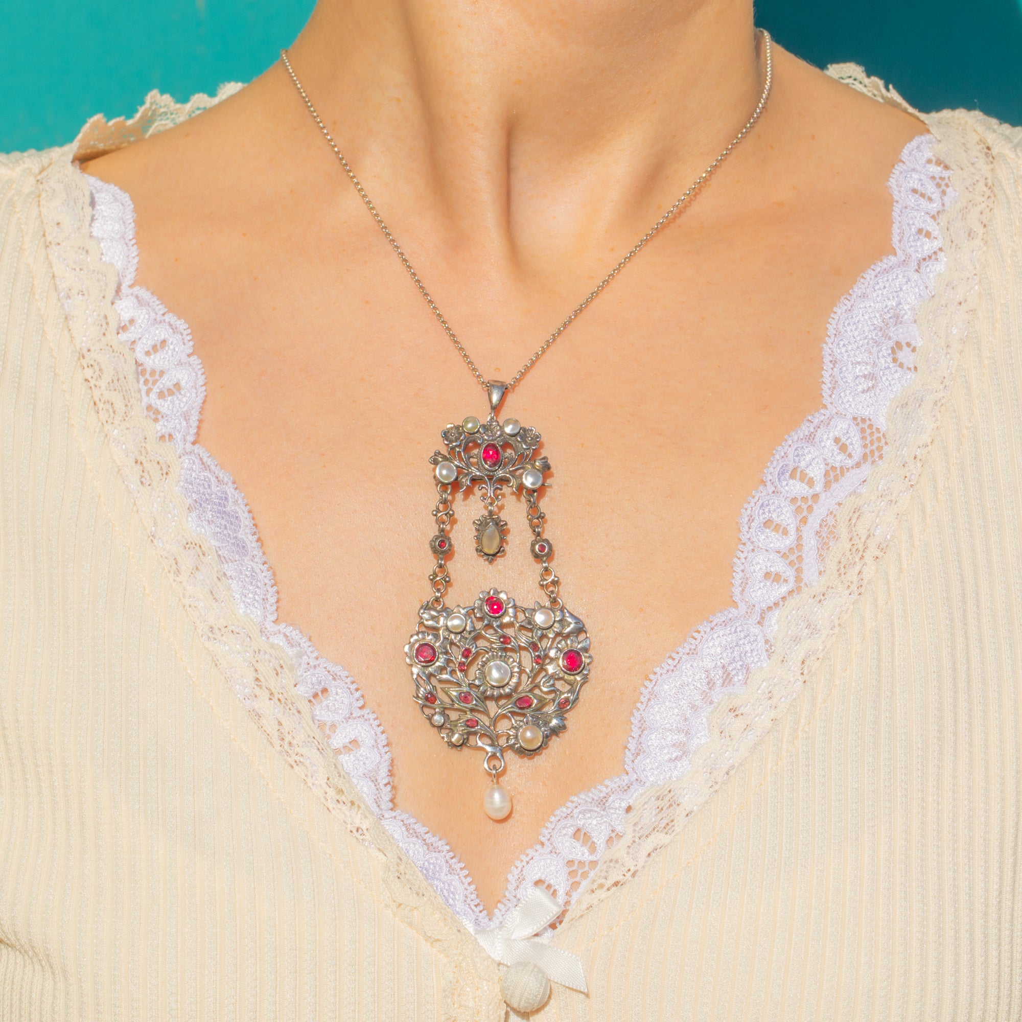 Opulent and romantic, this Austro-Hungarian Silver pendant-brooch lavalier showcases a symphony of foliate openwork, floral rosettes and articulated drops, richly accented by bright red Garnets, lustrous Mother of Pearl and a creamy teardrop Pearl. The beautifully wrought, multi-part construction moves gracefully, while the girandole-style layout draws the eye to the glowing Pearl drop below.