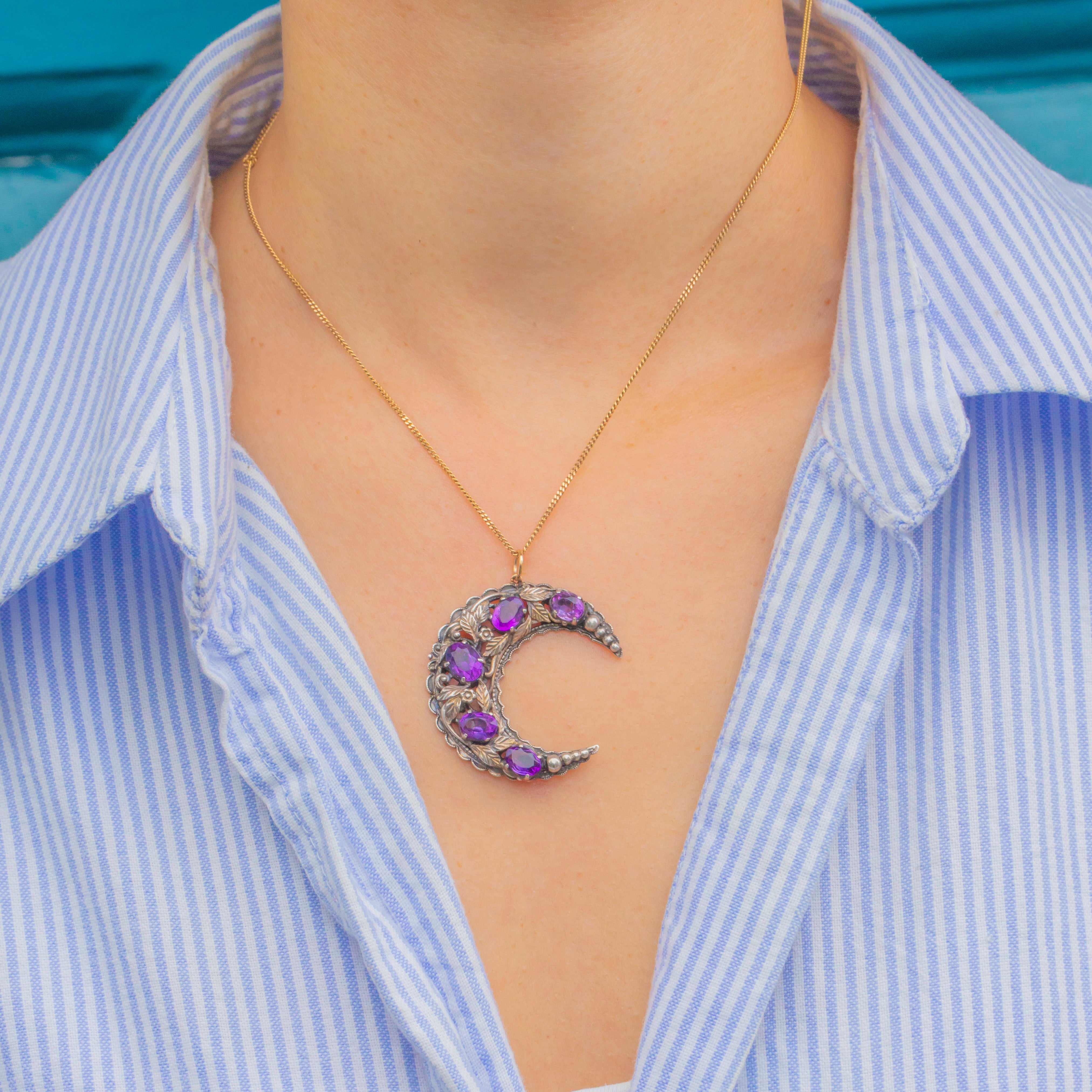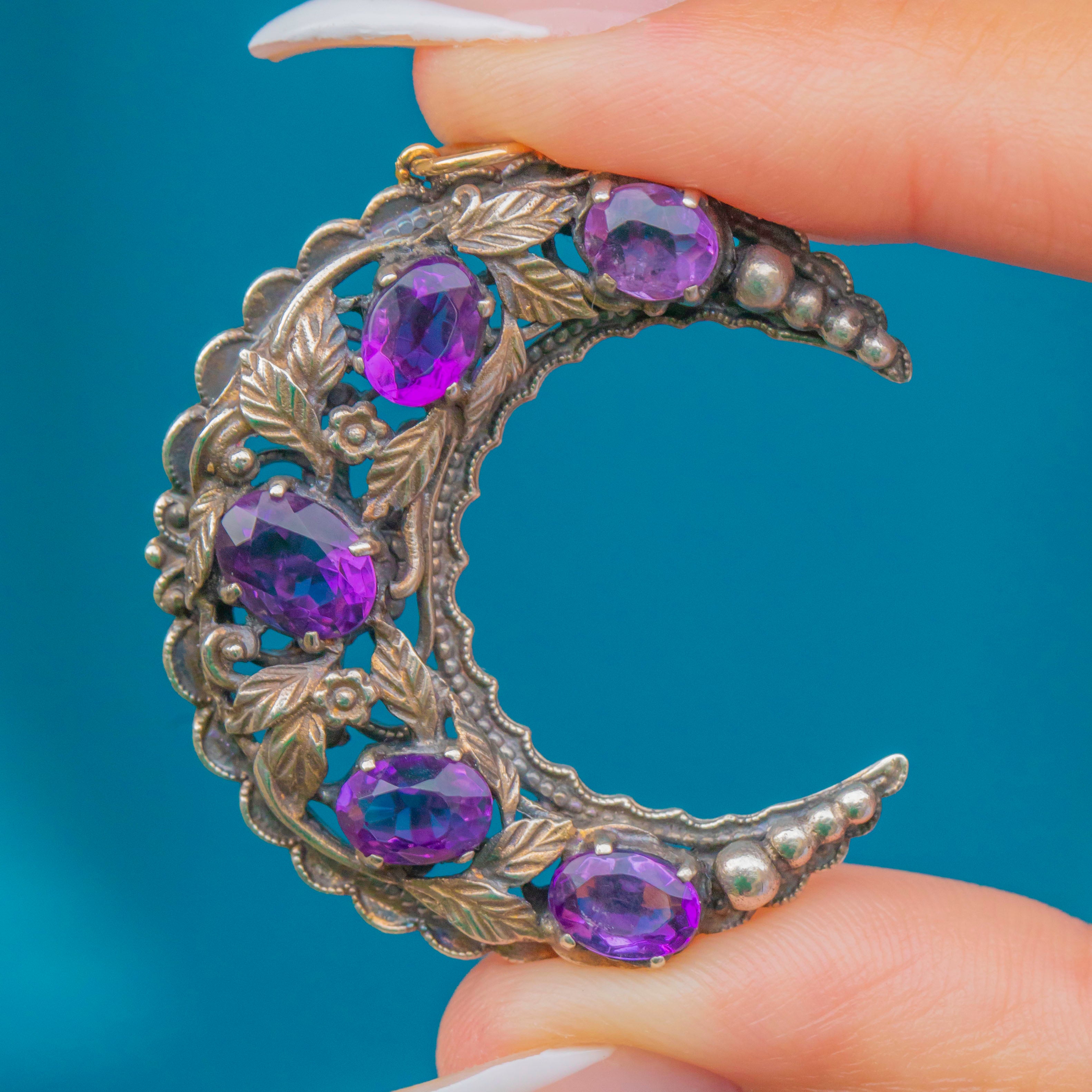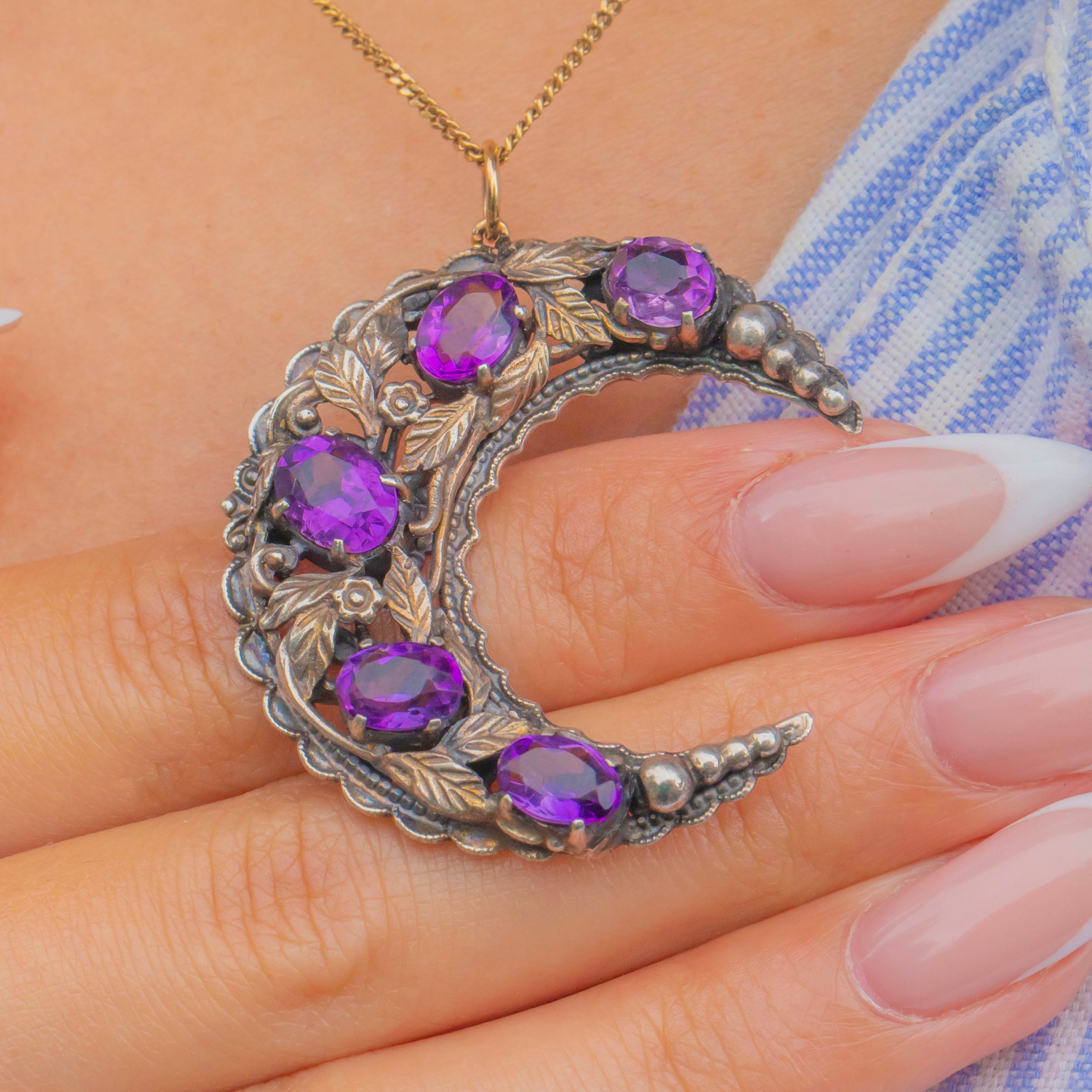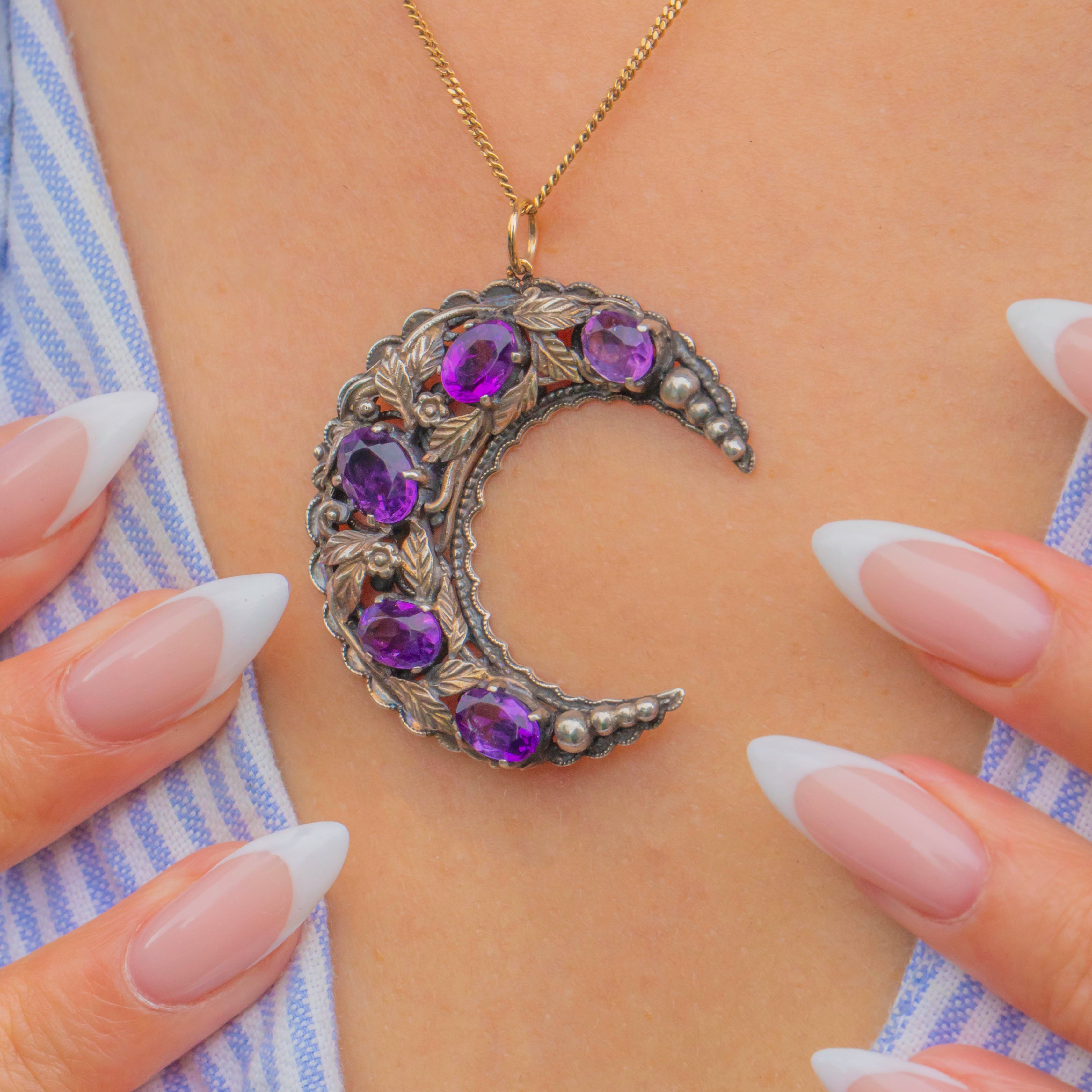 A striking crescent-moon pendant attributed to Bernard Instone, crafted in Sterling Silver with a filigree back and finished with a 9ct Gold jump ring. Five “grape” Amethysts glow across the arc among chased leaves and bead accents—pure Instone: romantic Arts & Crafts sensibility made for everyday wear.