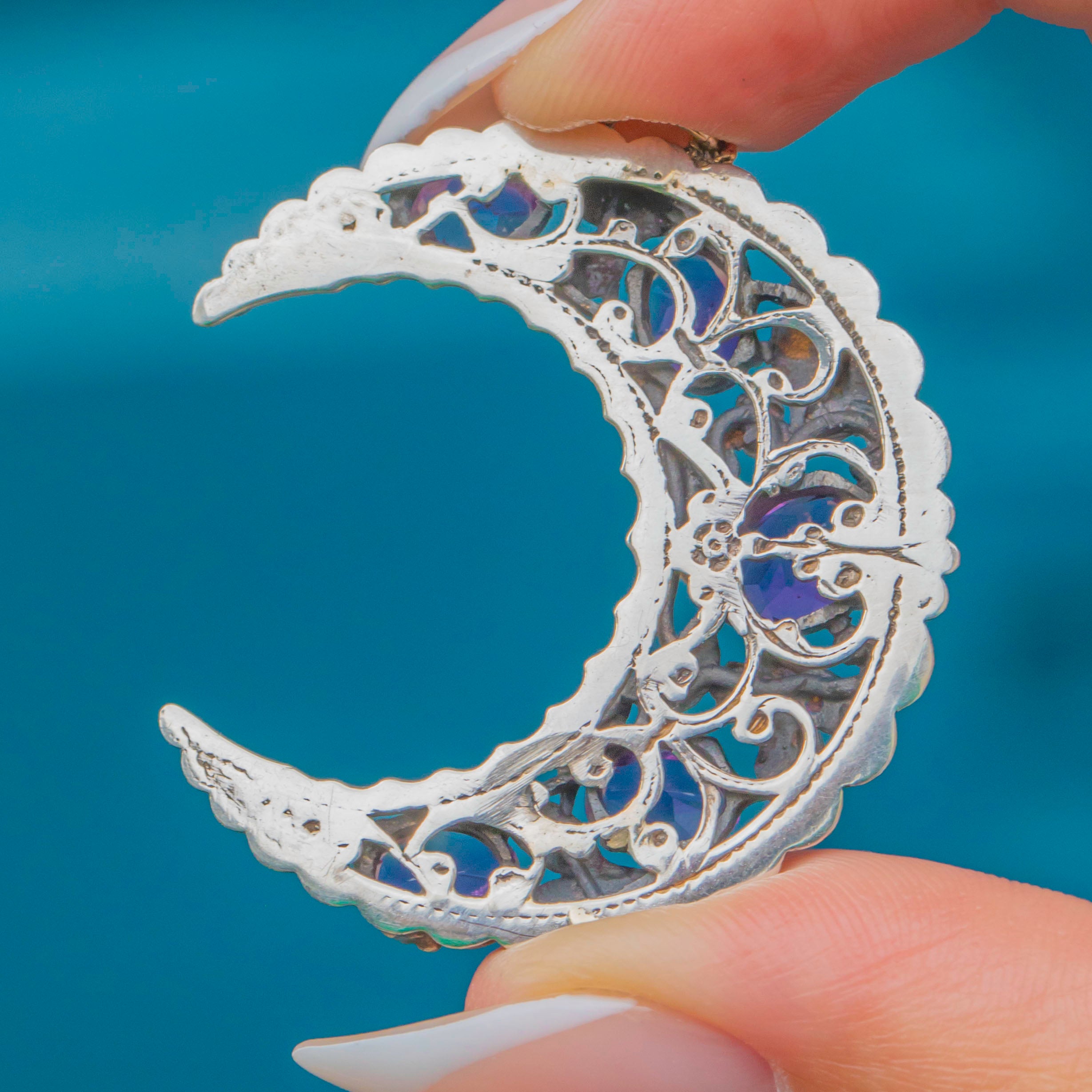The openwork back keeps the scale generous without weight, and the saturated purples play brilliantly against the softly patinated Silver.