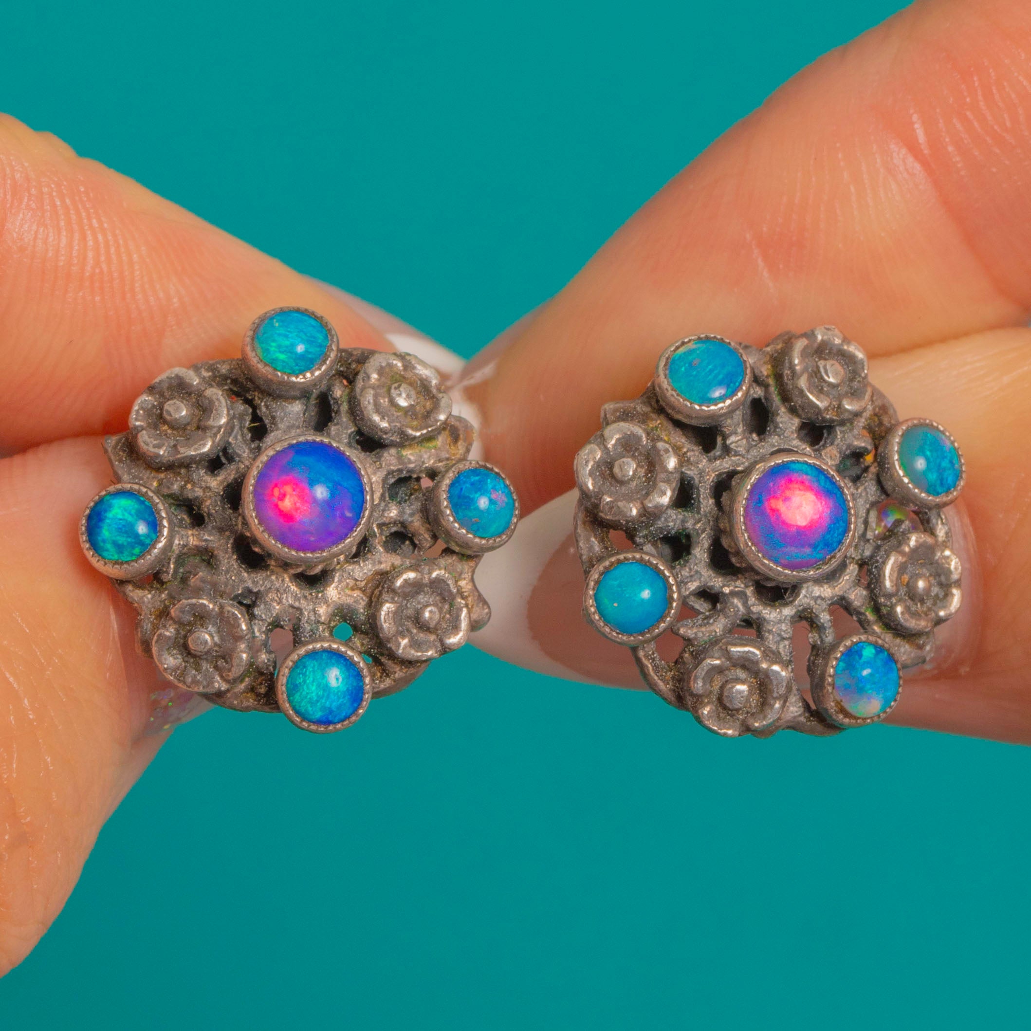 EXCELLENT: The cabochons are bright and well-set with no obvious chips or cracks, showing lovely iridescence. The Silver displays an even, age-appropriate patina with only light surface wear. Clip mechanisms are intact and function well, with no visible repairs.