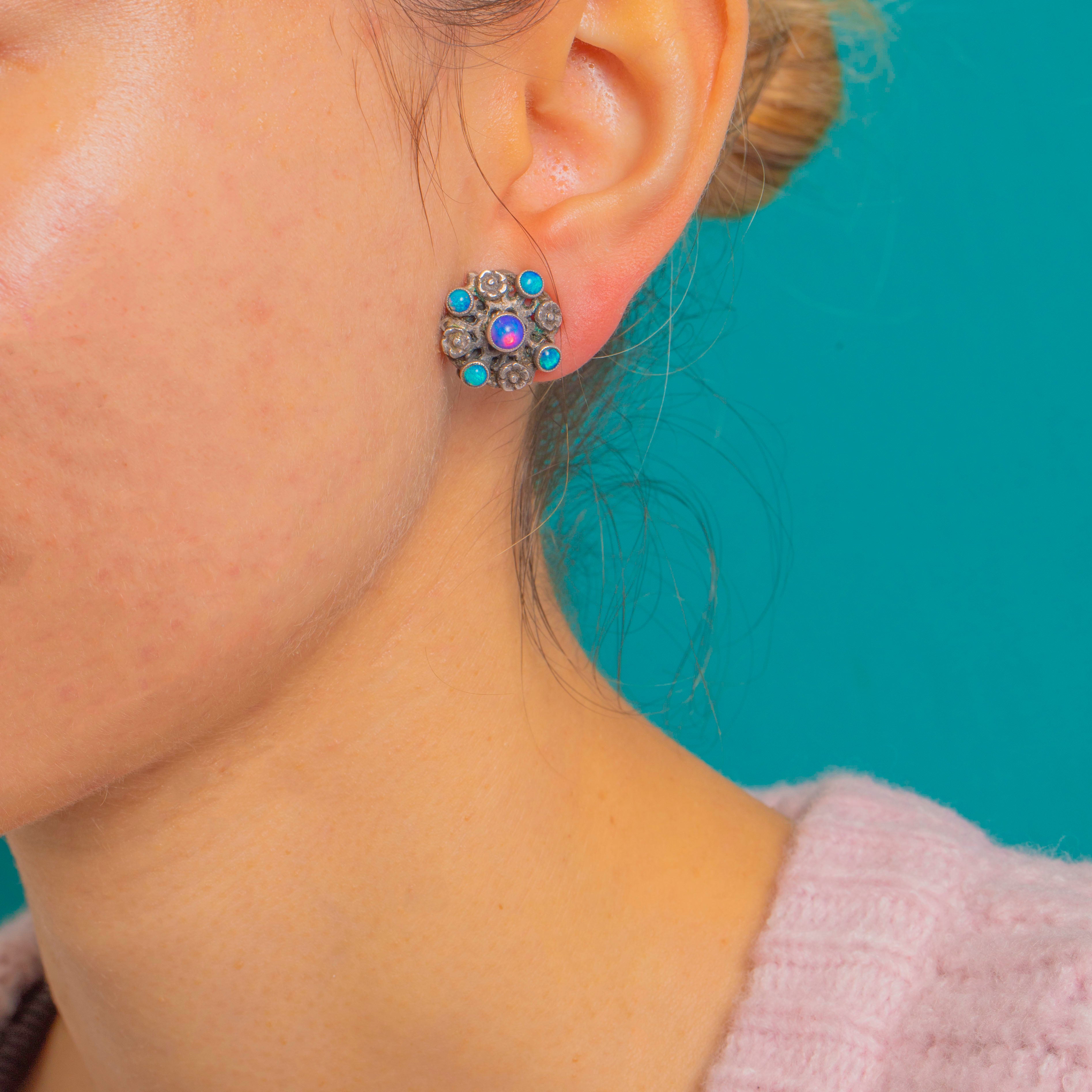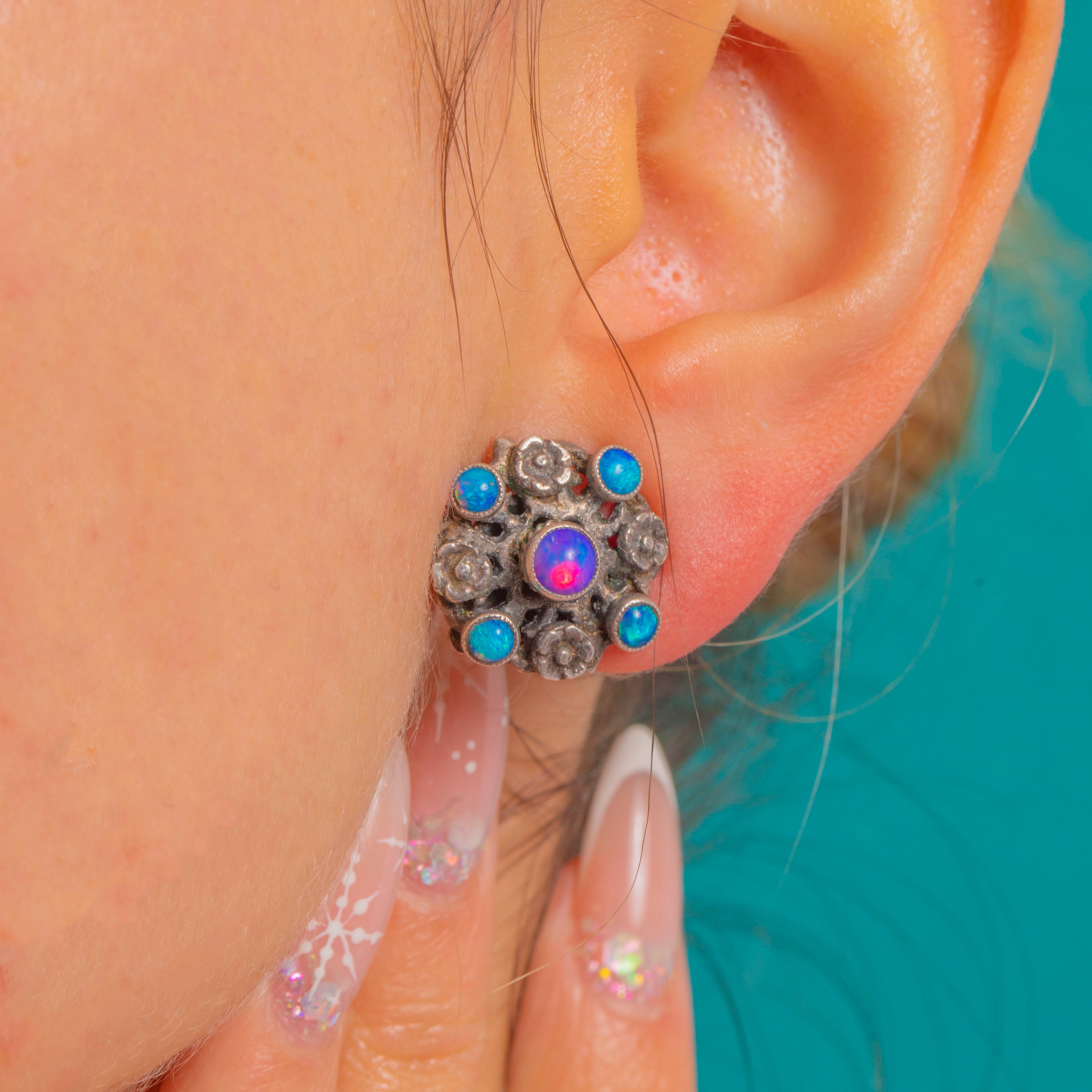 The centre cabochon shimmers with blue tones and flashes of pink-red, enhanced by the Silver's moody patina. Elegant yet playful, they deliver that coveted Austro-Hungarian flair in a compact, easy-to-wear silhouette.