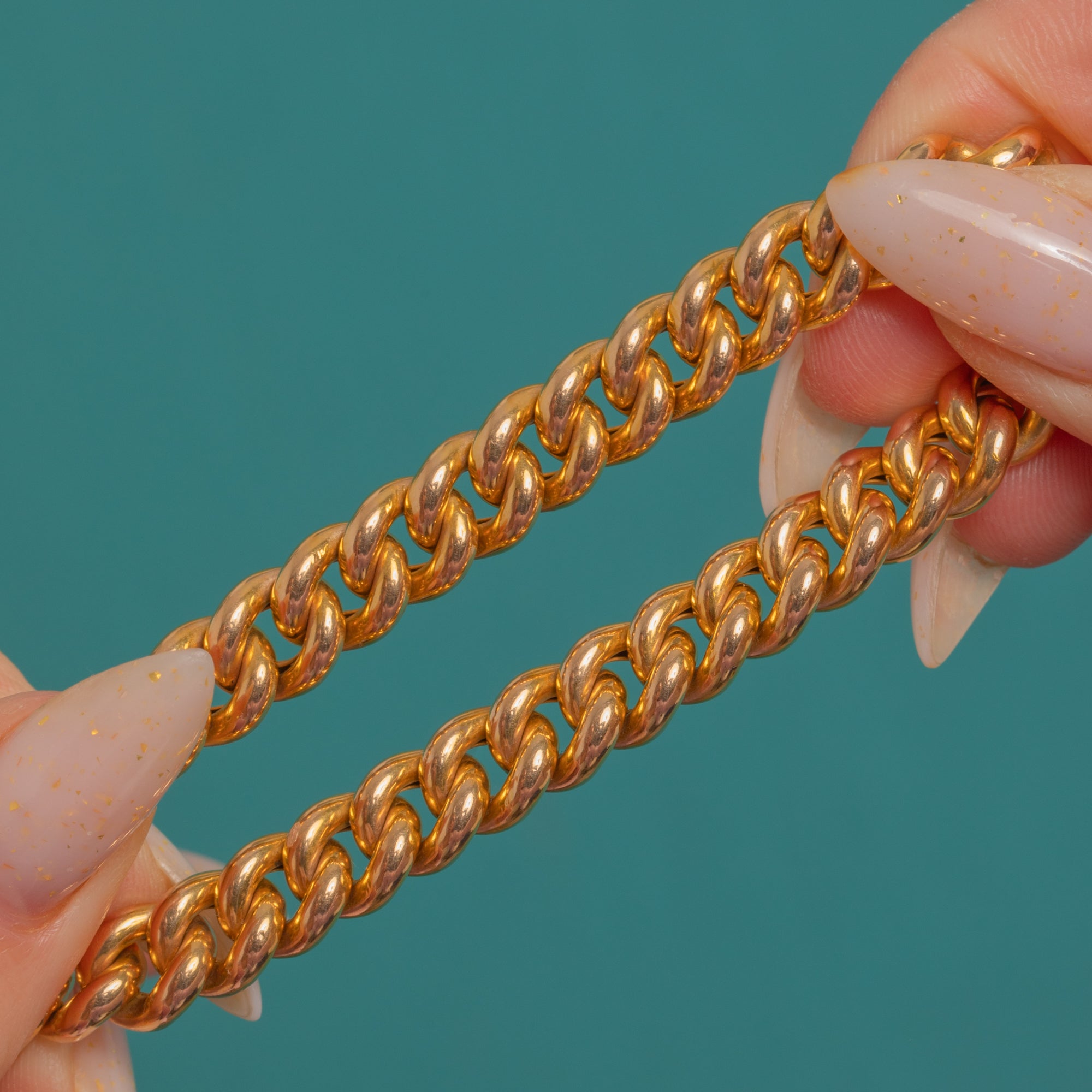 VERY GOOD: Bright polish with light surface wear and fine hairline scratches to the Gold commensurate with age. Links are well-formed and the heart padlock clasp and hinge align and function well; the safety chain is intact.