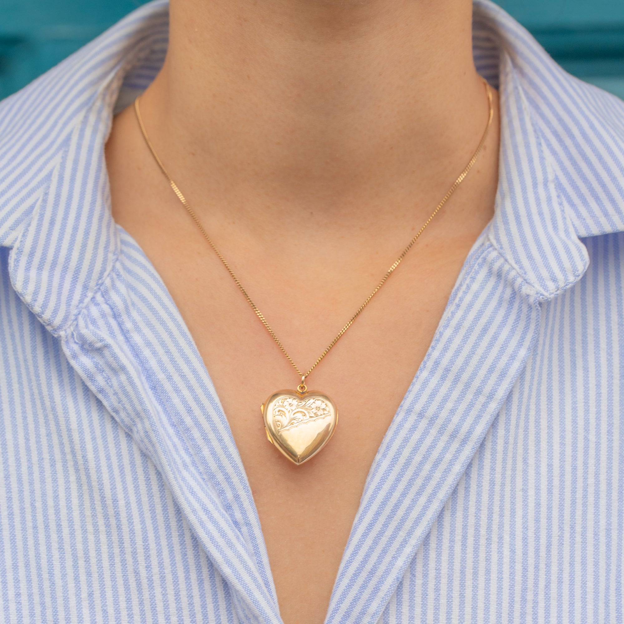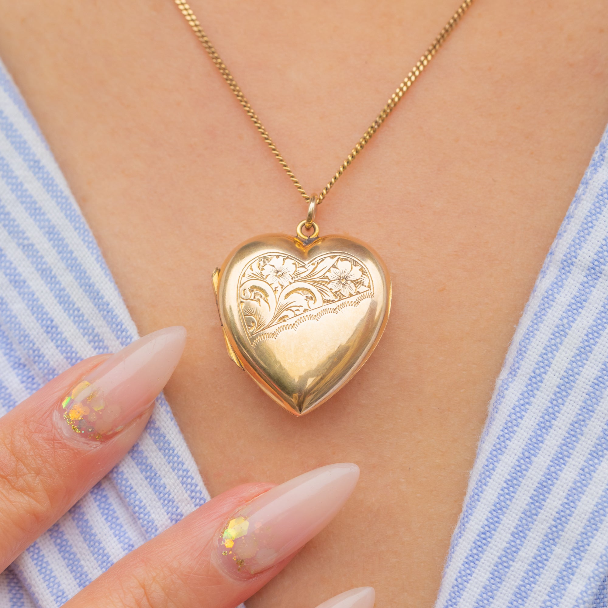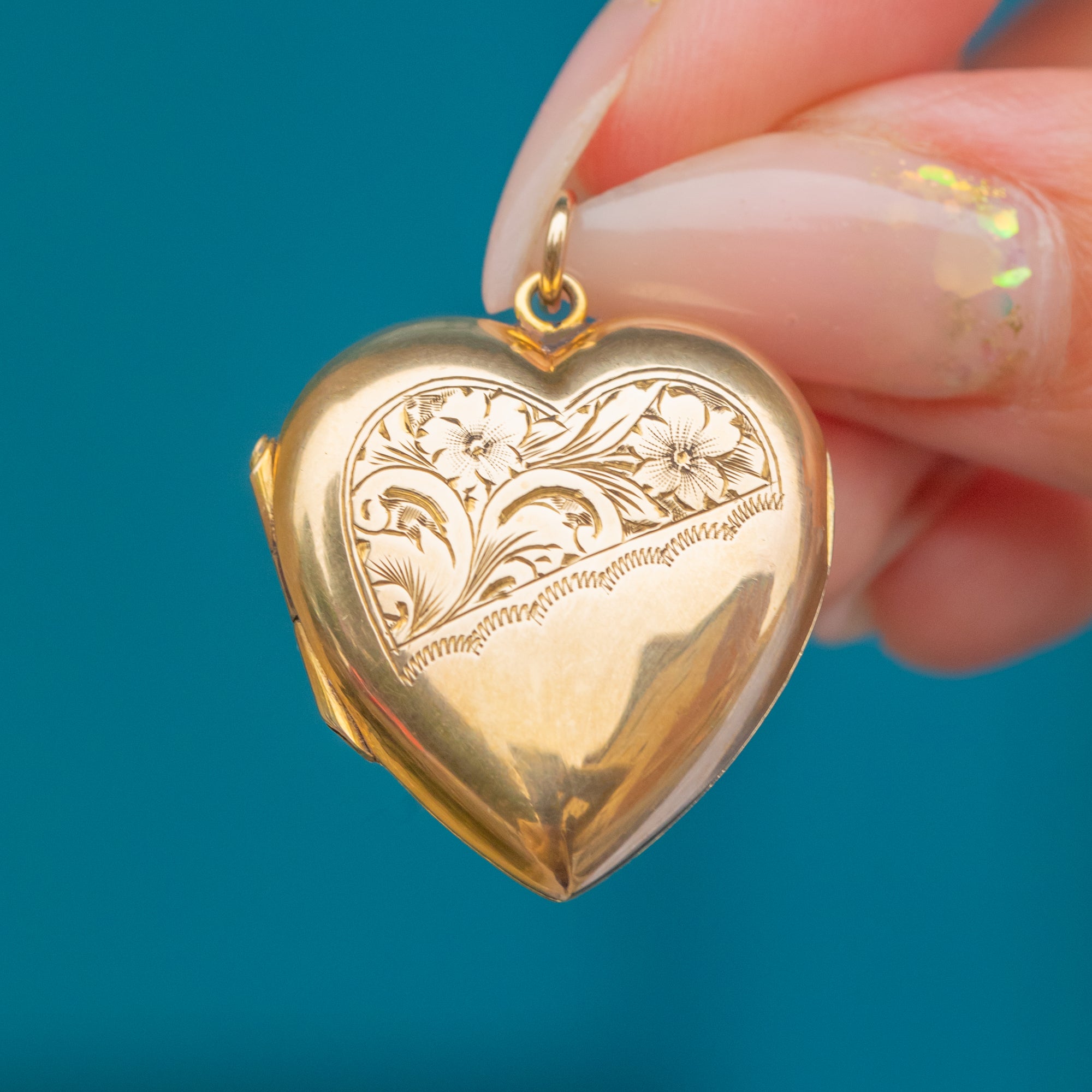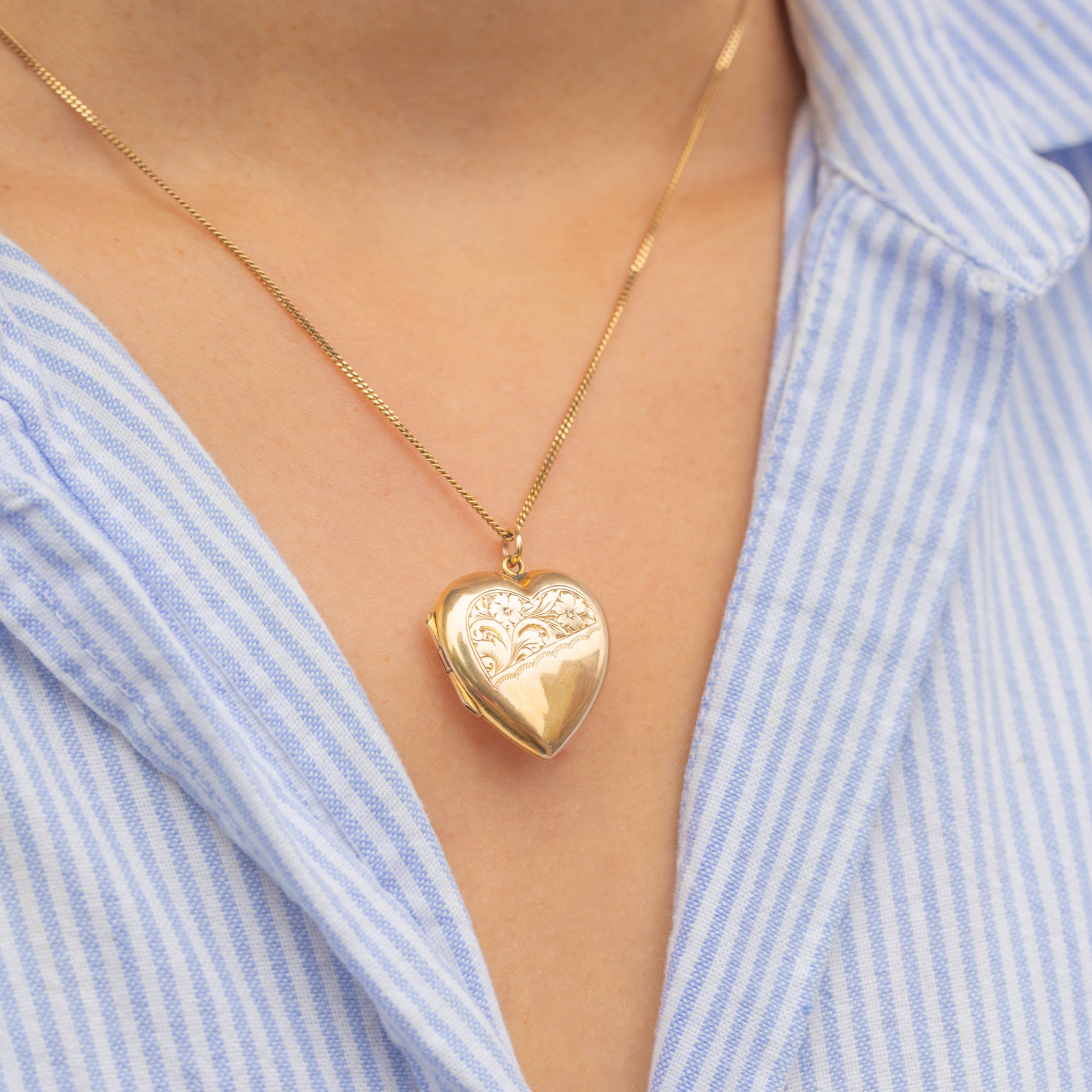 This antique Edwardian locket has a bold, puffy profile that gleams in bright yellow 9ct Gold. The diagonal design is particularly eye-catching, with one half plain polished and the other half hand-engraved with elegant scrolls and flowers.