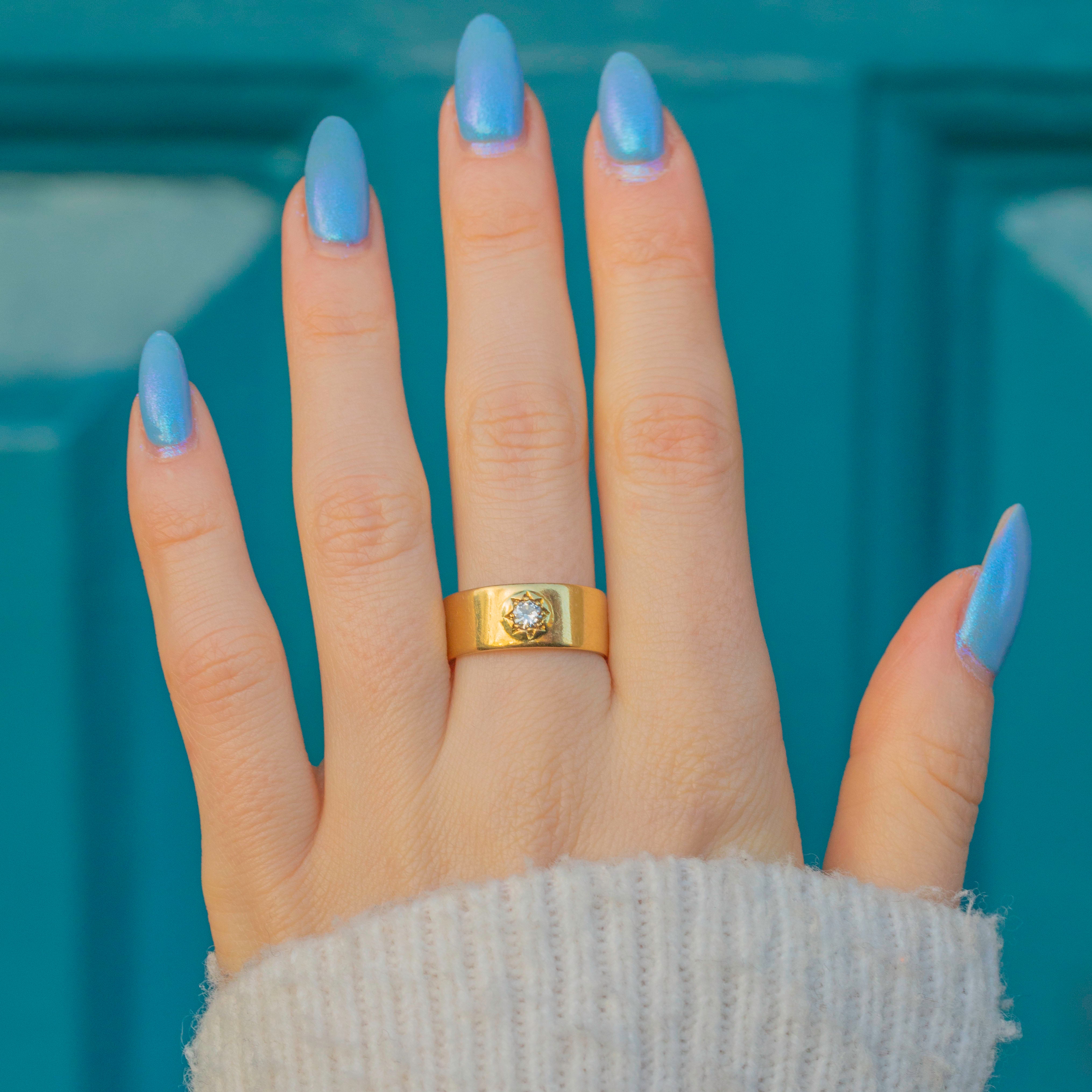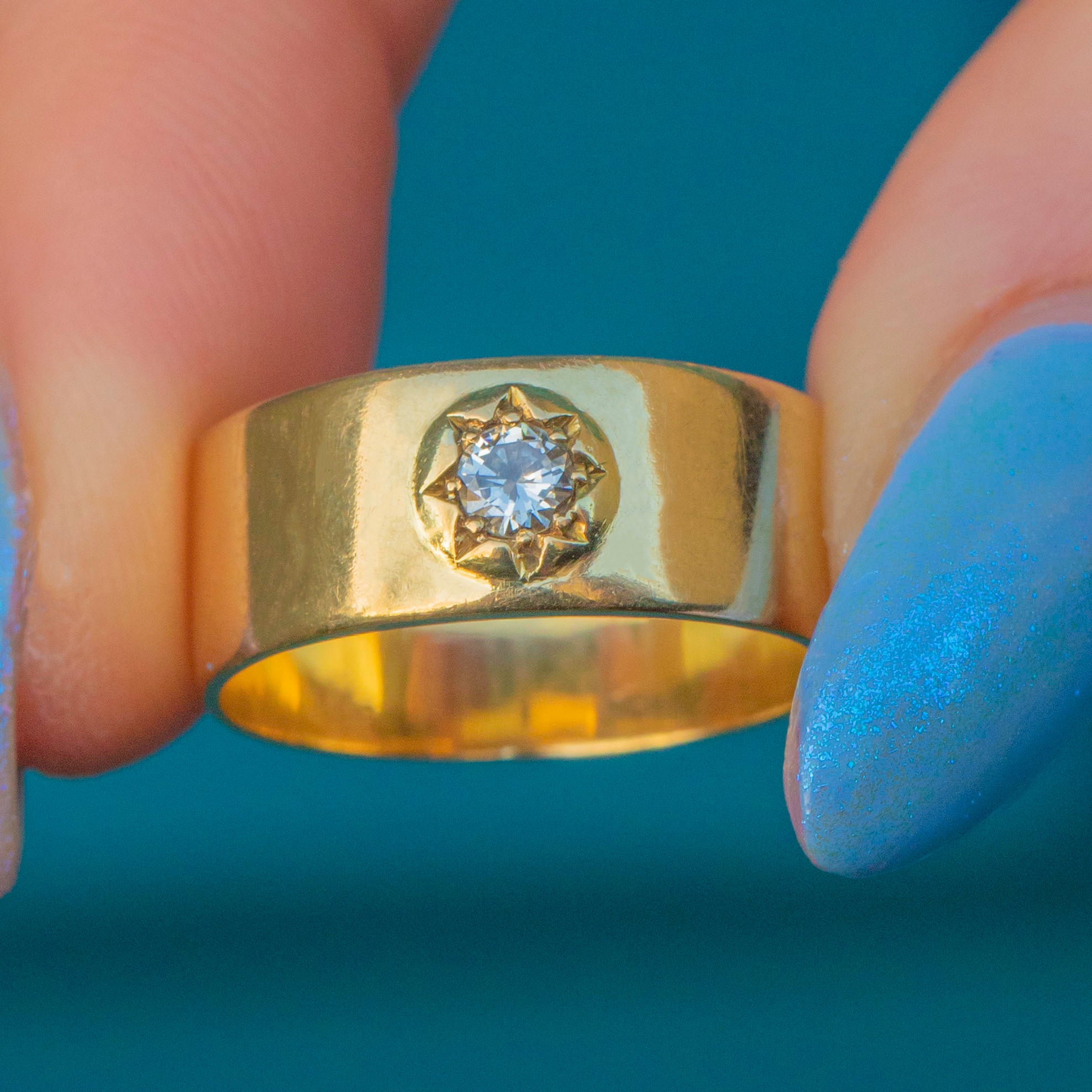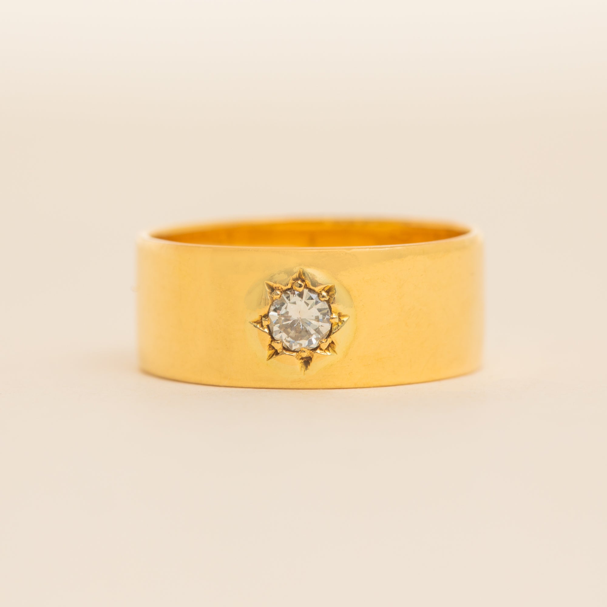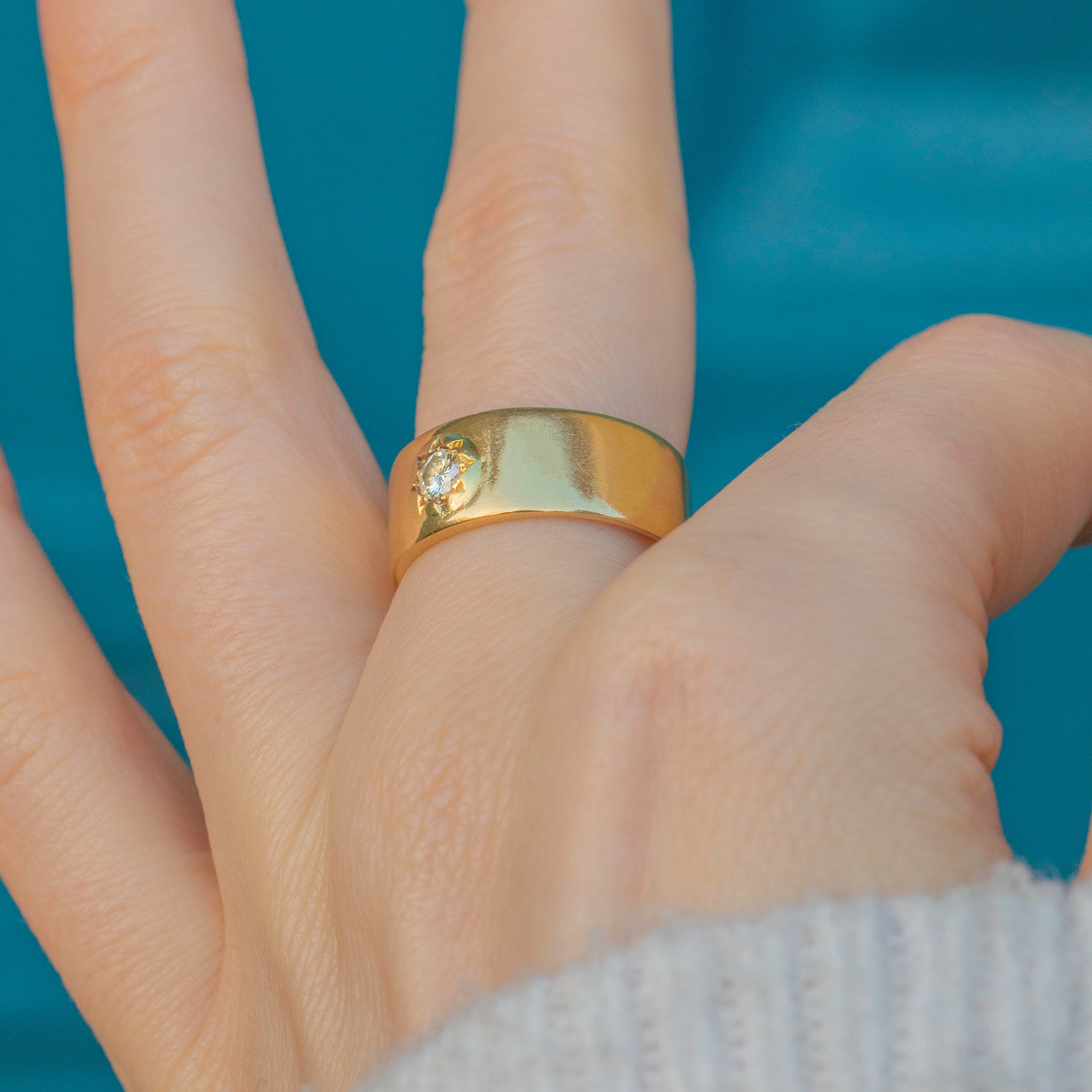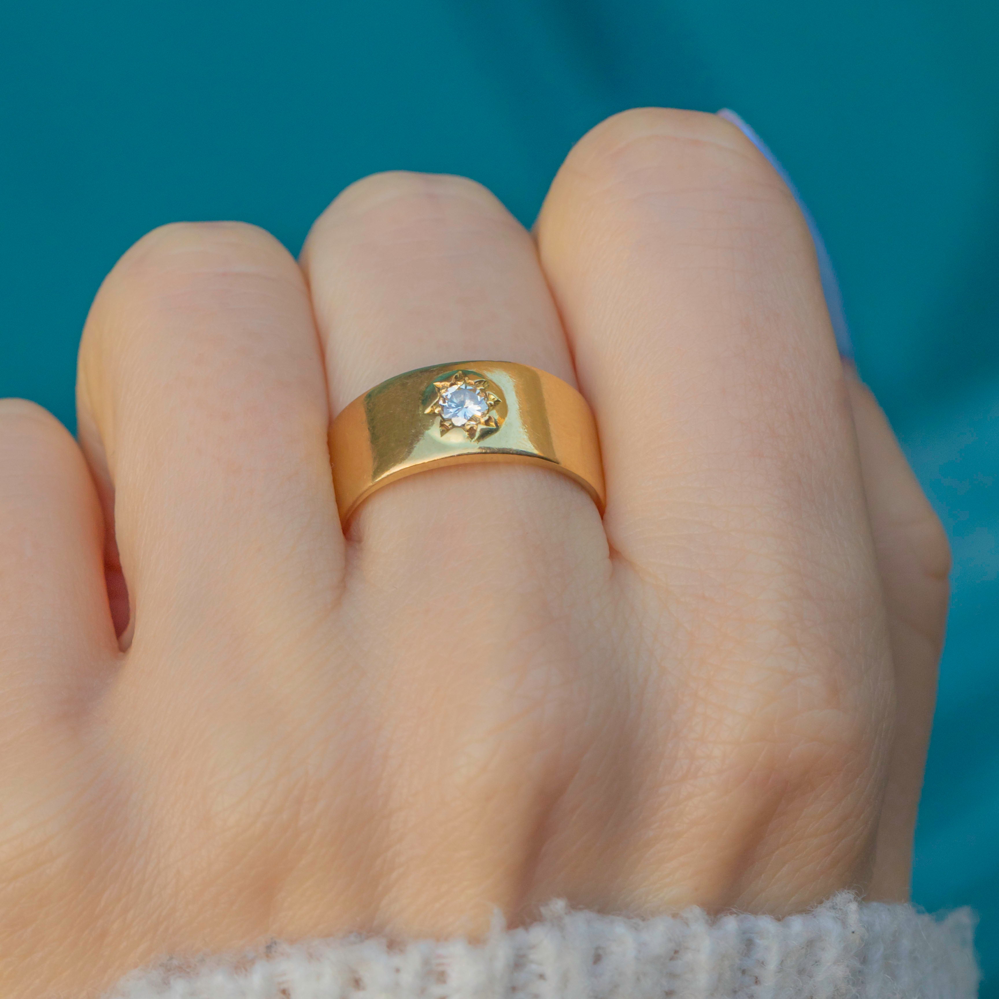EXCELLENT. This chunky 18ct Gold star-set ring is in excellent condition. Her Gold has a lovely saturation and is free from any visible signs of wear. A natural Diamond is set securely within her star setting, allowing for confident and comfortable wear. With little else to note, she is a must-have wardrobe staple!