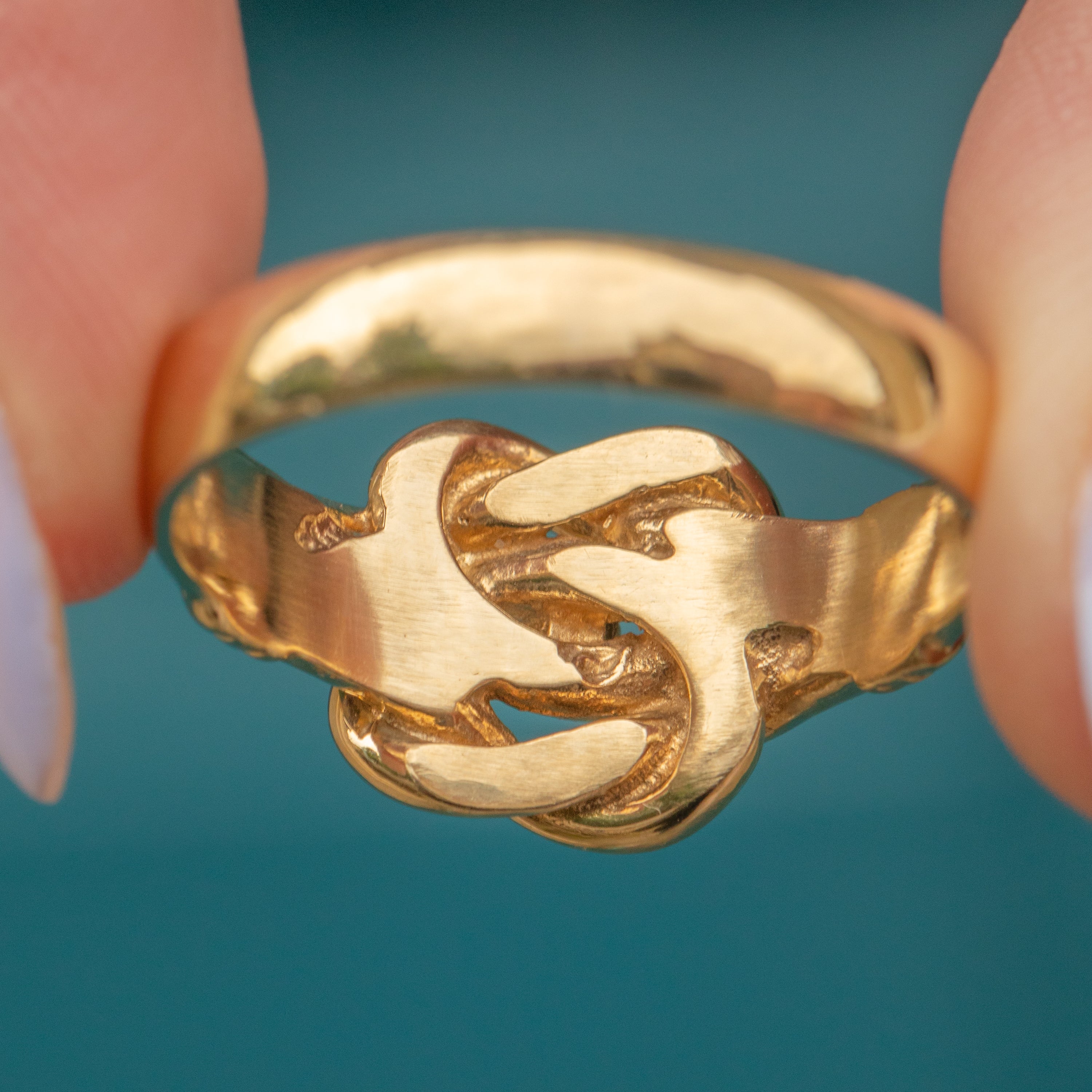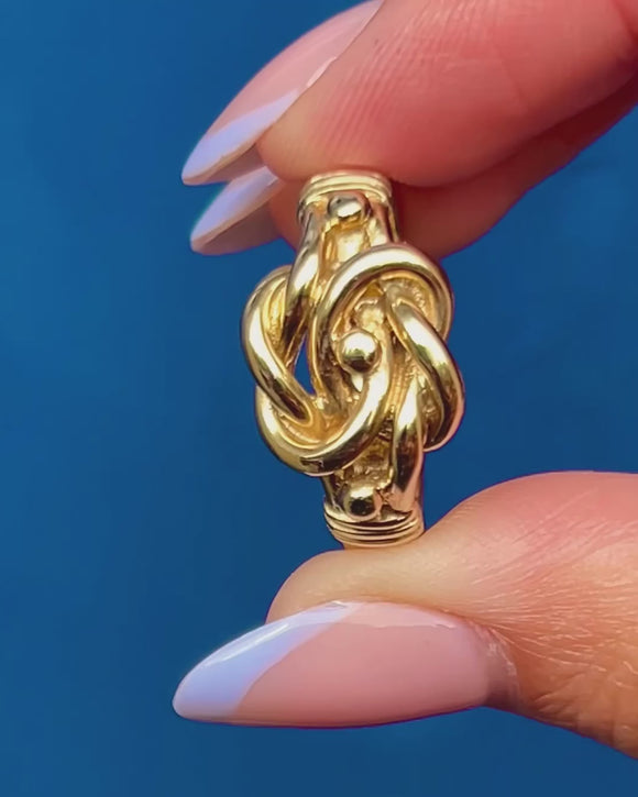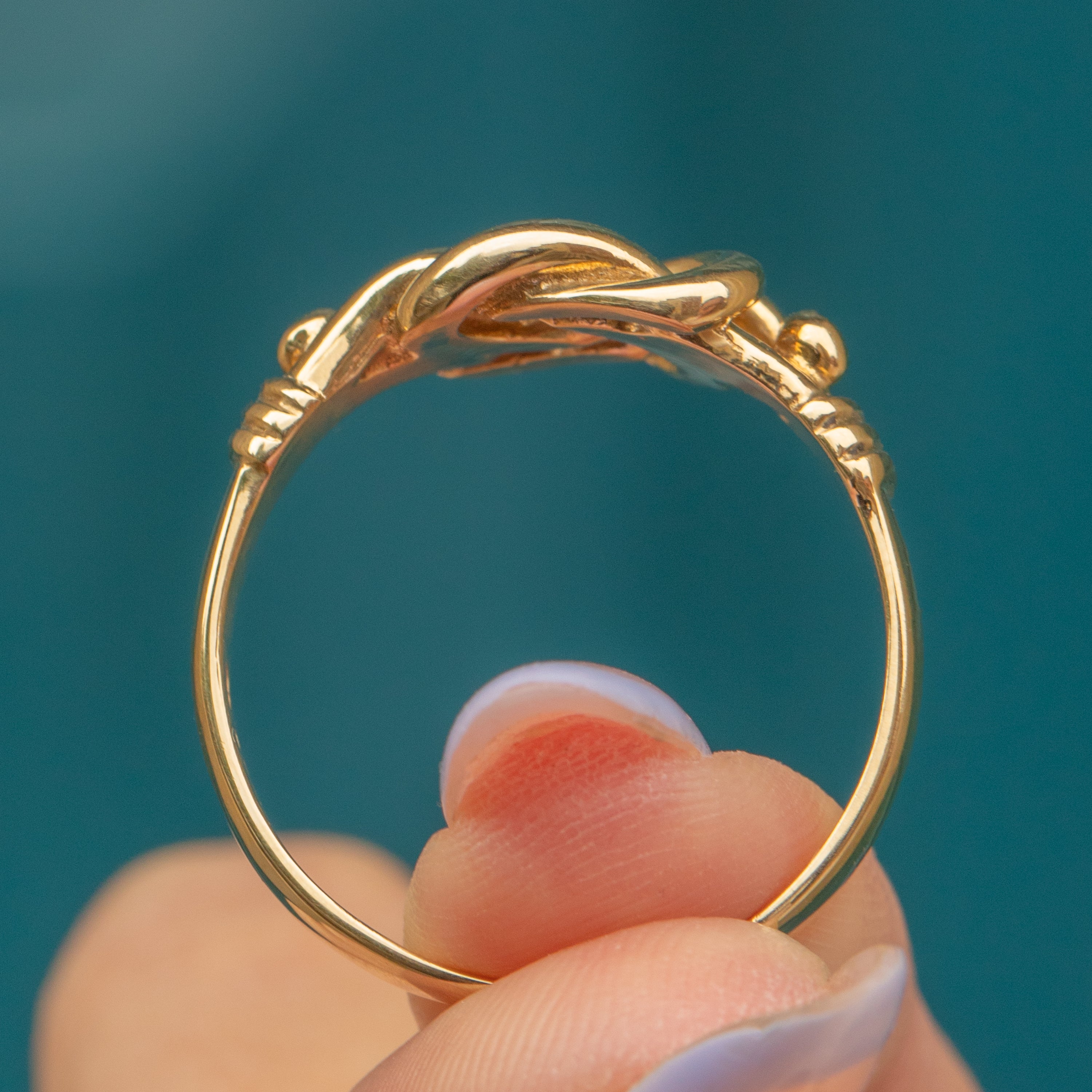 This chunky 9ct Gold lover's knot ring is a gorgeous glossy piece, with a robust and ornately formed design bringing texture and luxury to your hand! The lover's knot is symbolic of an unbreakable bond between two people, making this vintage ring the perfect love token.