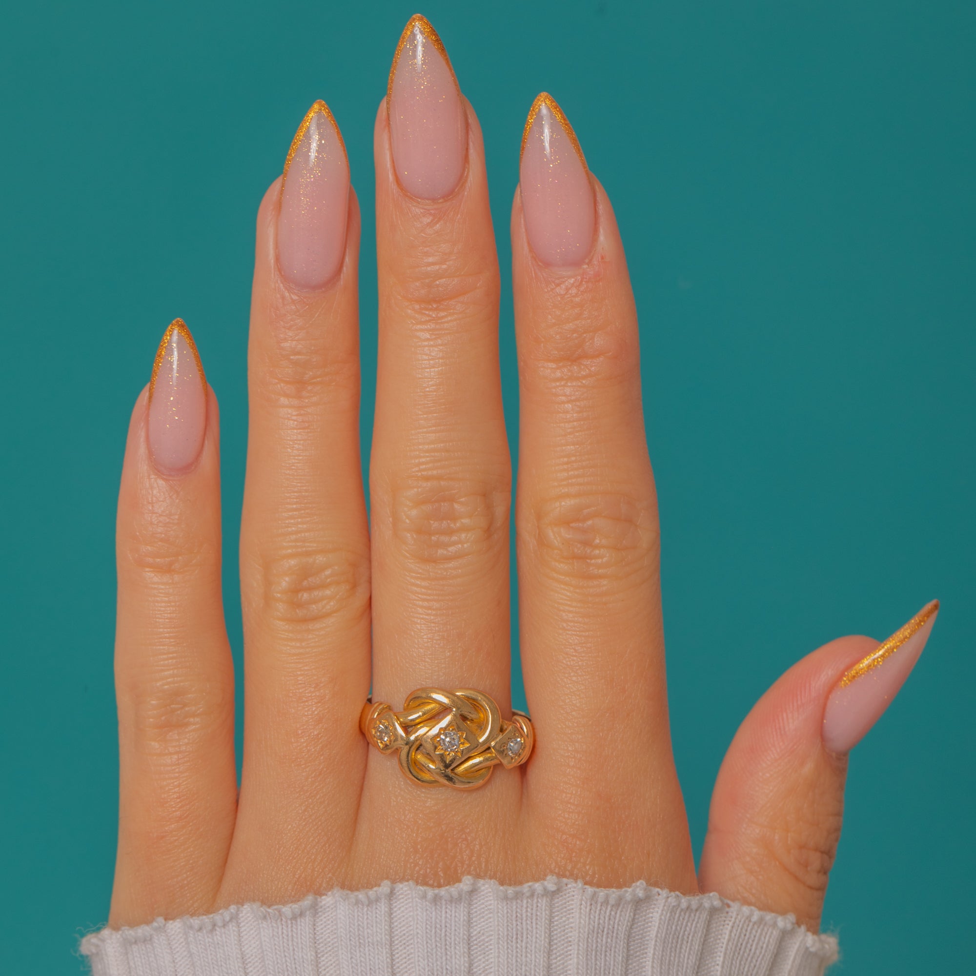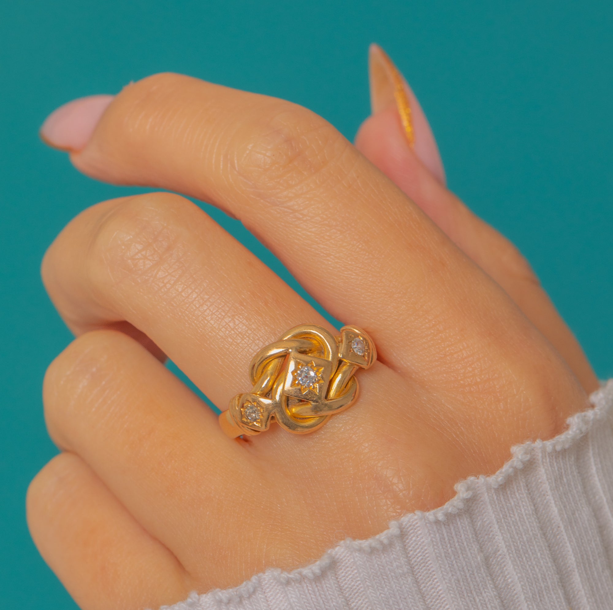 This bold and romantic antique knot ring is crafted in solid 18ct Gold and set with sparkling antique Diamonds. The intricate knot motif, a symbol of eternal love and unity, wraps elegantly around the finger, showcasing a central Old Mine Cut Diamond framed by two twinkling single-cut accents.