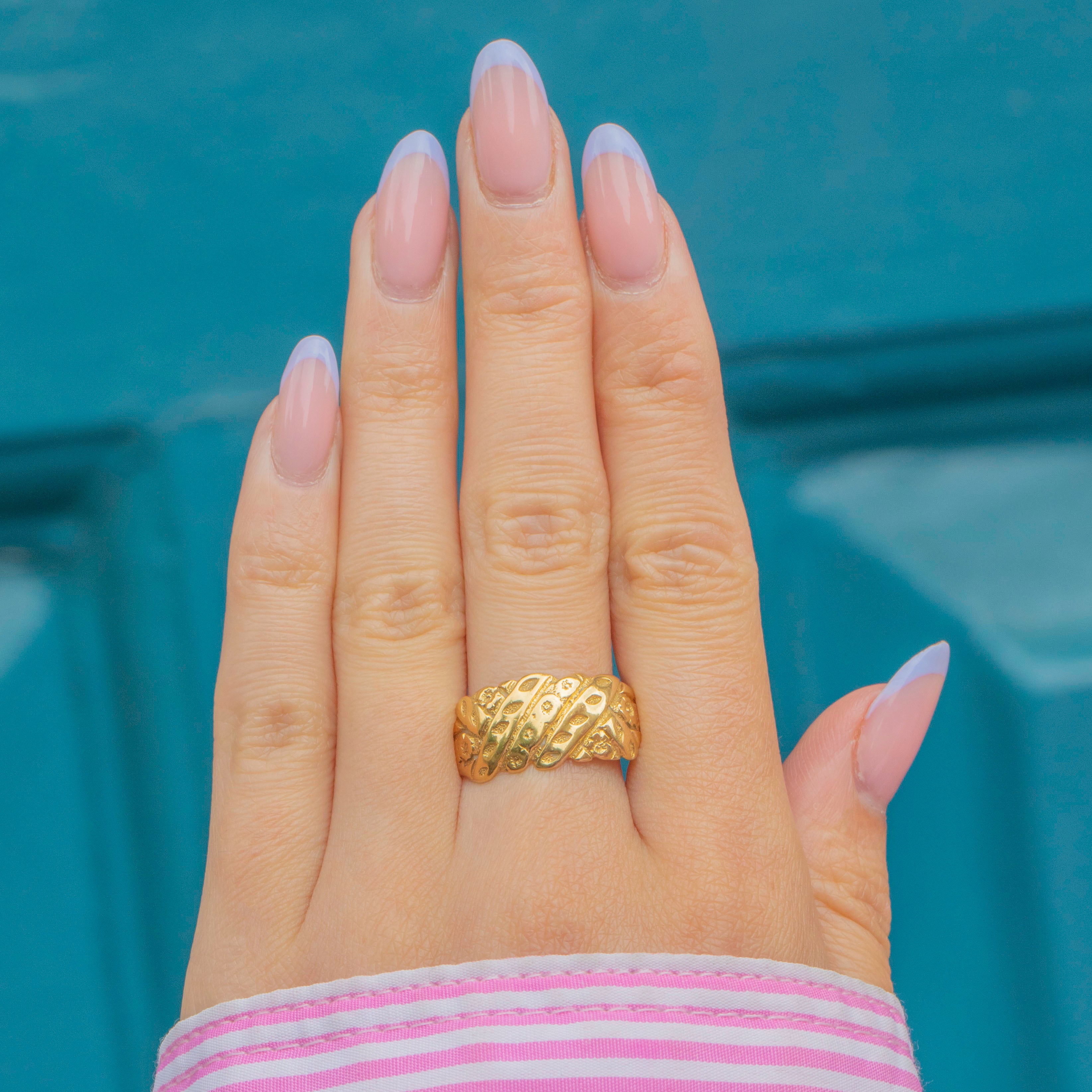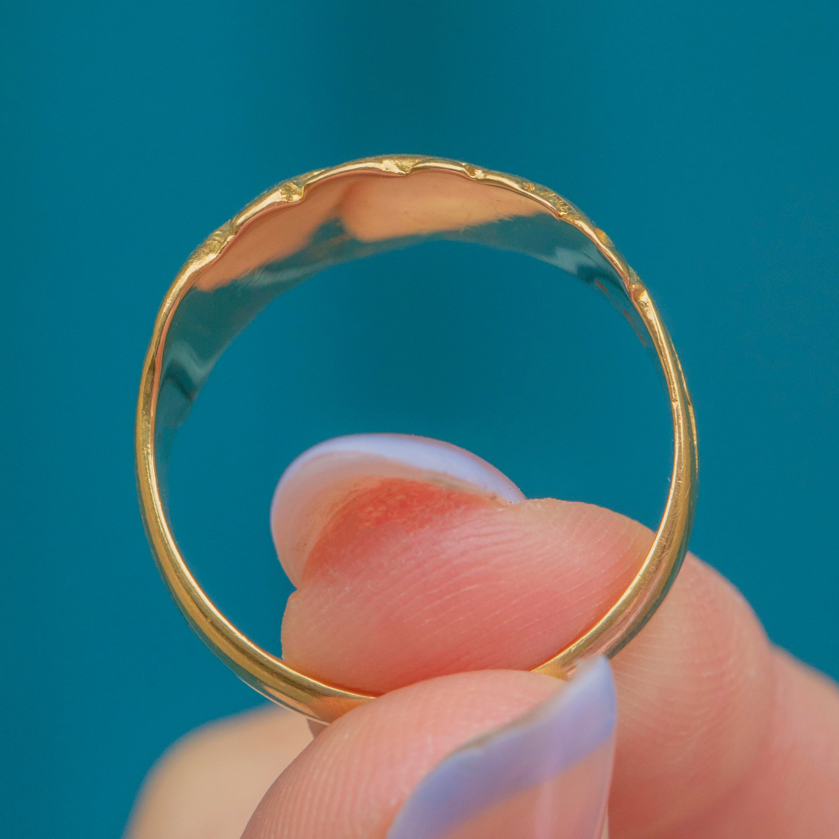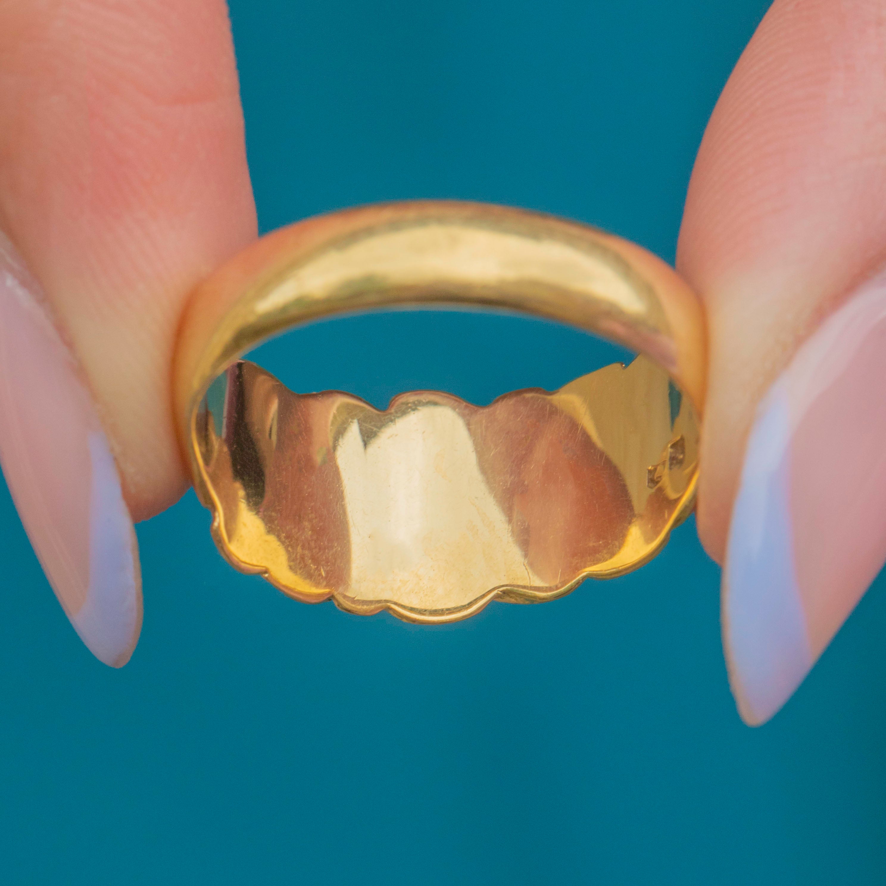 Fully hallmarked and dated to 1918, this early twentieth century ring will bring a golden presence to your ring stack, with her low profile making her an easy everyday piece. With a glossy inner band, this engraved ring glides onto your hand a dream!