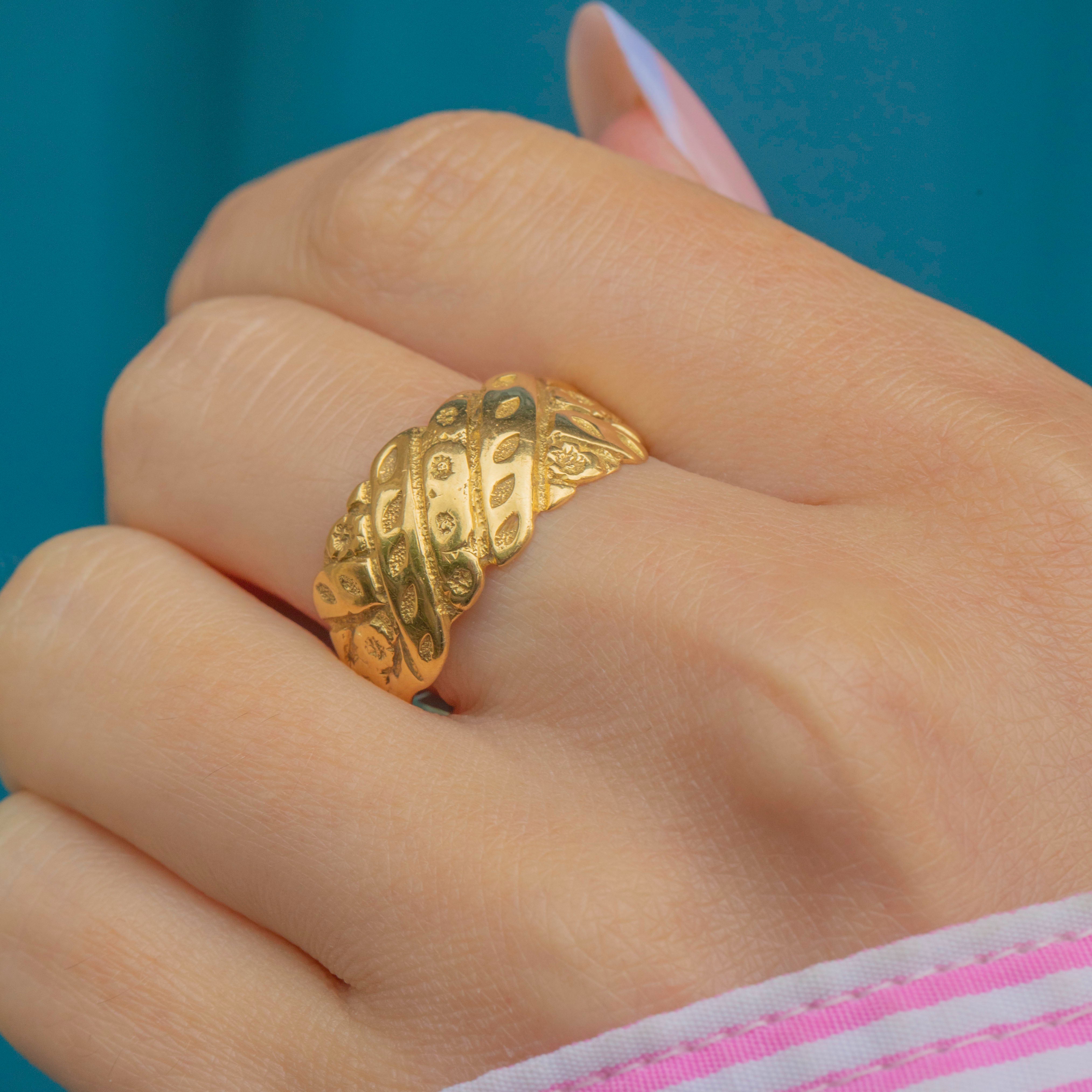 This chunky antique 18ct Gold engraved flower ring is a decadent delight! Crafted entirely from honey hued 18ct Gold, she is adorned with an array of floral engravings, providing a lovely texture and depth to this glossy ring.