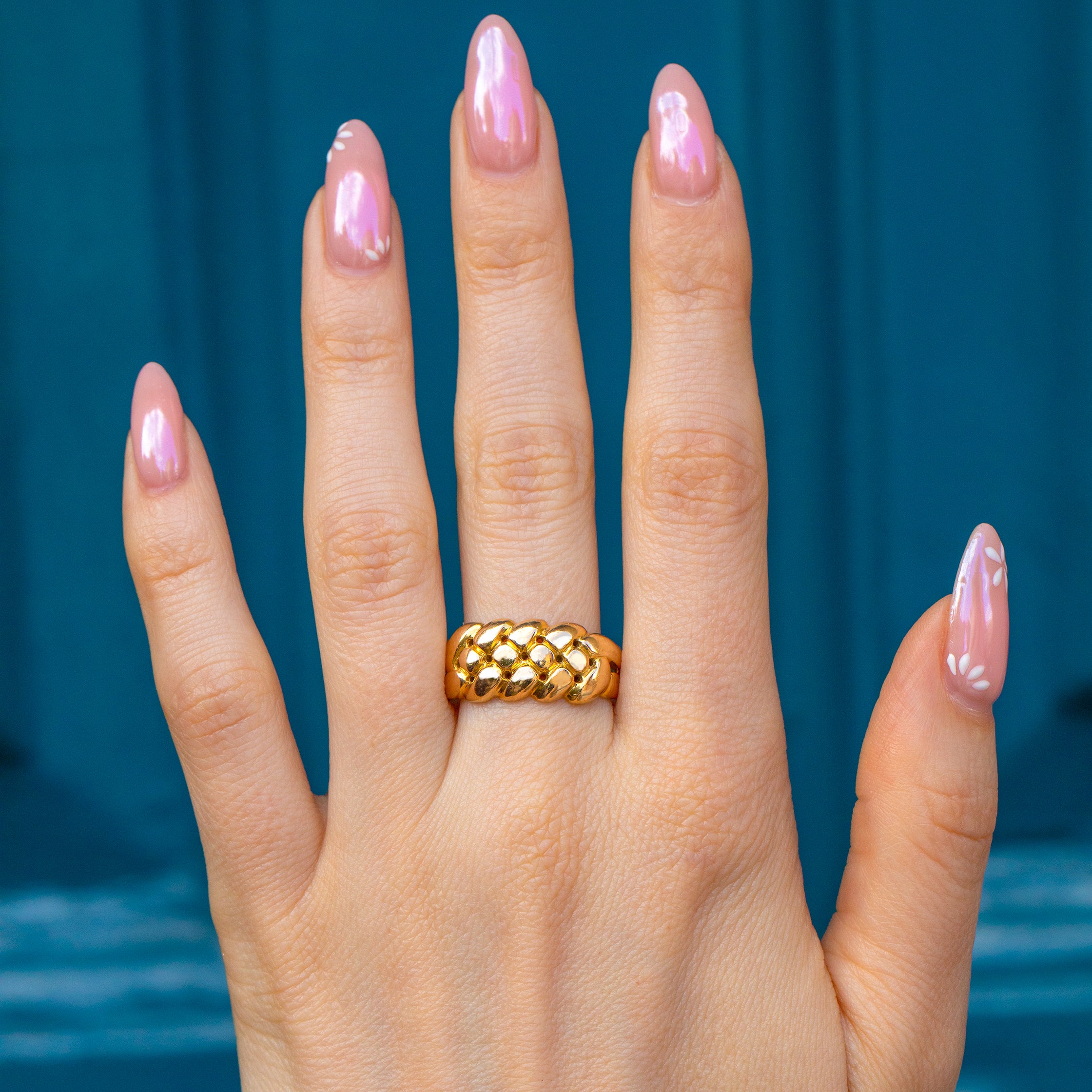 Wow, just look at this incredible chunky antique 18ct Gold keeper ring! Crafted entirely from richly saturated 18ct Gold forming her intricate knotted rows with pierced detailing, she's an eye-catching piece and perfect for daily wear.