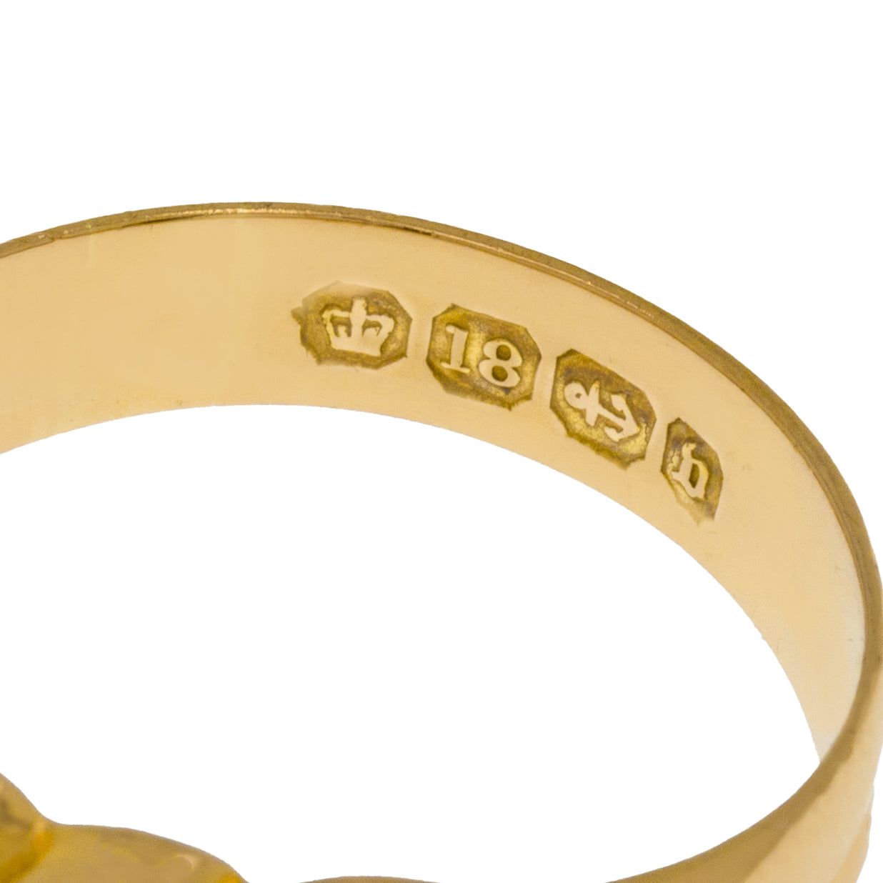 EXCELLENT. This chunky antique 18ct Gold keeper ring is in absolutely wonderful condition throughout! Her 18ct Gold is buttery and sleek to the touch, and her smooth band makes for comfortable wear. The knotted detailing looks superb, providing great finger coverage. With a full set of hallmarks allowing us to accurately date her to 1895, this Victorian Gold band is a wonderful investment piece!