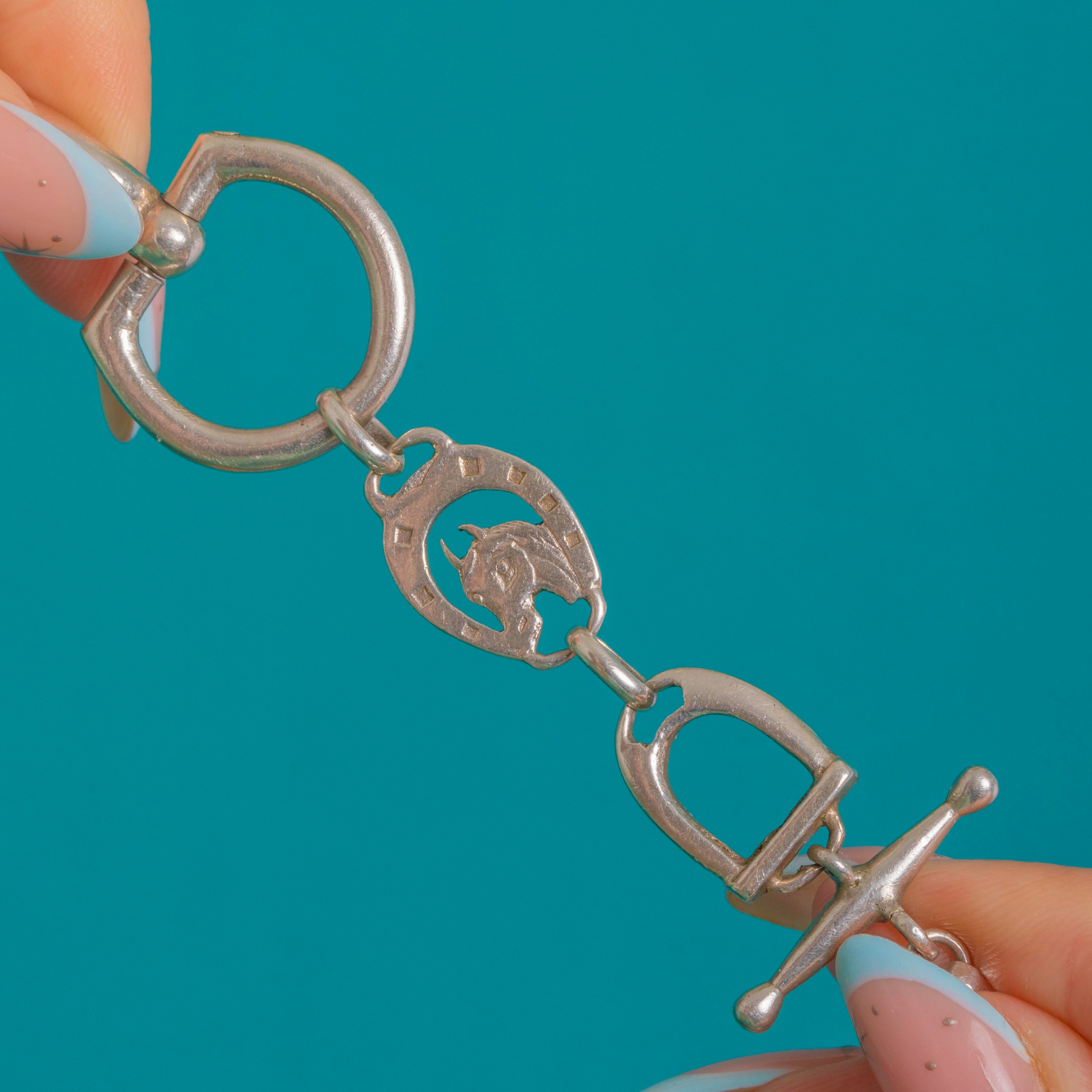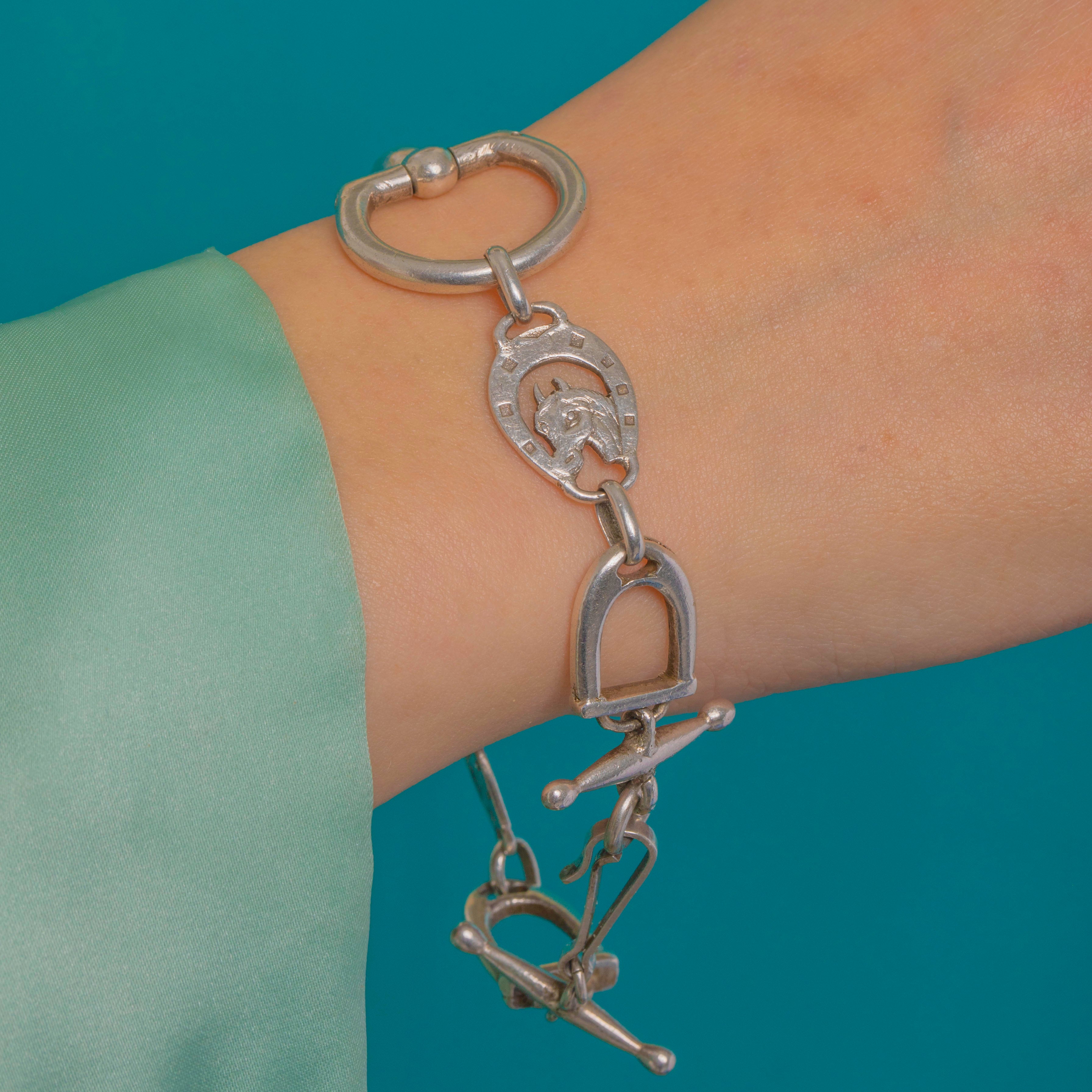 Celebrate equestrian chic with this chunky Vintage Sterling Silver bracelet, sculpted in a striking parade of horseshoe-and-horse head plaques, stirrups, and snaffle‑bit links. The bold, articulated design flows around the wrist with graphic clarity and a pleasing, weighty feel.