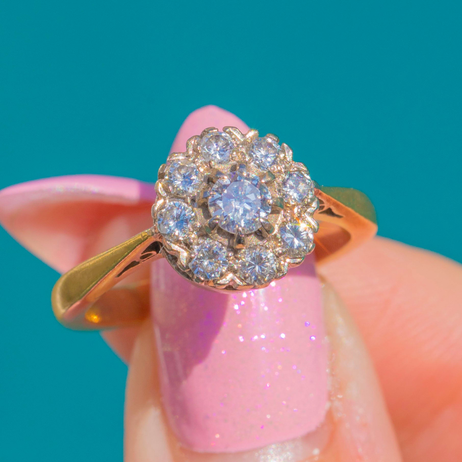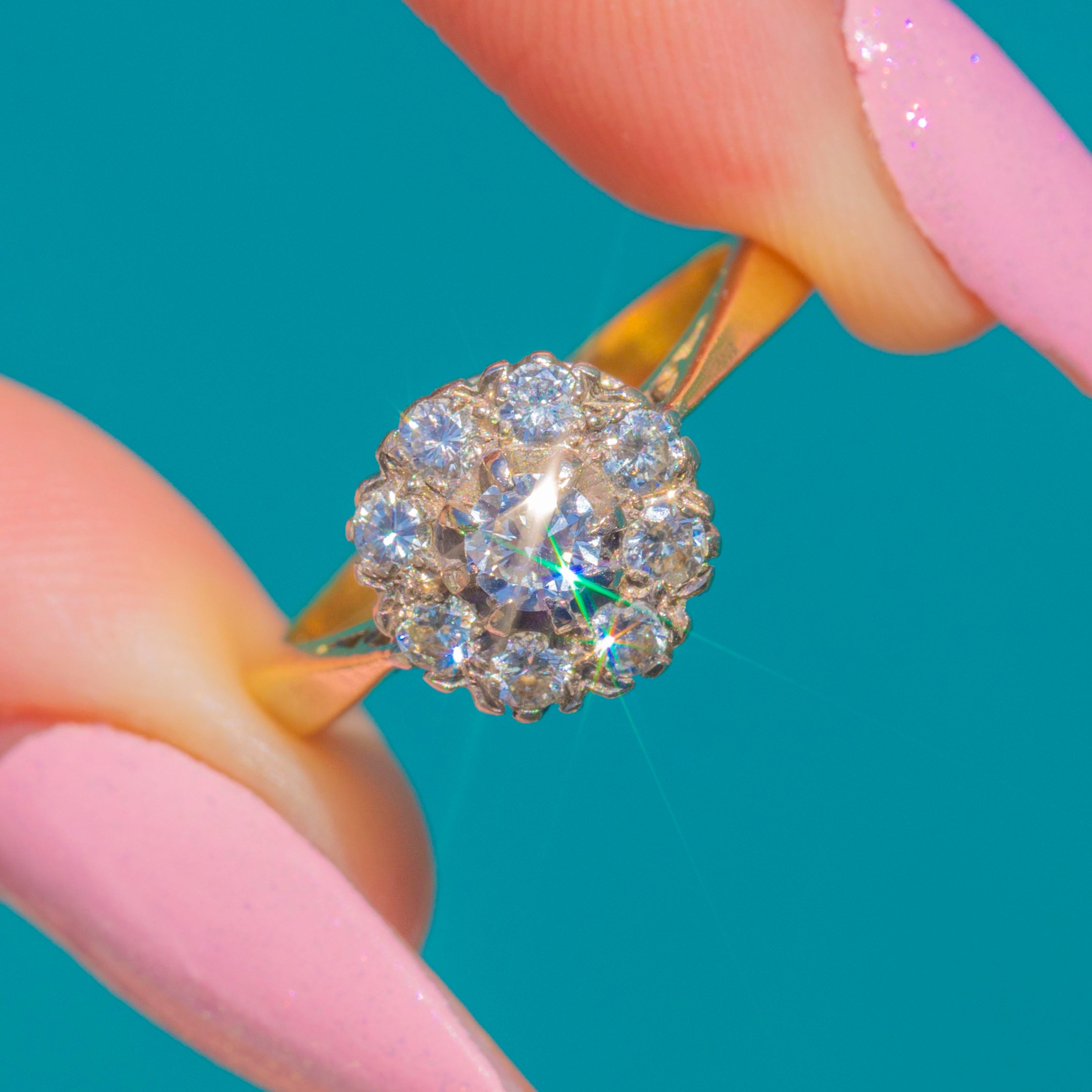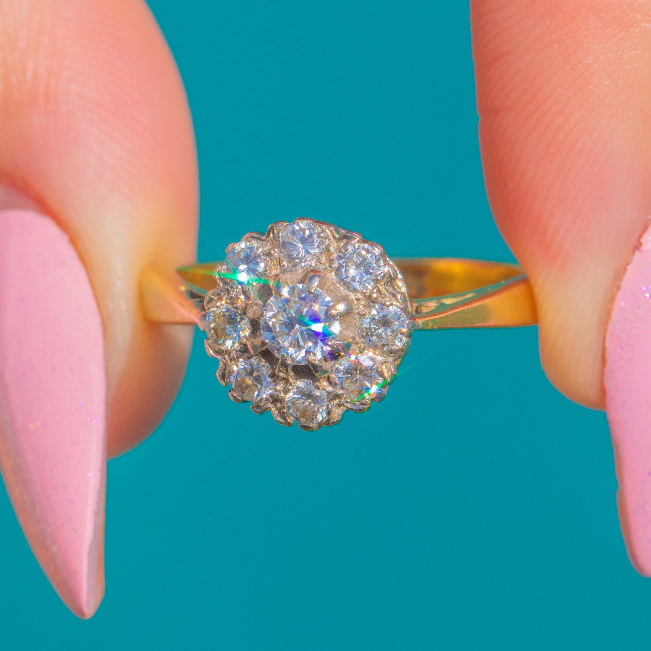 A timeless Daisy cluster with a luxurious twist, this Vintage ring marries warm 18ct Gold with a crisp 18ct White Gold head to showcase a bouquet of sparkling Diamonds. The classic domed rosette profile gleams beautifully, with a slightly larger centre Diamond framed by a perfect halo of smaller stones for that delicious, scintillating bloom.