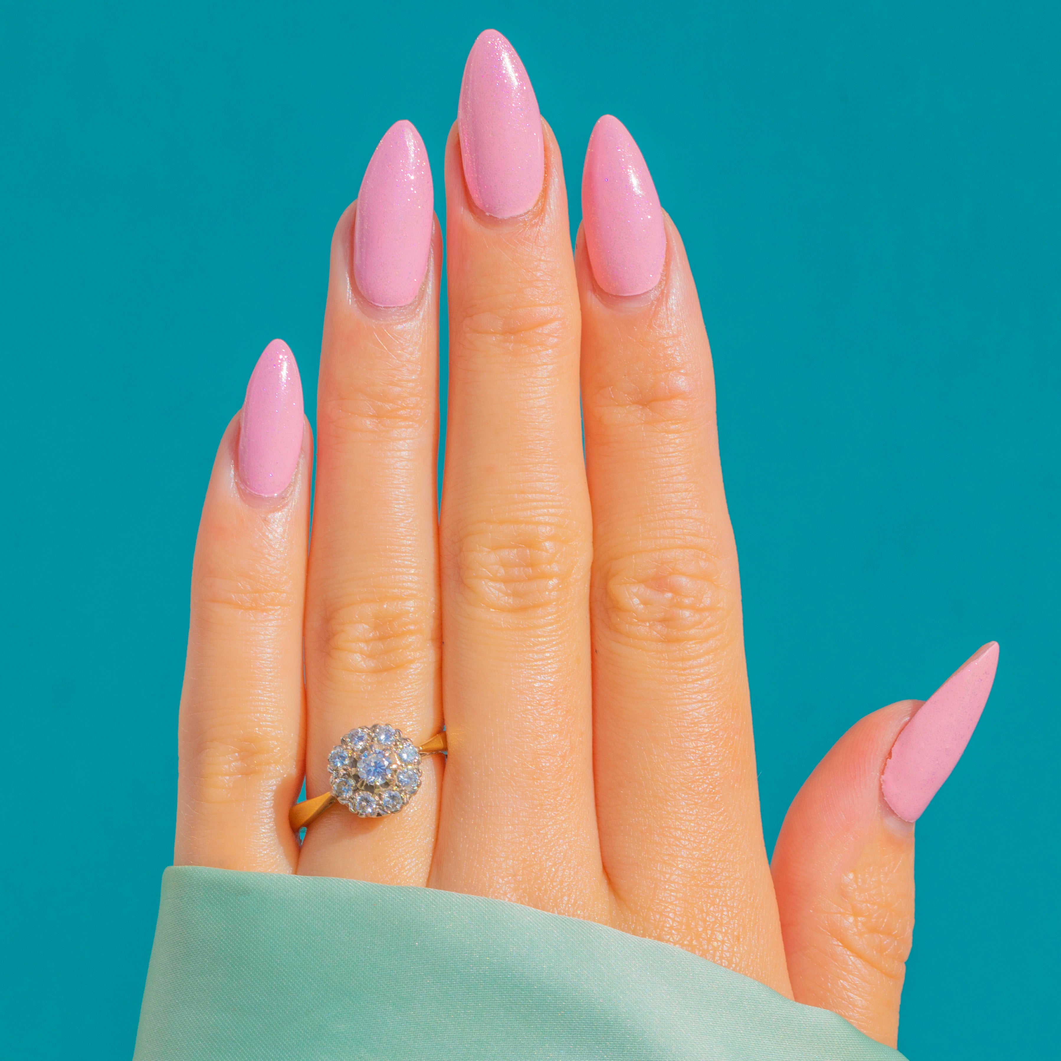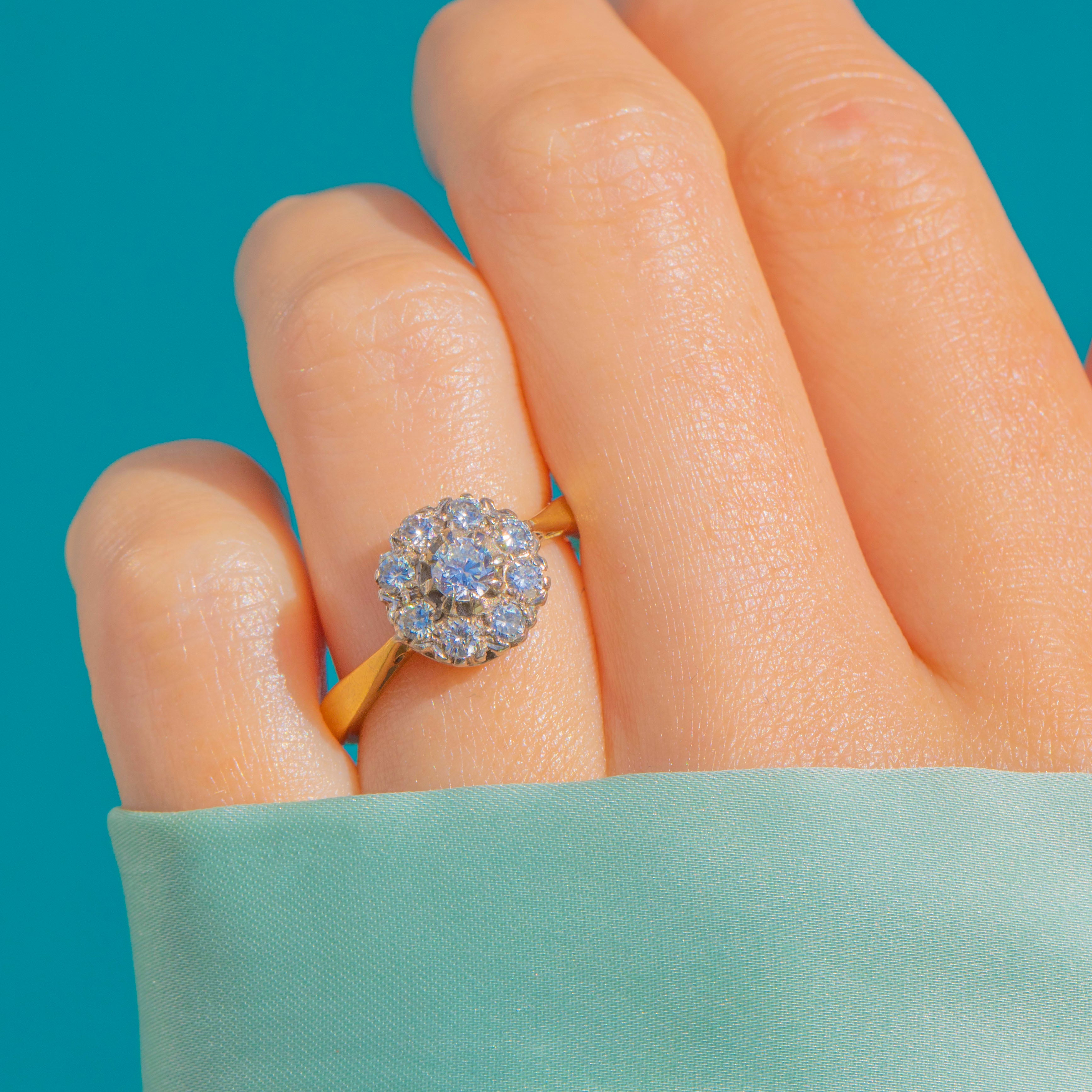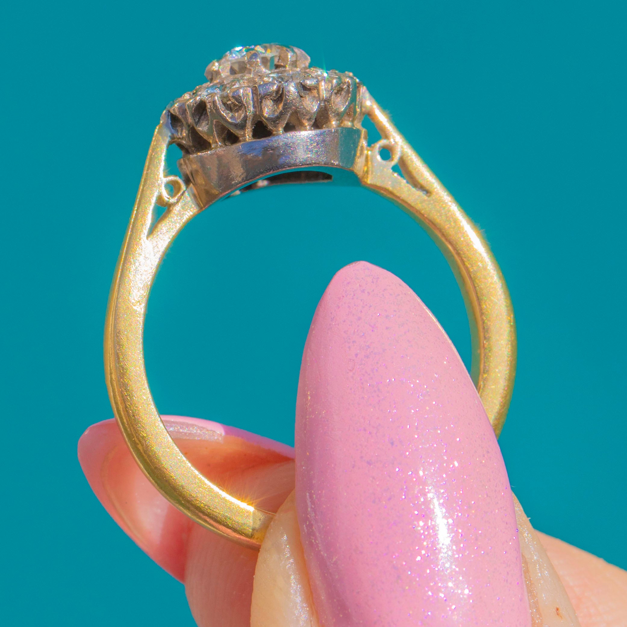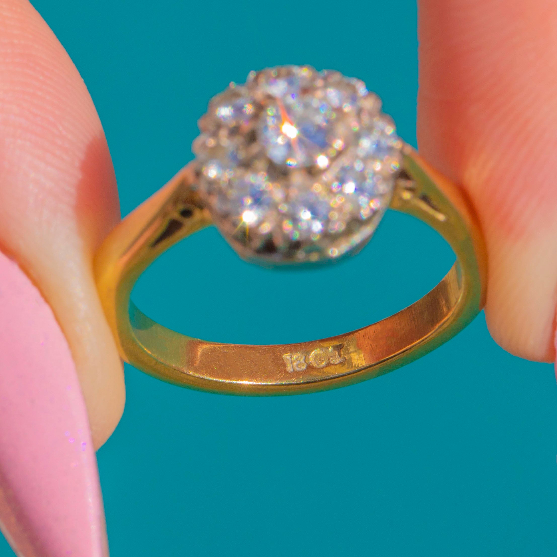 A timeless Daisy cluster with a luxurious twist, this Vintage ring marries warm 18ct Gold with a crisp 18ct White Gold head to showcase a bouquet of sparkling Diamonds. The classic domed rosette profile gleams beautifully, with a slightly larger centre Diamond framed by a perfect halo of smaller stones for that delicious, scintillating bloom.
