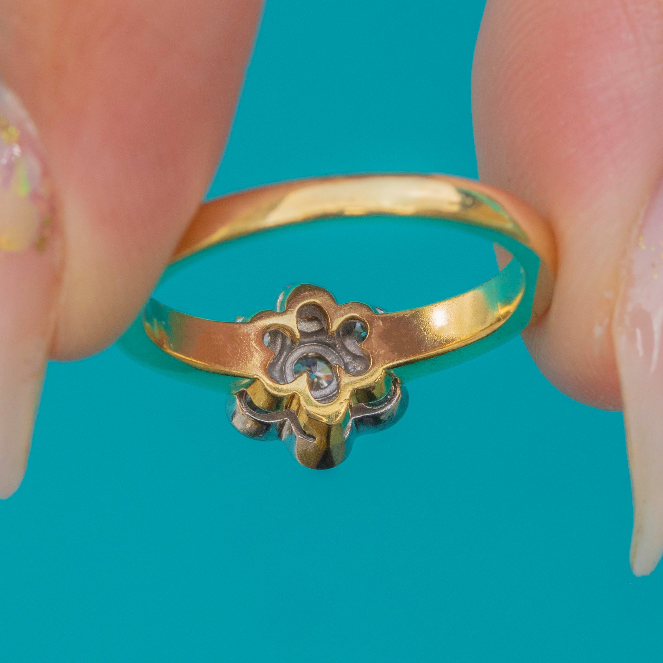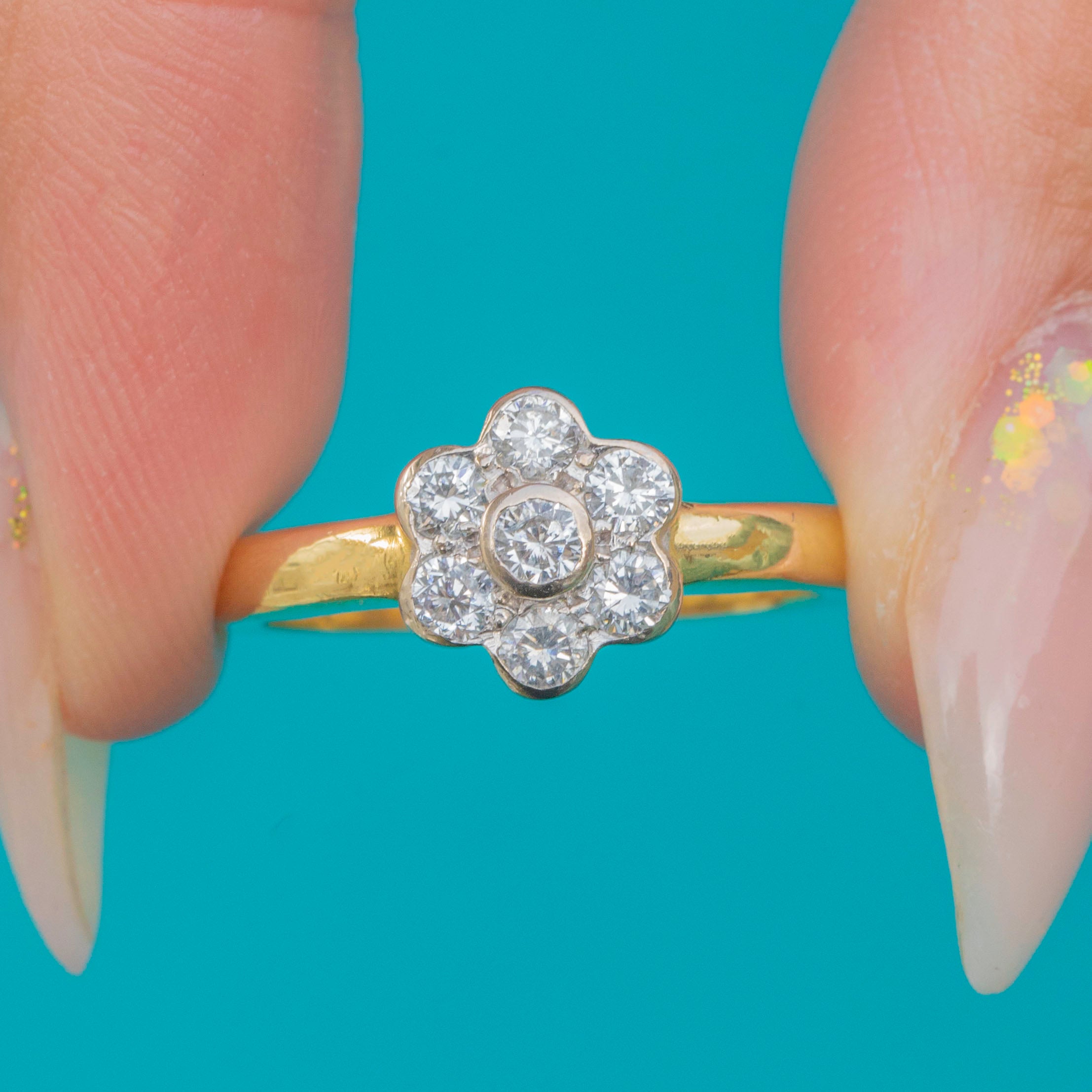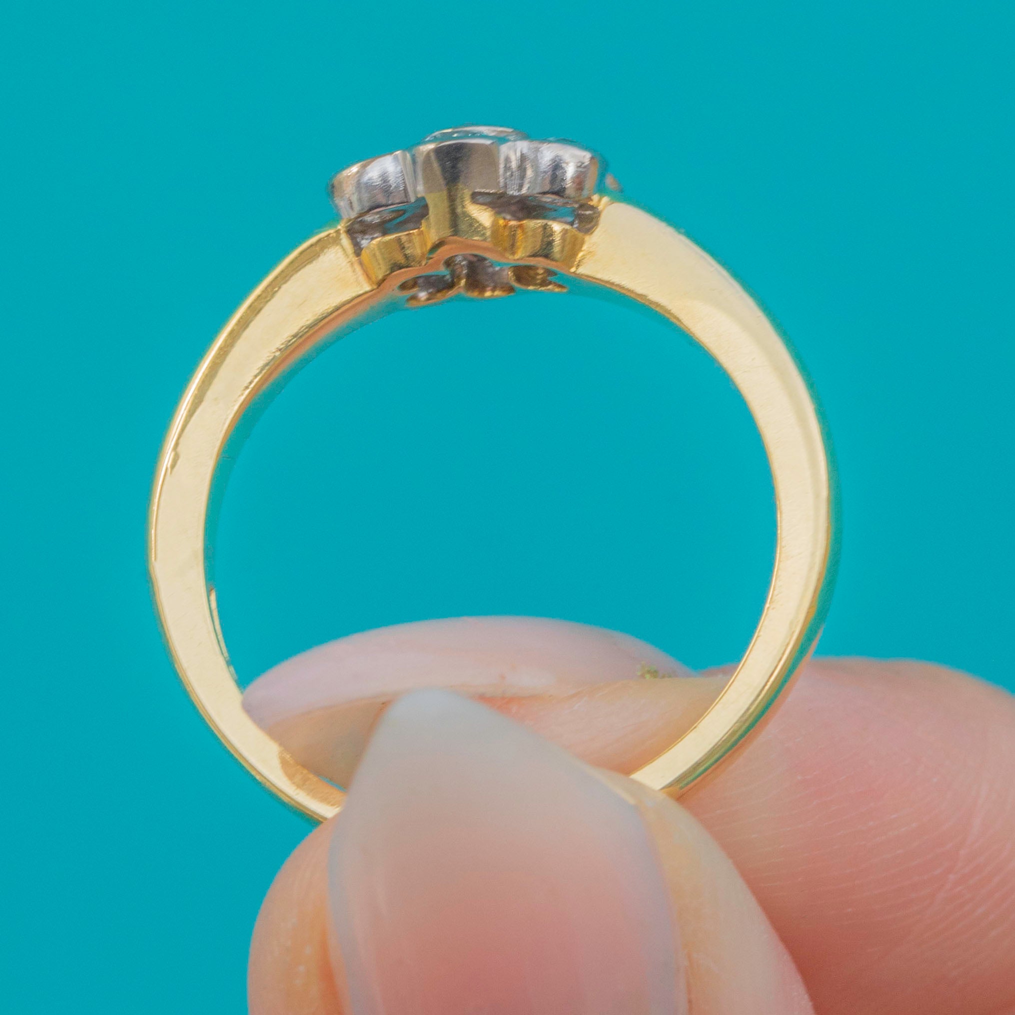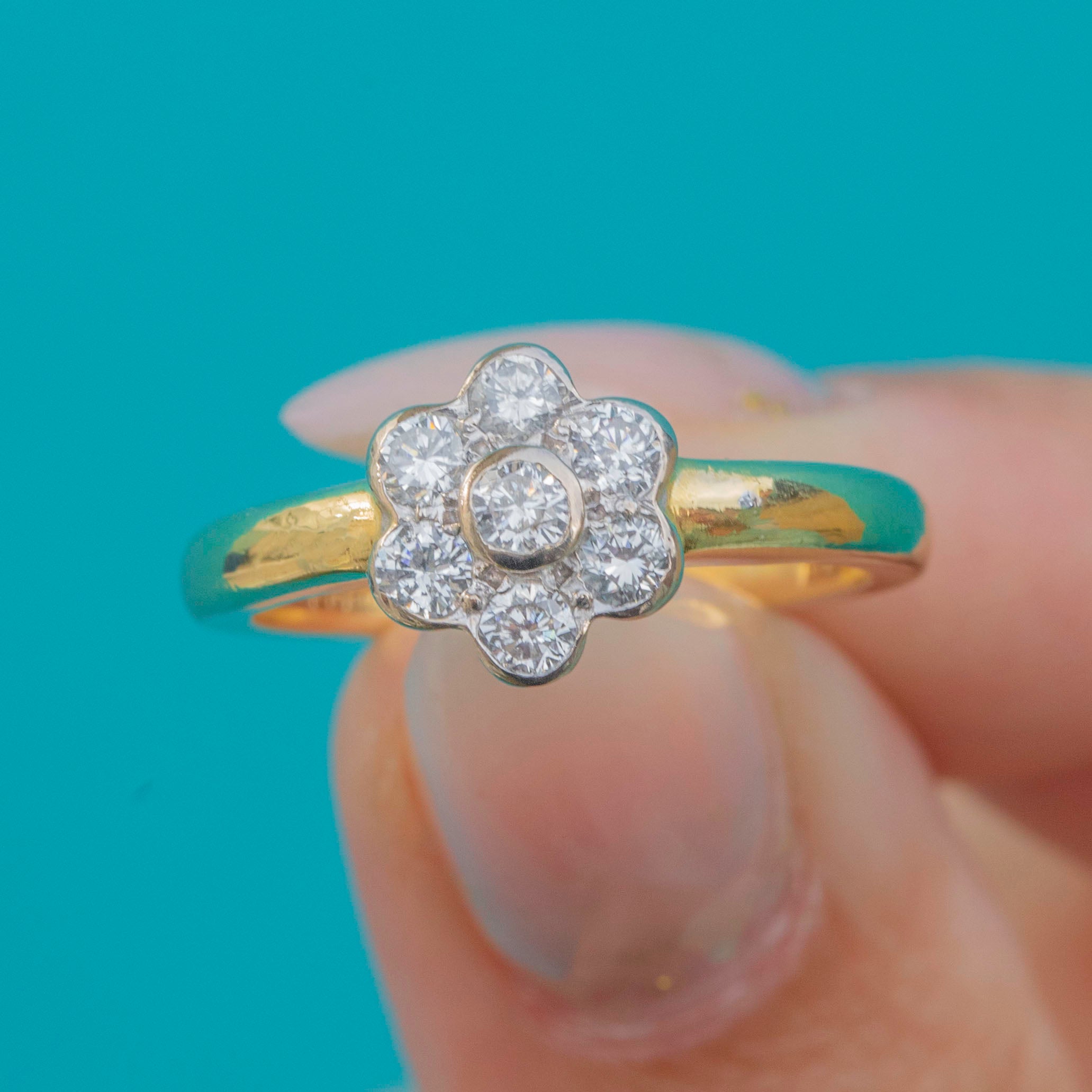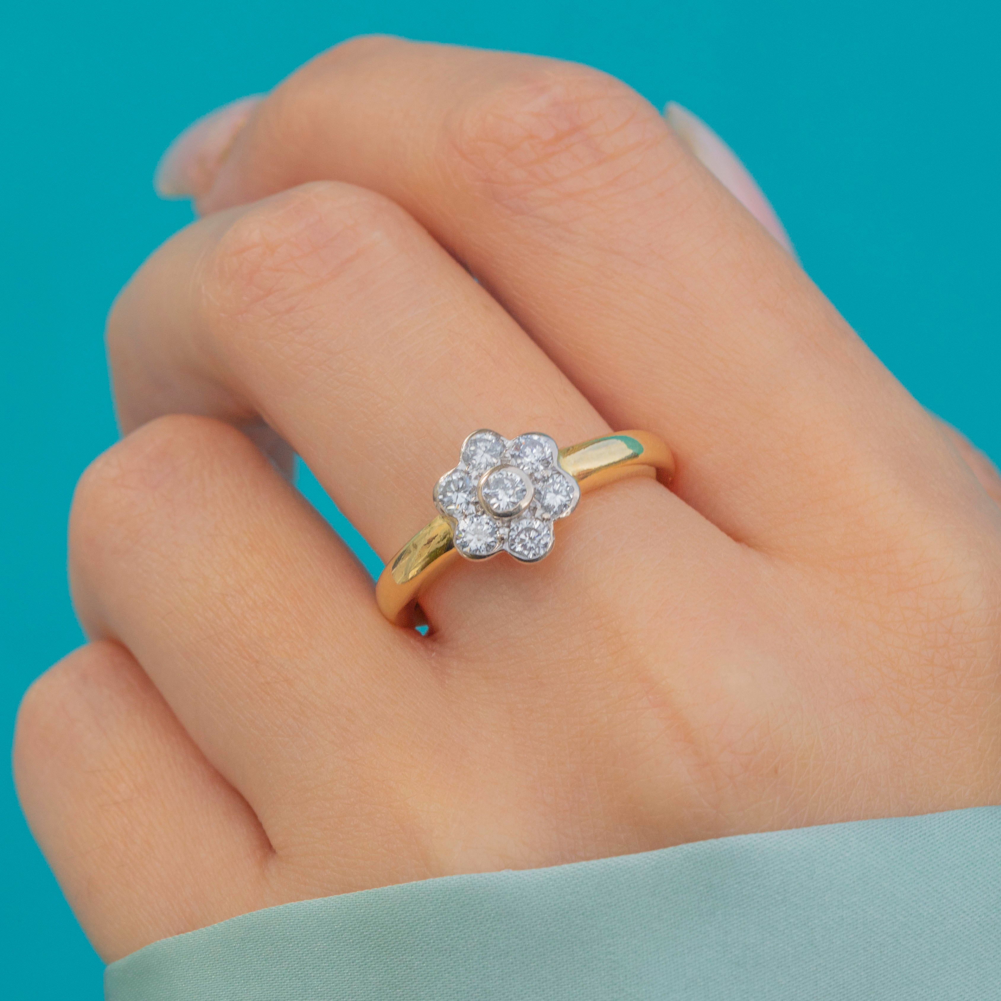 A timeless vintage flower cluster ring, set with bright, sparkling Diamonds totalling 0.50ct. The design has a wonderfully classic feel – a crisp cluster head that catches the light from every angle, set on a polished 18ct Gold band.