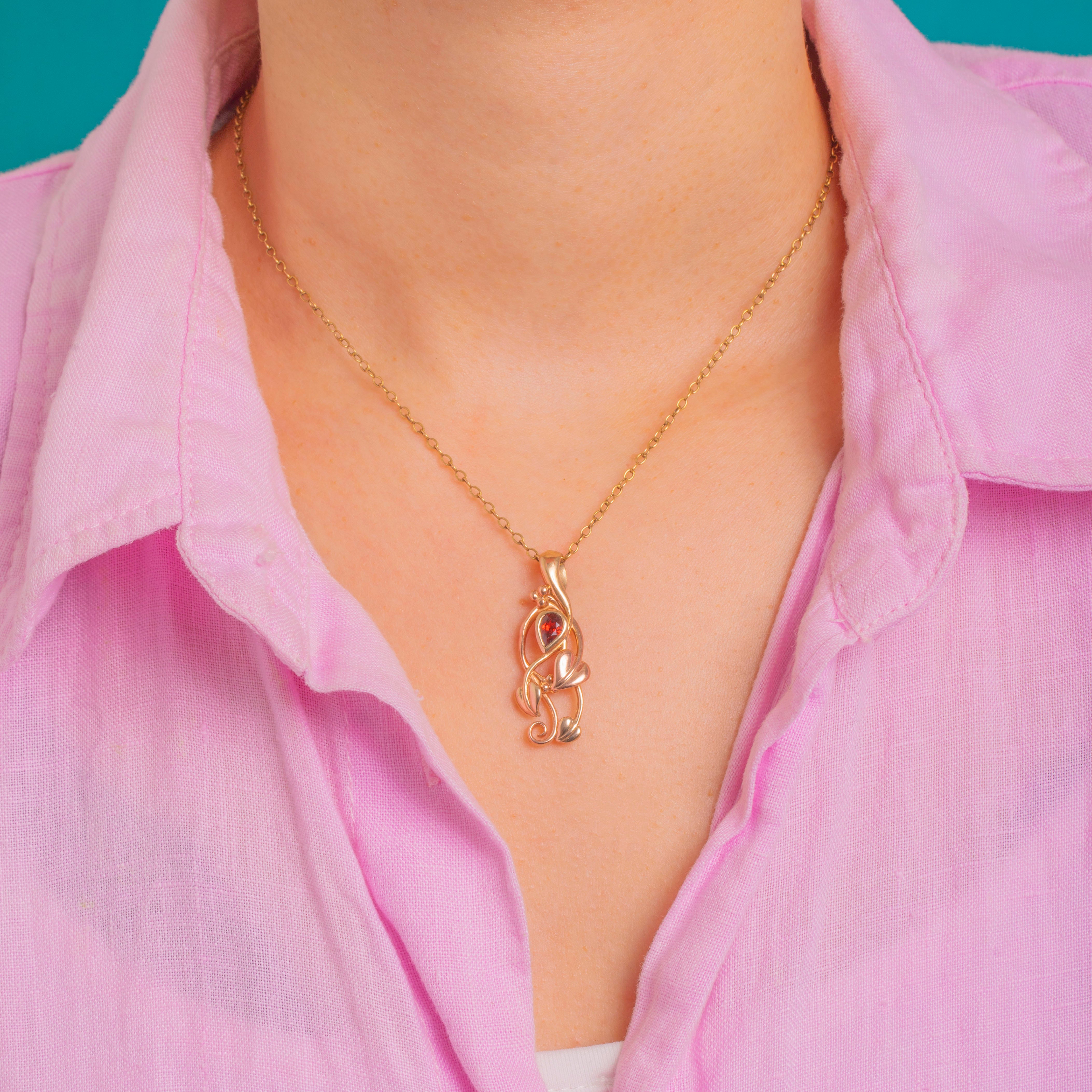 This Clogau ivy leaf pendant curls and twines in sculptural openwork, its leaves rendered in interwoven 9ct Gold for a subtle, romantic glow. Nestled near the top, a pear-cut Garnet brings a deep red warmth, bezel-set to mirror the pendant’s fluid whiplash curves.