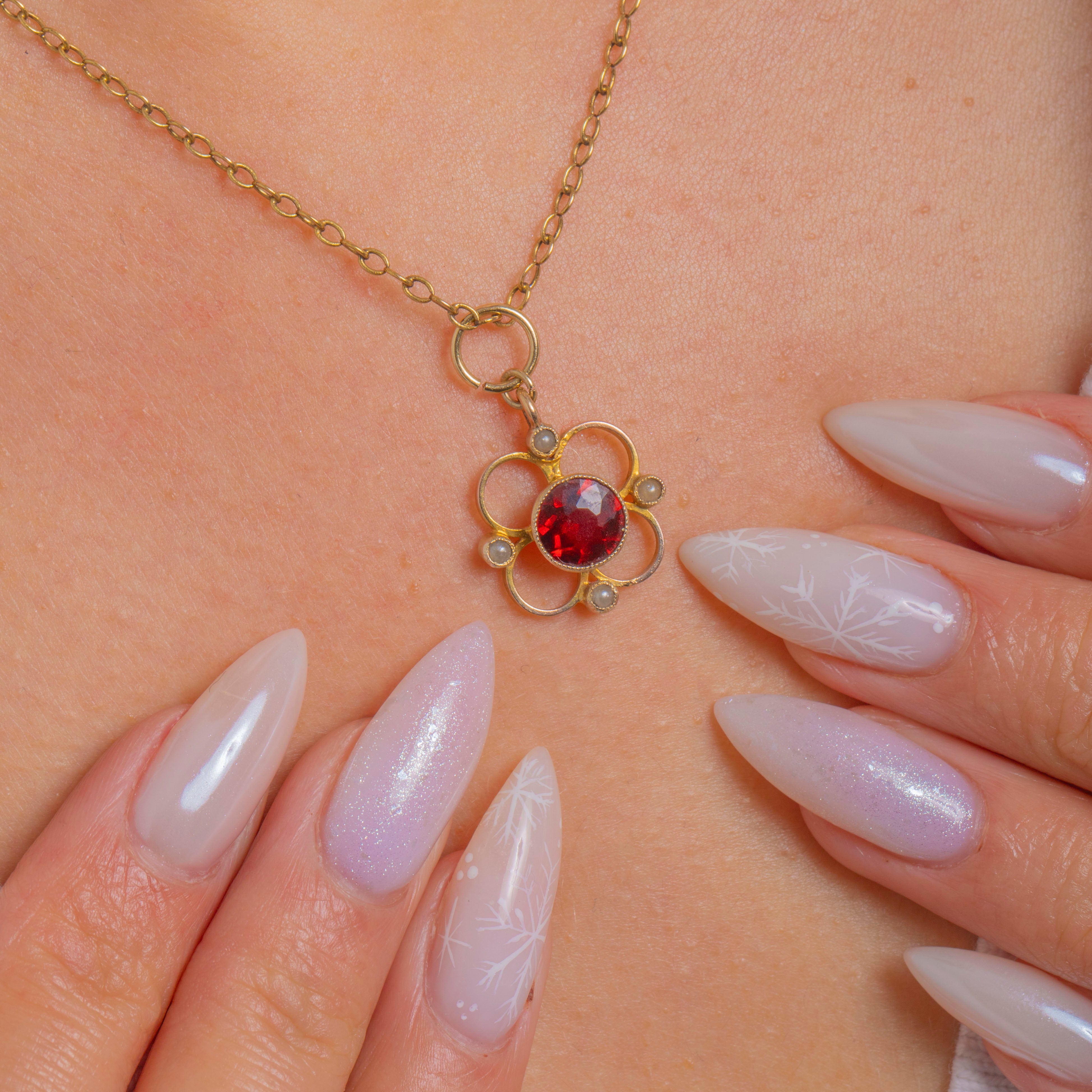 Delicate and full of charm, this Edwardian four leaf clover pendant is crafted in 9ct Gold with a luminous round Garnet at its heart. Airy openwork petals form a pretty quatrefoil, punctuated by tiny Seed Pearls and finished with fine milgrain to the bezels for that quintessential antique touch.