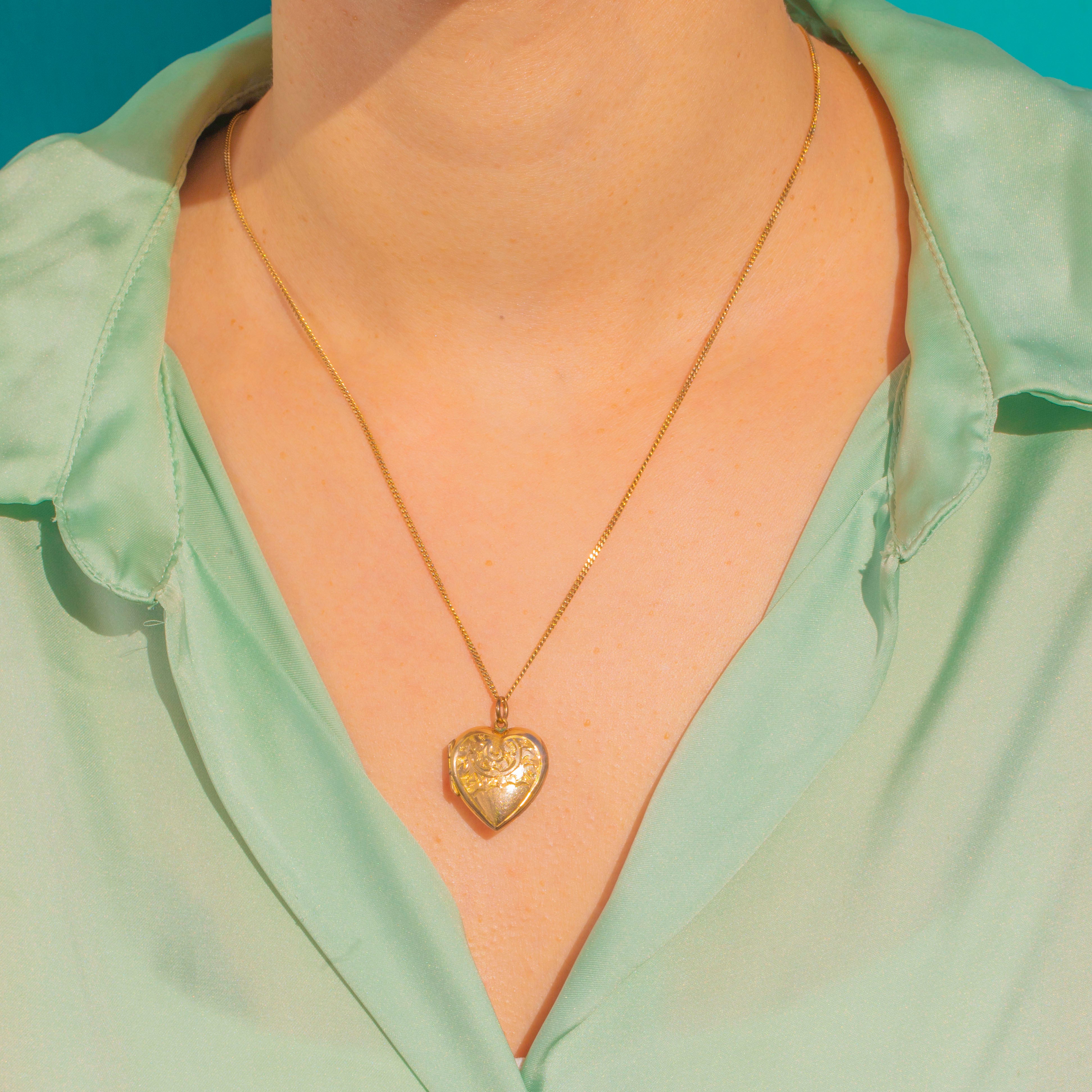 A dainty Victorian puffy heart locket in 9ct Gold, richly adorned with foliate scrolls. The softly domed silhouette and raised rim frame a polished cartouche to the front, perfect for personalisation should you wish. Romantic and refined, it glows with that unmistakable antique warmth.