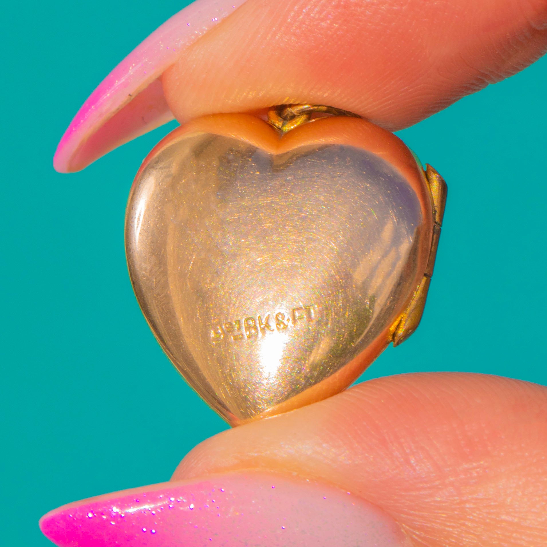 Inside are two heart-shaped compartments to hold treasured photos or keepsakes. The engravings remain crisp, and the piece wears beautifully with gentle age to the high points—timeless sentiment in a petite, elegant form.
