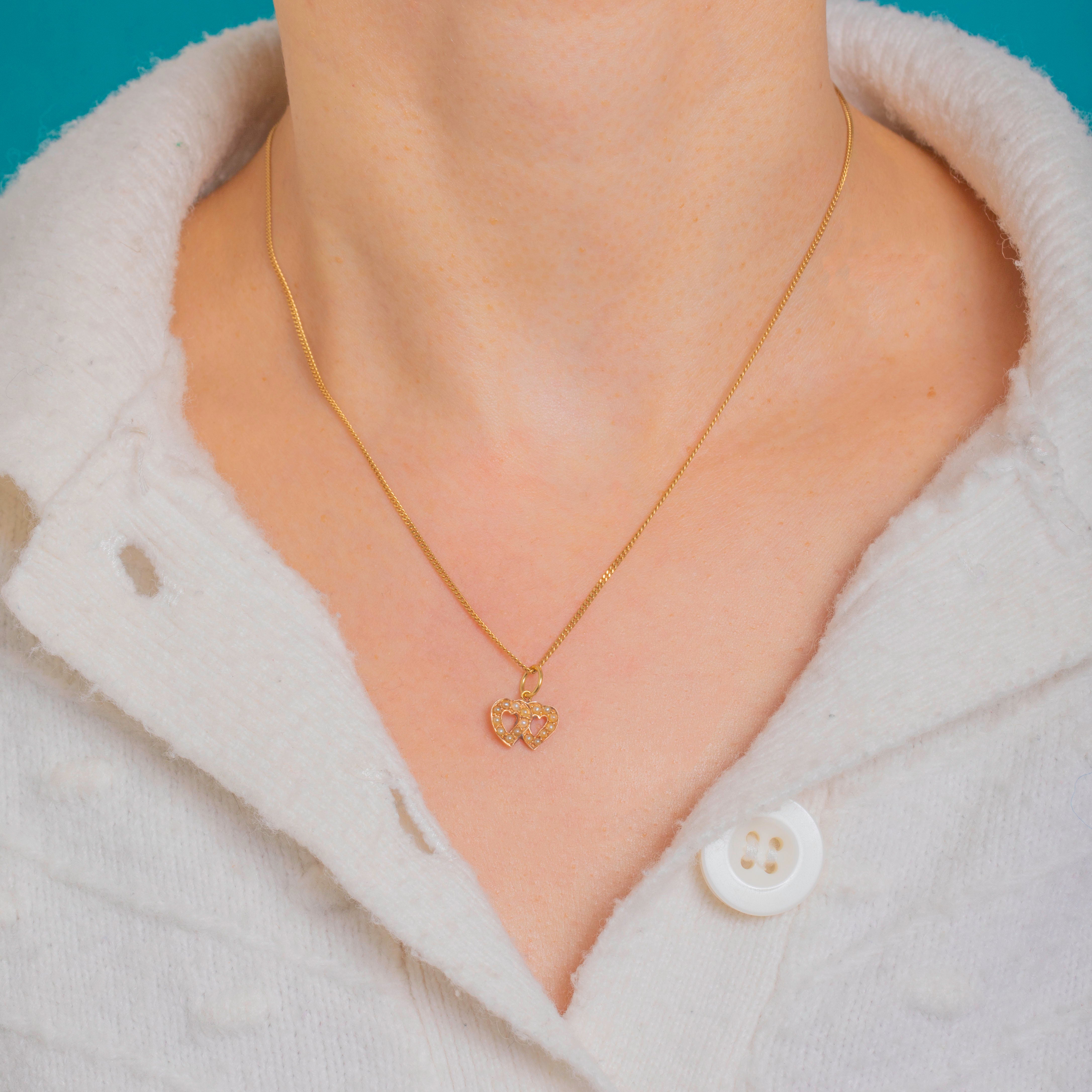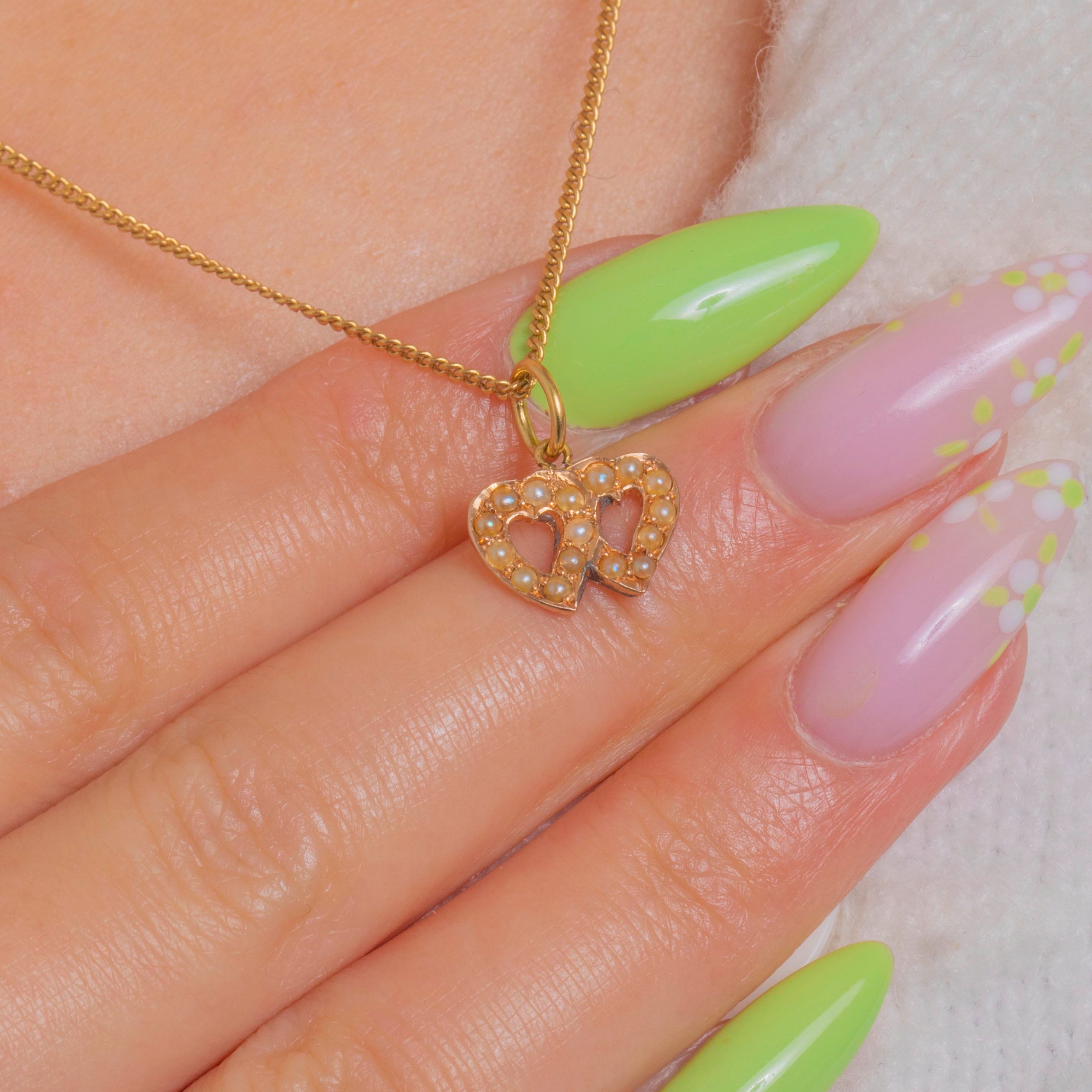 Romantic and refined, this dainty Victorian double Witches’ heart charm is sculpted in glowing 15ct Gold and edged with a luminous halo of tiny Seed Pearls. The openwork hearts sit sweetly side-by-side, their softly curving outlines brought to life by a delicate, even row of creamy gems.
