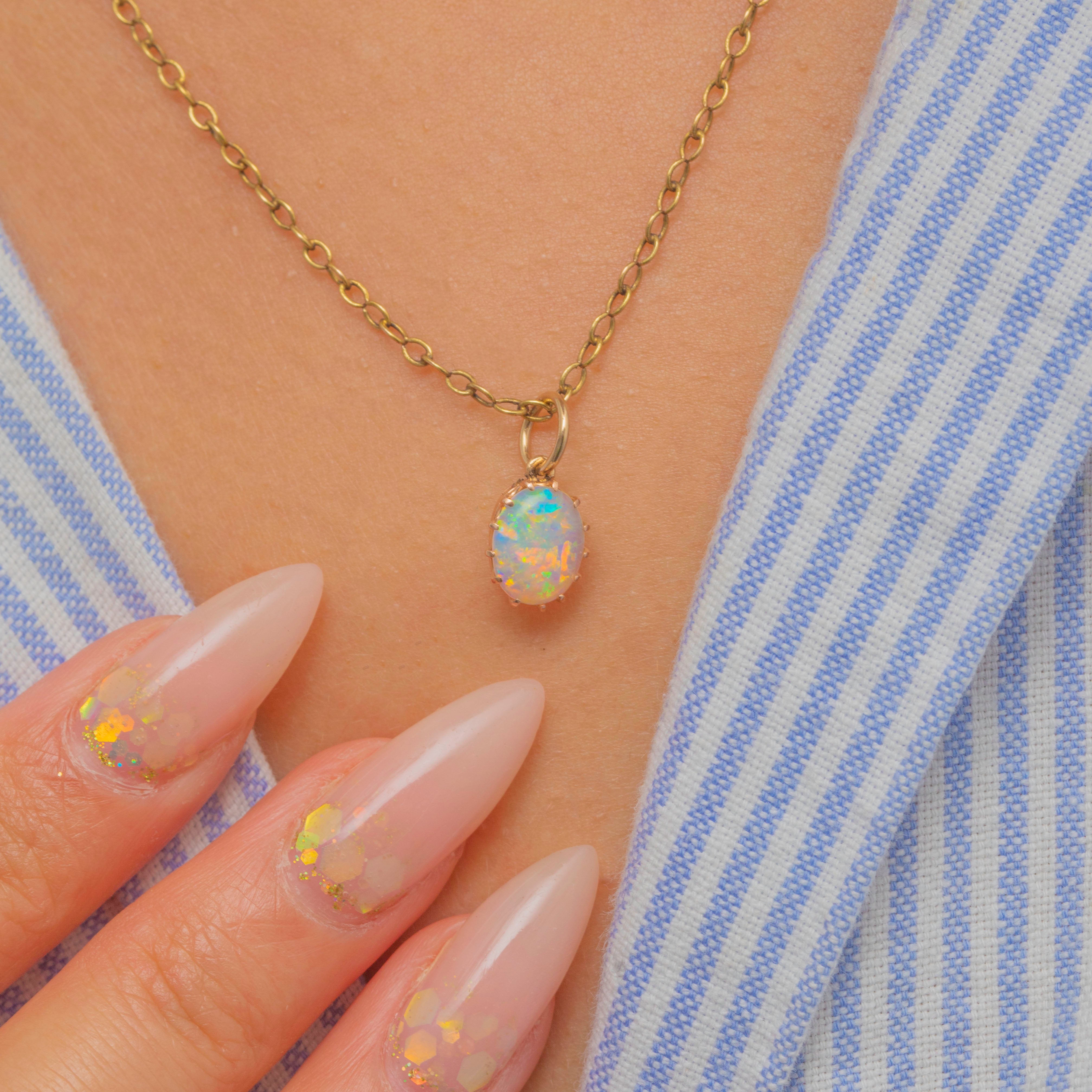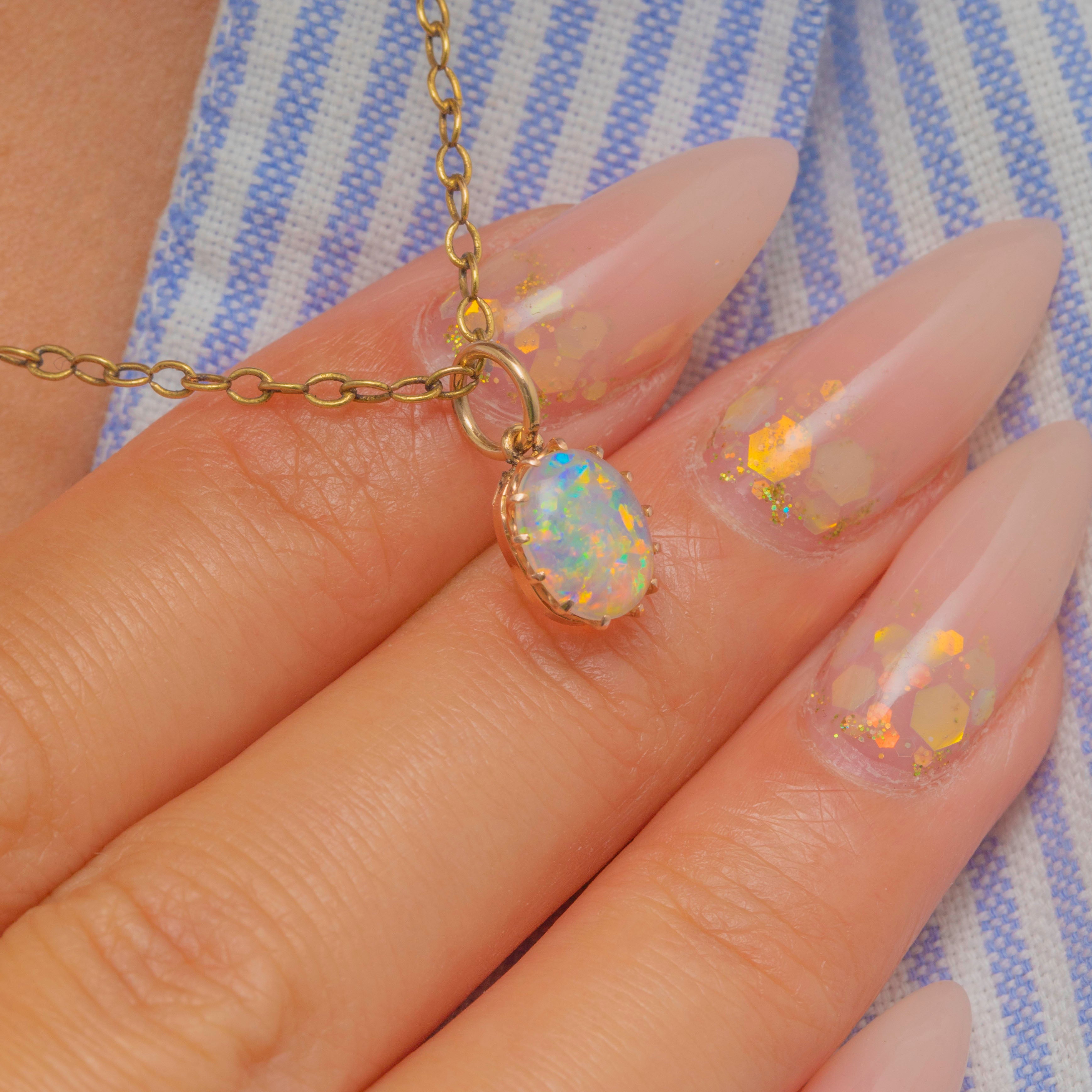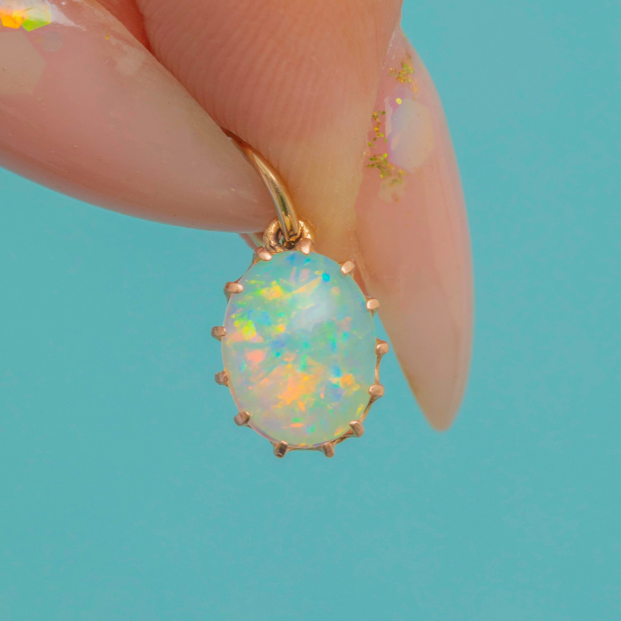 EXCELLENT: The charm is in wonderful condition. The Opal is securely set, smooth, and bright with attractive play-of-colour. The Gold claw setting and jump ring are sturdy, making this a wearable and well-preserved Victorian piece.