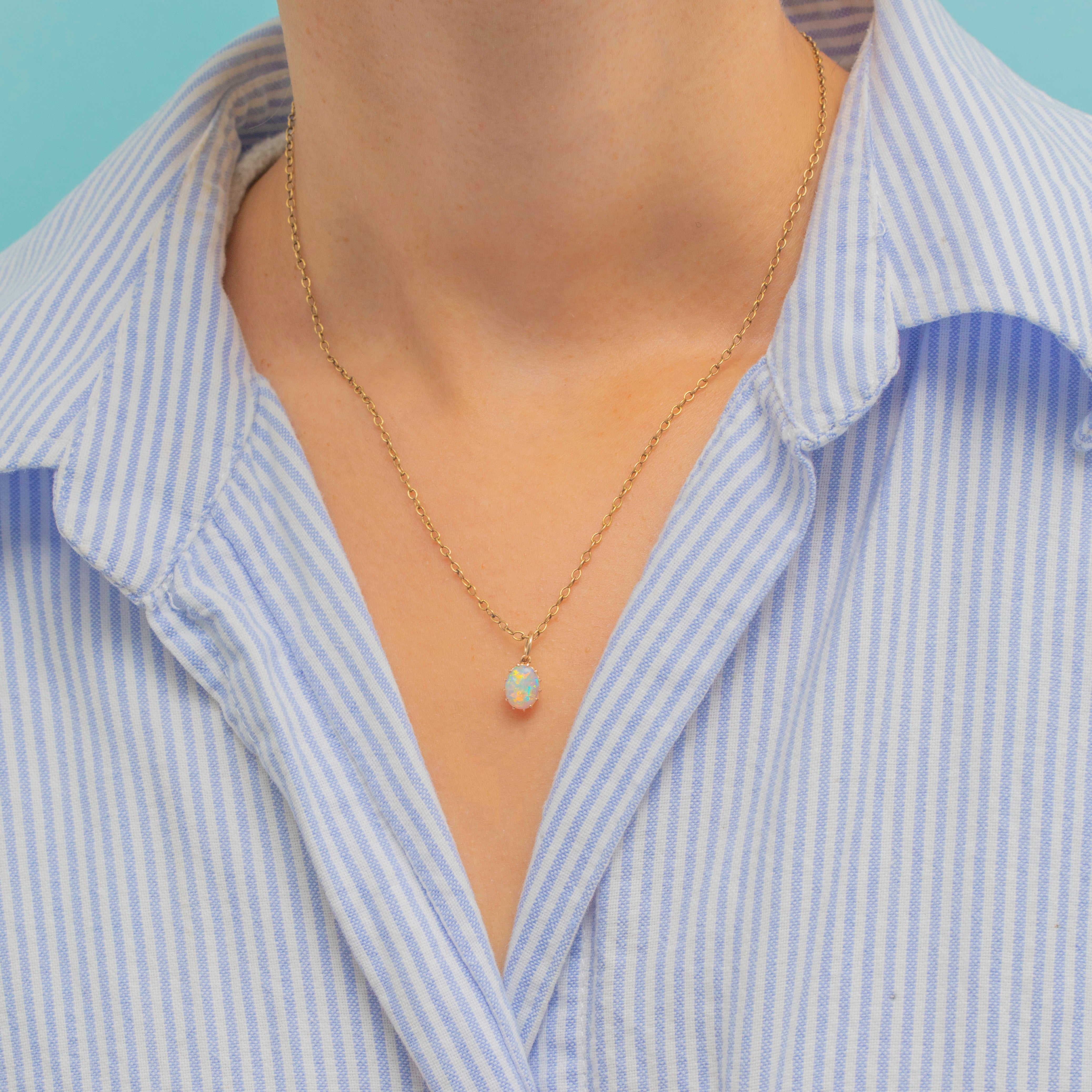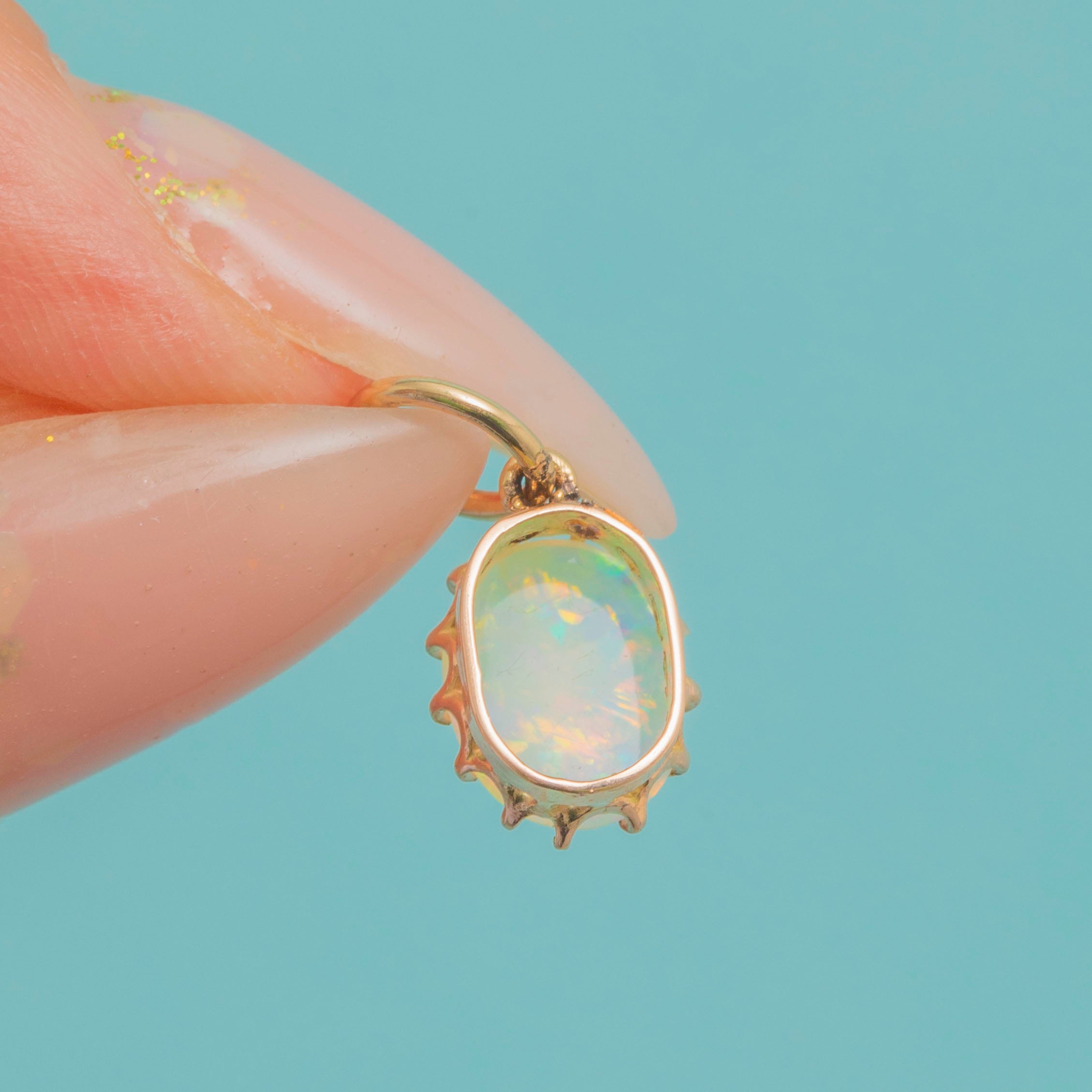 This dainty Victorian charm is crafted in 9ct Gold and set with a luminous Opal cabochon. The Opal glows with flashes of colour, delicately framed in classic claw settings that let the light dance across its surface.