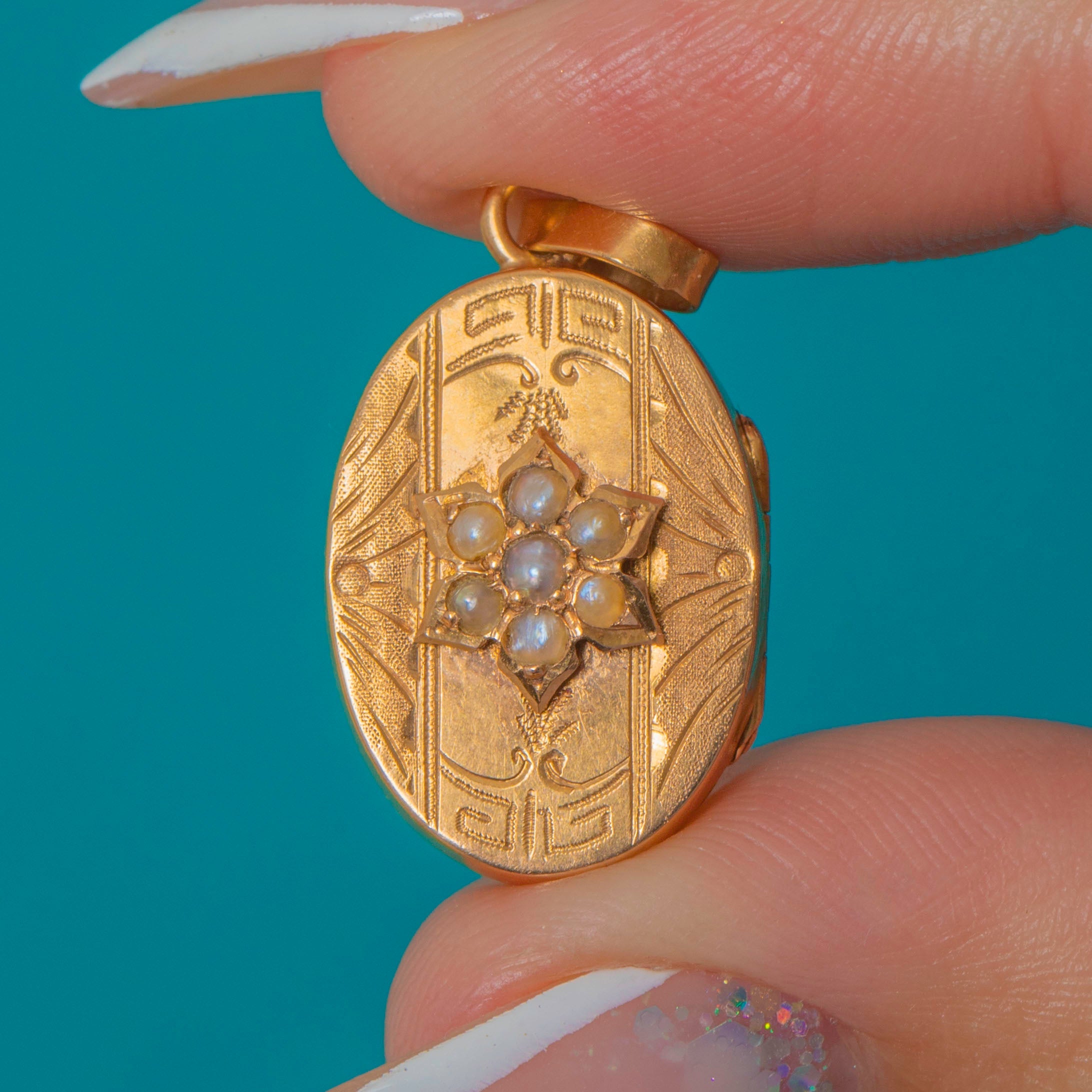 VERY GOOD: The Seed Pearls are secure and well-matched with a soft, even lustre. The 18ct Gold surfaces show light wear in keeping with age but retain a lovely bright colour. The locket opens and closes securely and has clearly been well cared for.