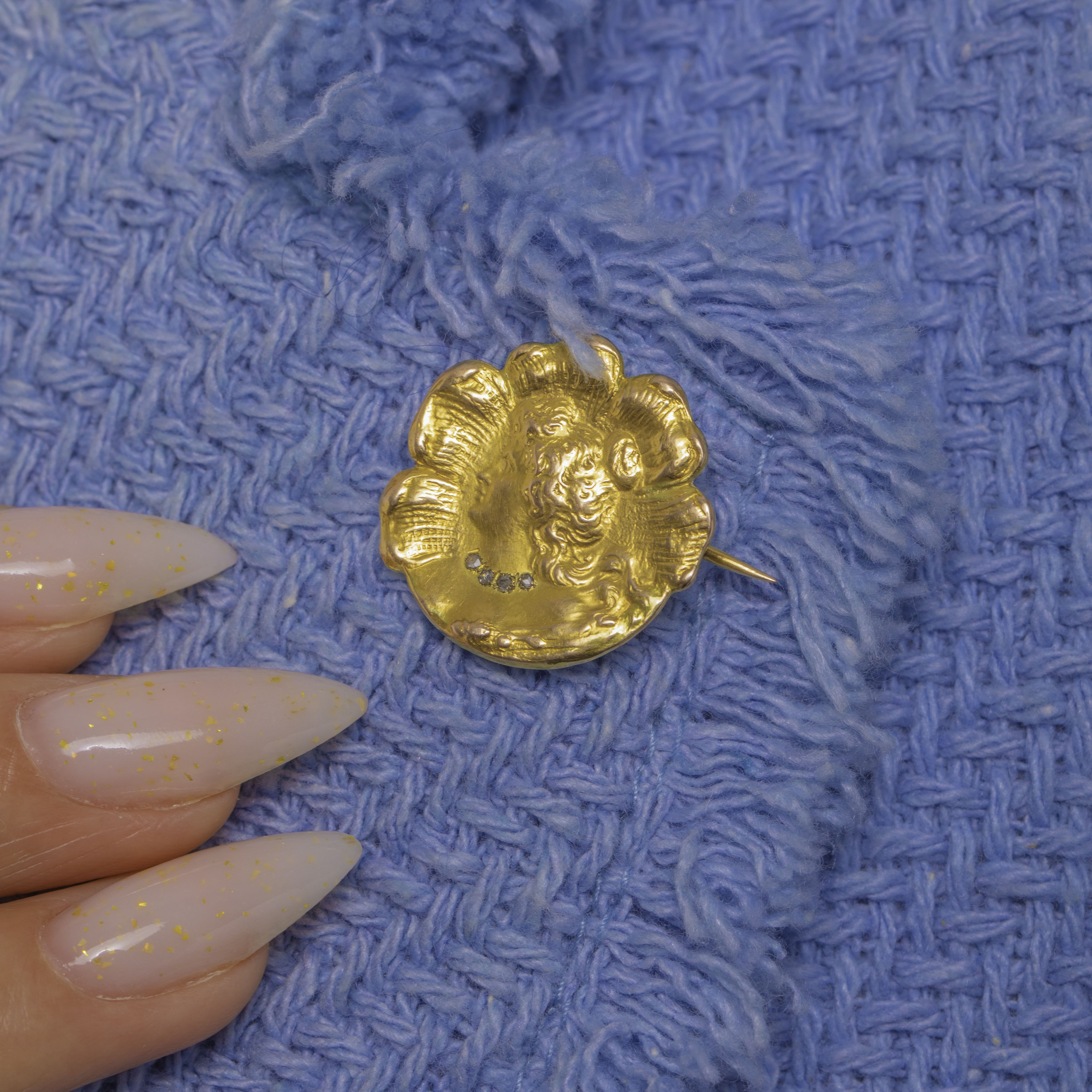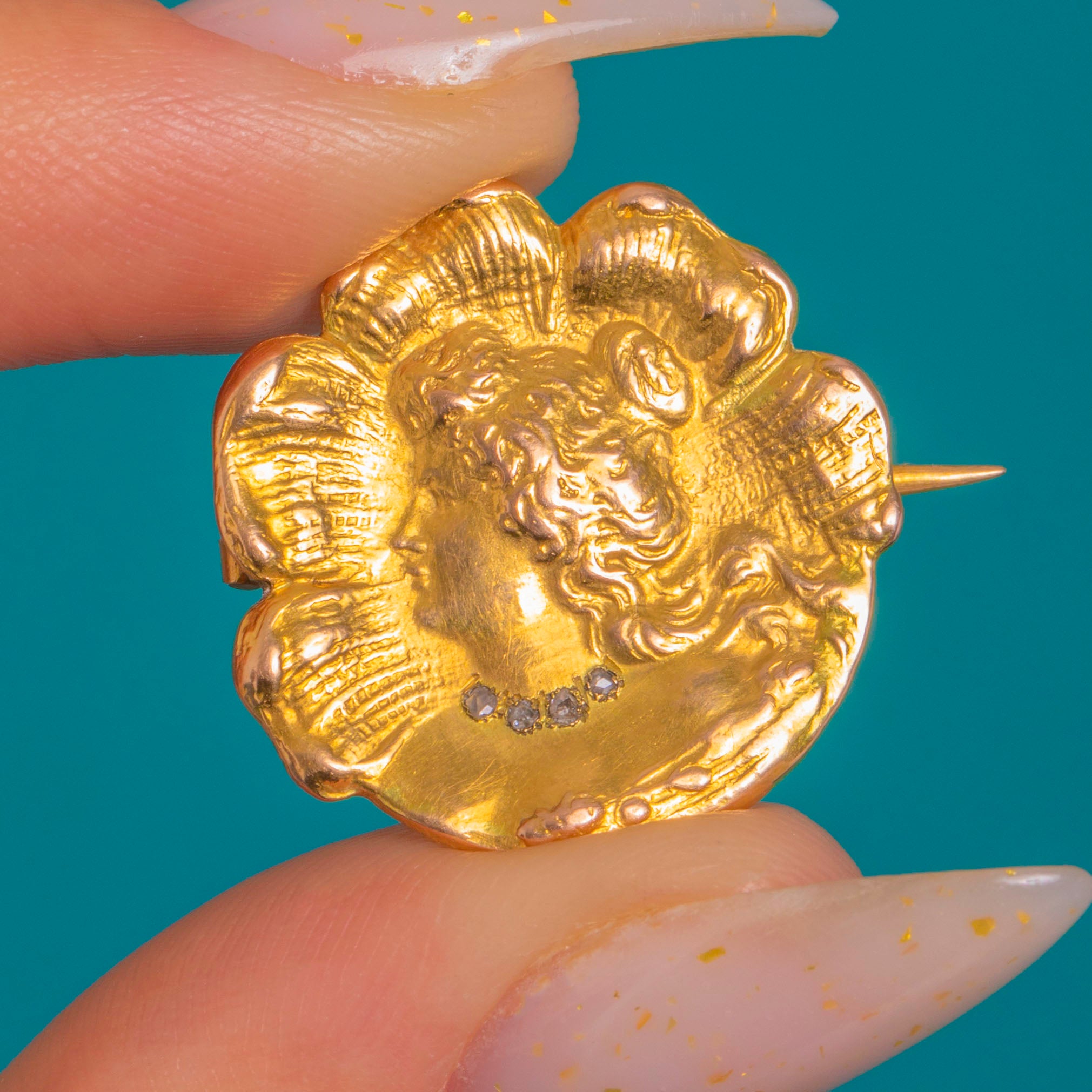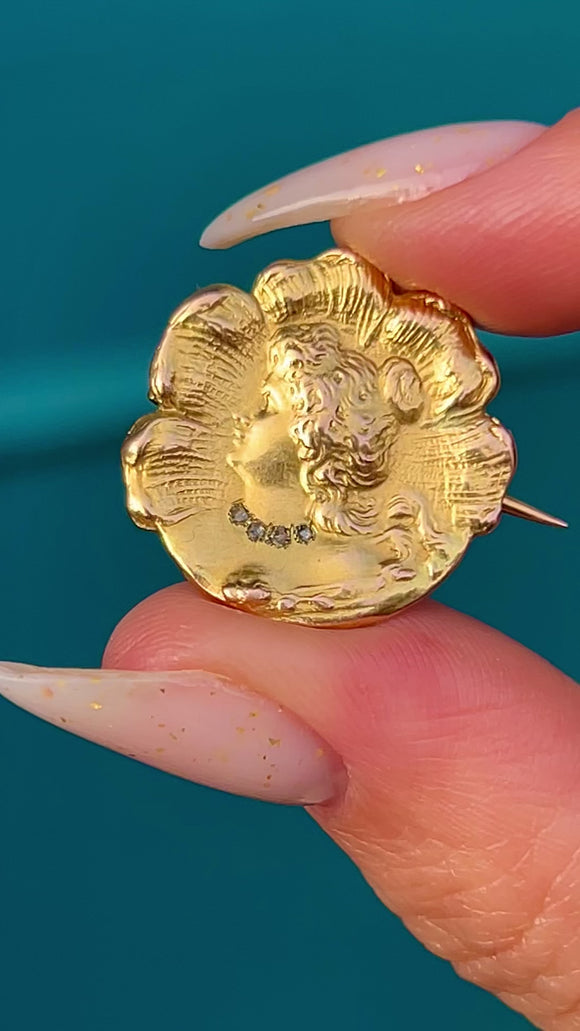 Quintessentially Art Nouveau, this petite 18ct Gold portrait brooch features a graceful maiden in sculpted relief, her flowing “whiplash” hair framed by a scalloped rosette border. A delicate collar of four tiny rose-cut Diamonds sparkles at her neckline, lending a subtle, elegant shimmer against the mellow glow of antique Gold.