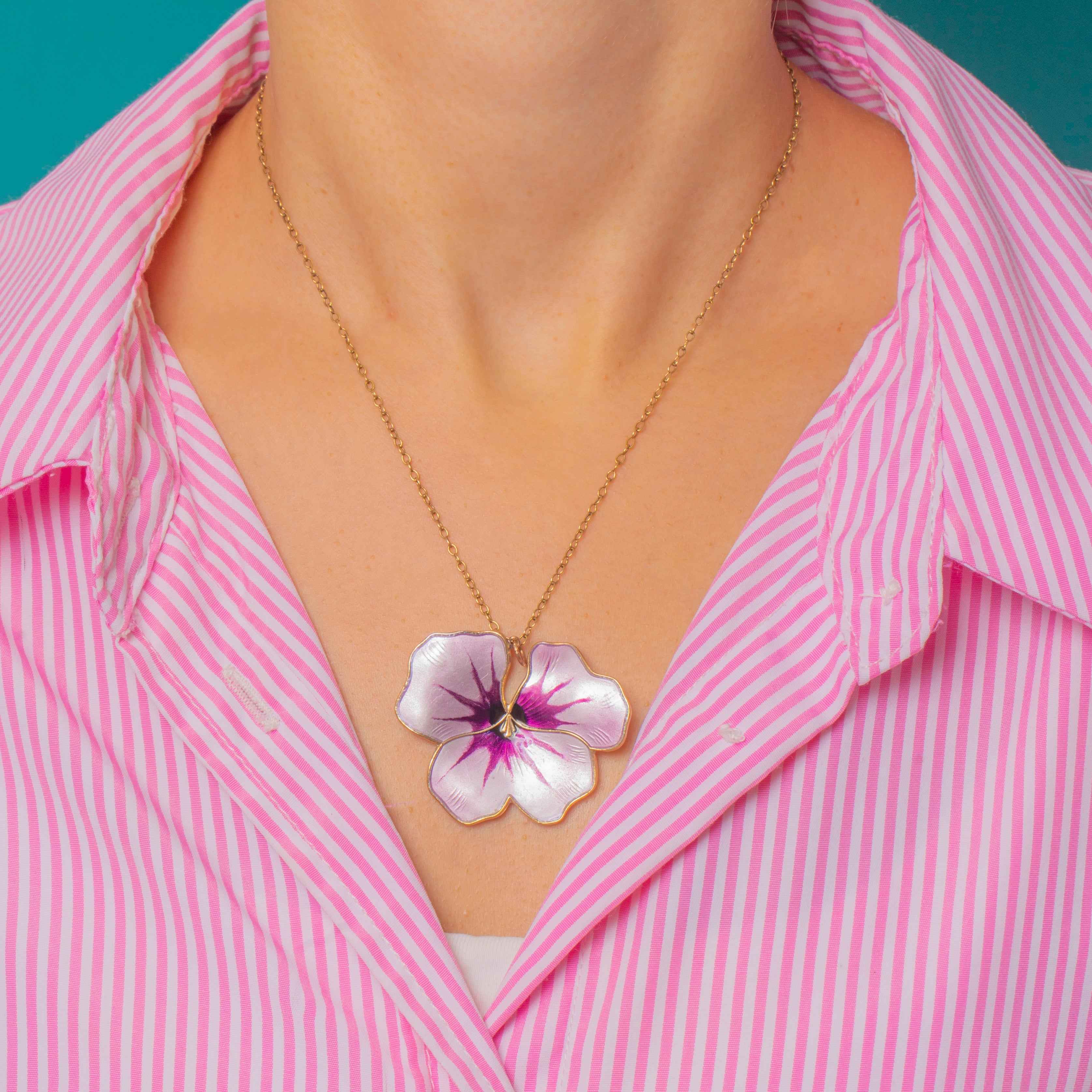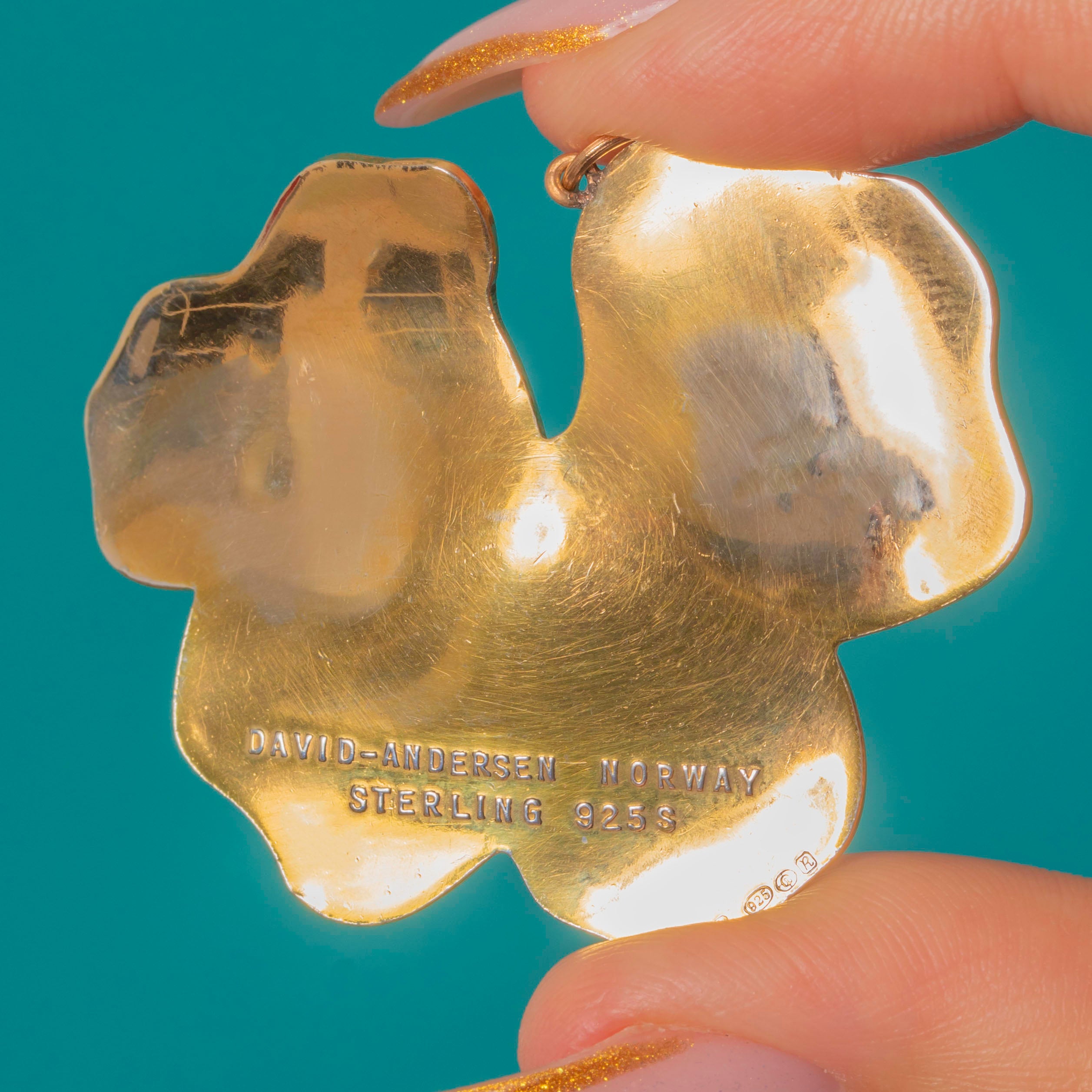 This exquisite mid-century David Andersen pendant captures the timeless charm of Scandinavian design. Shaped as a delicate pansy, it glows with layers of guilloché Enamel in shimmering lilac and violet, its iridescent petals framed in warm gilded Sterling Silver. The quality and craftsmanship are unmistakable—crisp definition, precise colouring, and a naturalistic finish that feels both romantic and modern.