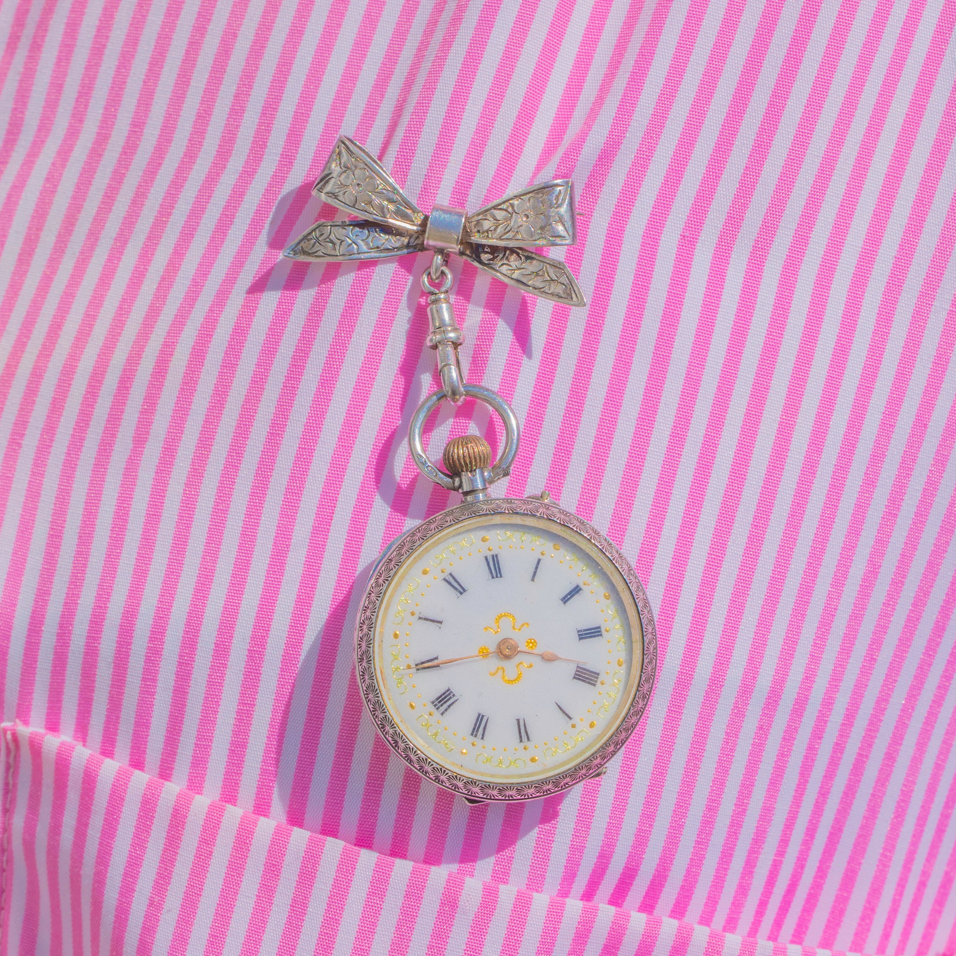 A romantic Edwardian treasure, this Sterling Silver bow brooch suspends a petite pendant watch in a graceful articulated drop. The bow is richly engraved with foliate detail, while the watch case is framed by an engine-turned border for a subtle guilloché-like shimmer. A white Enamel dial with black Roman numerals, delicate gilt scrollwork and elegant Gold hands completes the picture, with a warm gilt crown adding a final flourish.