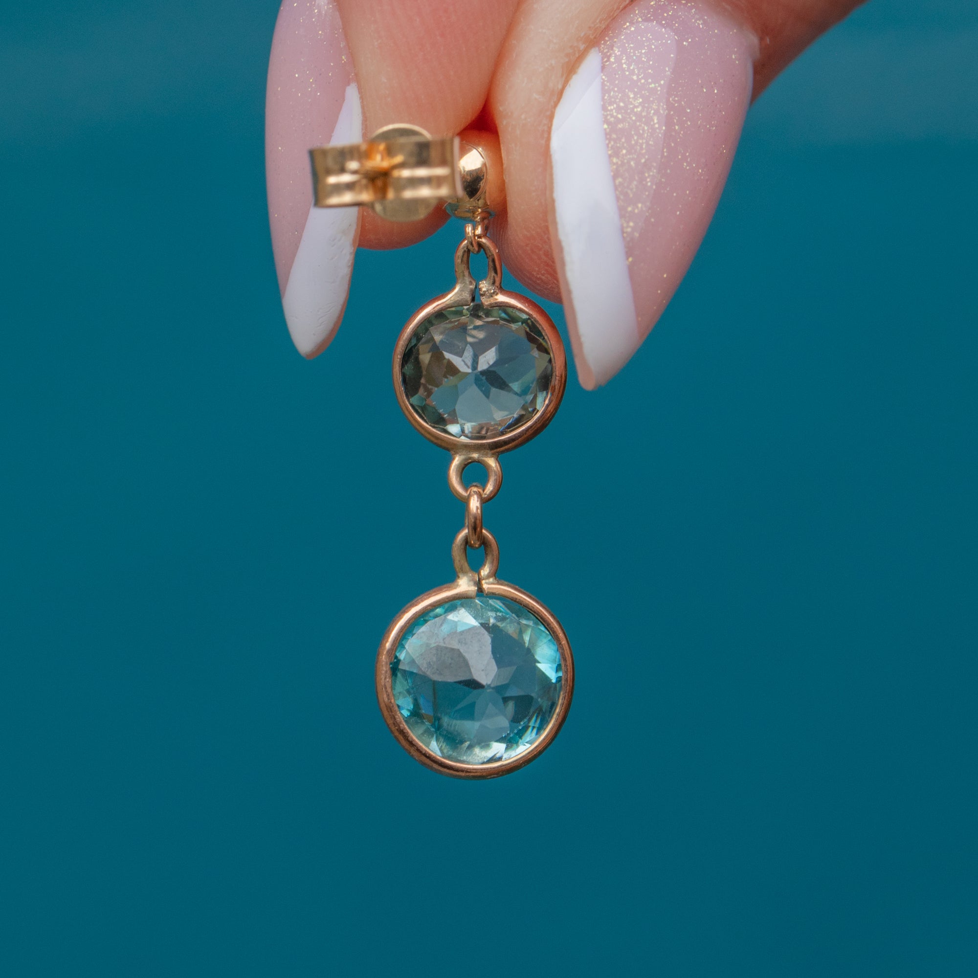 Each earring features two graduating Zircons, each with a vibrant azure blue hue. They sit securely within rosy 14ct Gold bezels, providing the cool gemstones with a lovely contrasting warmth.