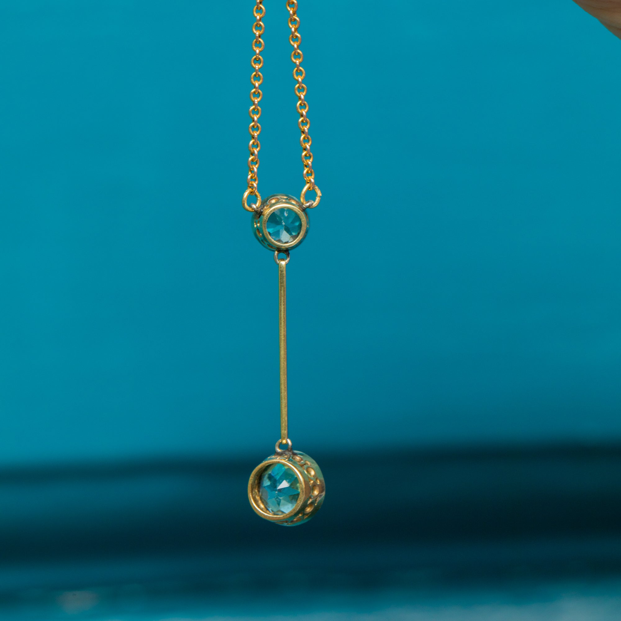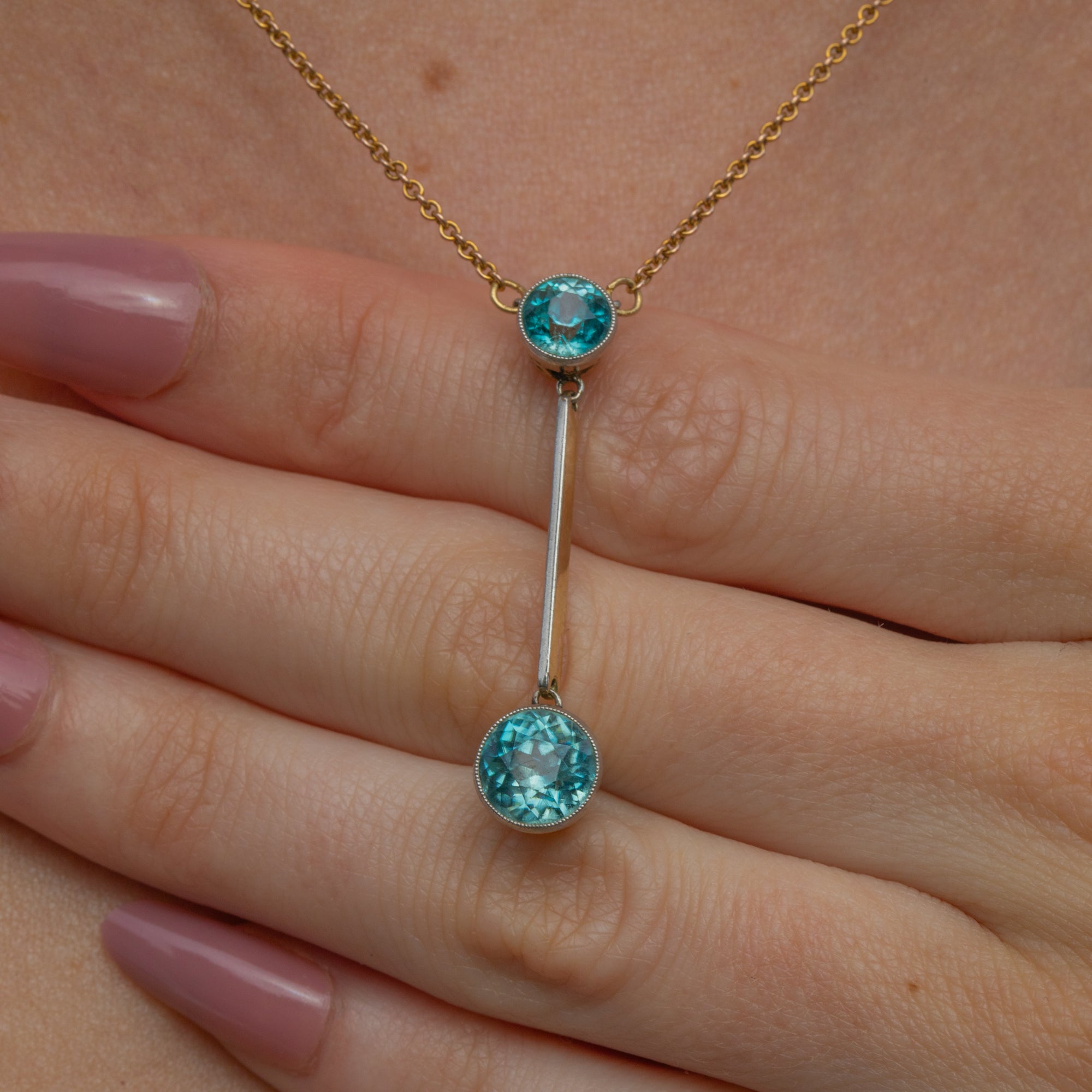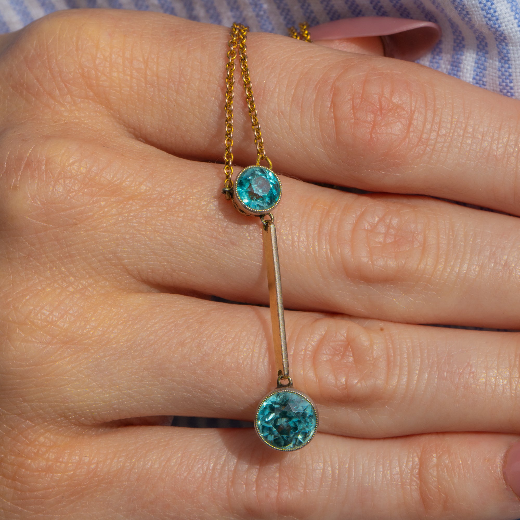 VERY GOOD. This Edwardian 15ct Gold blue Zircon drop necklace is in very good condition. Each component is securely connected with a wonderful fluidity throughout. The Blue Zircon are secure within their settings and although there is some wear to the facets, this cannot be seen through their vivacious blue sparkle. To the Gold bar along the side there is some wear, however this is only noticeable under close inspection. With a securely attached Gold chain and fully functioning bolt-ring, you can wear this Edwardian necklace confidently!