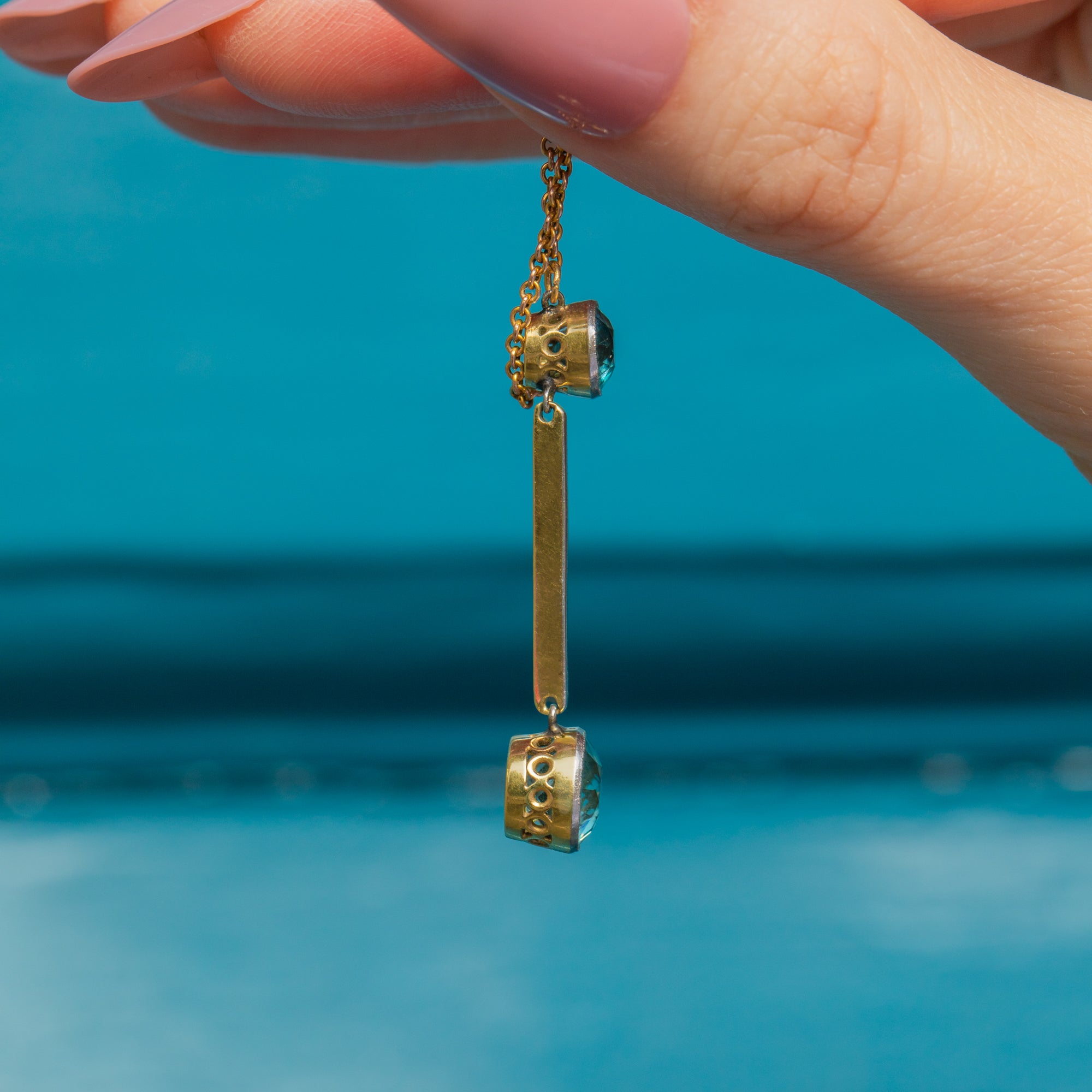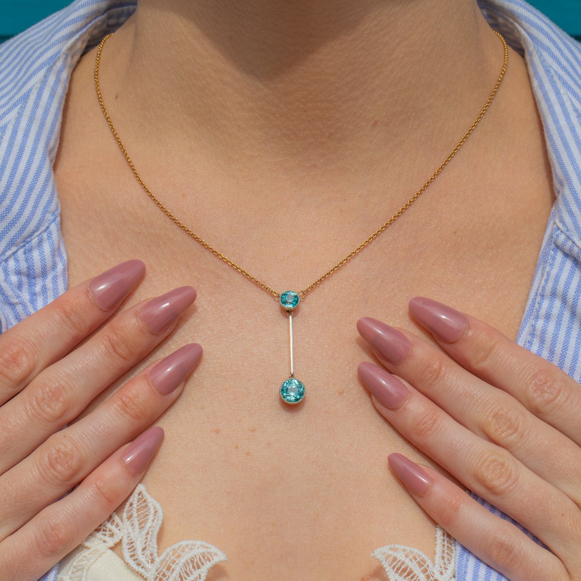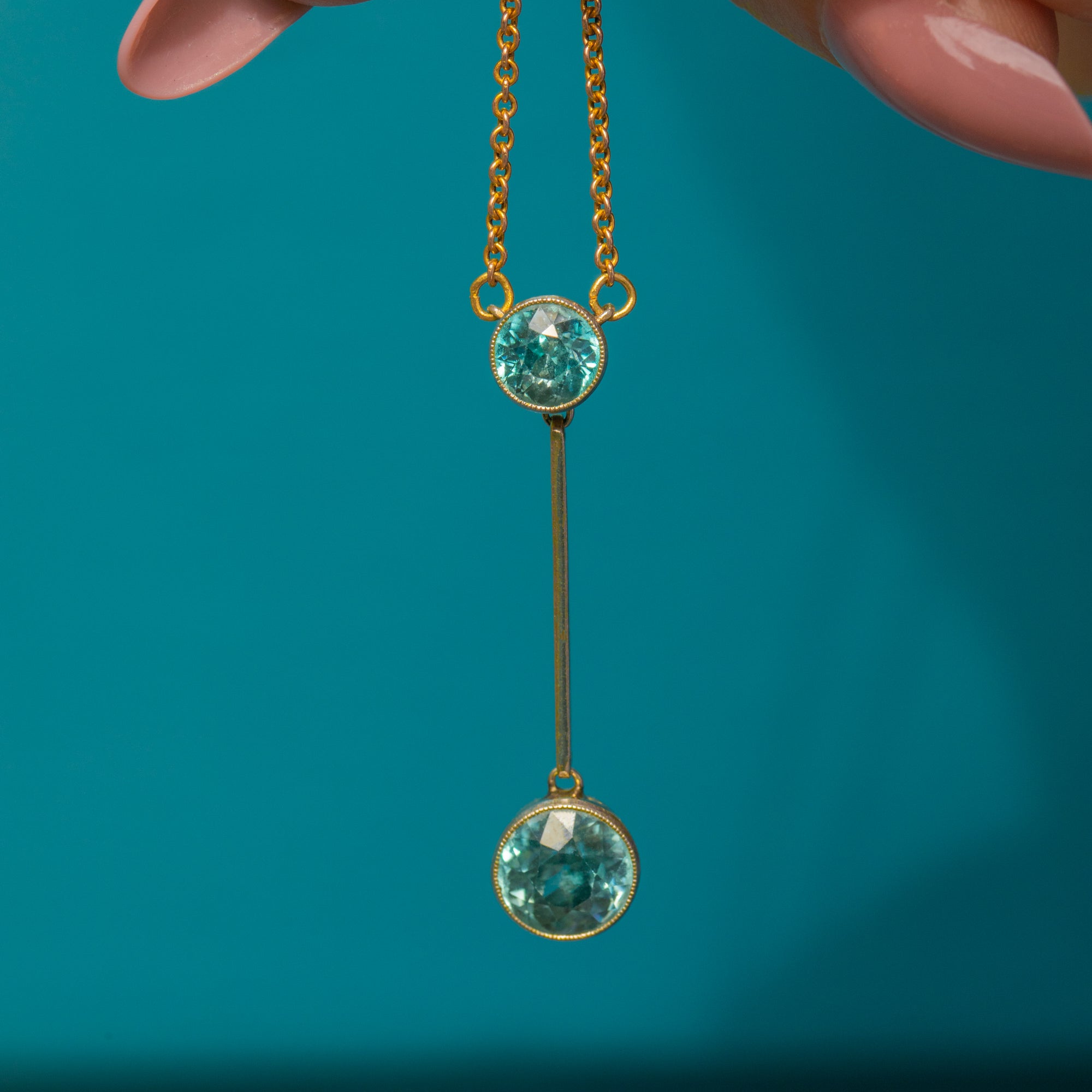 VERY GOOD. This Edwardian 15ct Gold blue Zircon drop necklace is in very good condition. Each component is securely connected with a wonderful fluidity throughout. The Blue Zircon are secure within their settings and although there is some wear to the facets, this cannot be seen through their vivacious blue sparkle. To the Gold bar along the side there is some wear, however this is only noticeable under close inspection. With a securely attached Gold chain and fully functioning bolt-ring, you can wear this Edwardian necklace confidently!