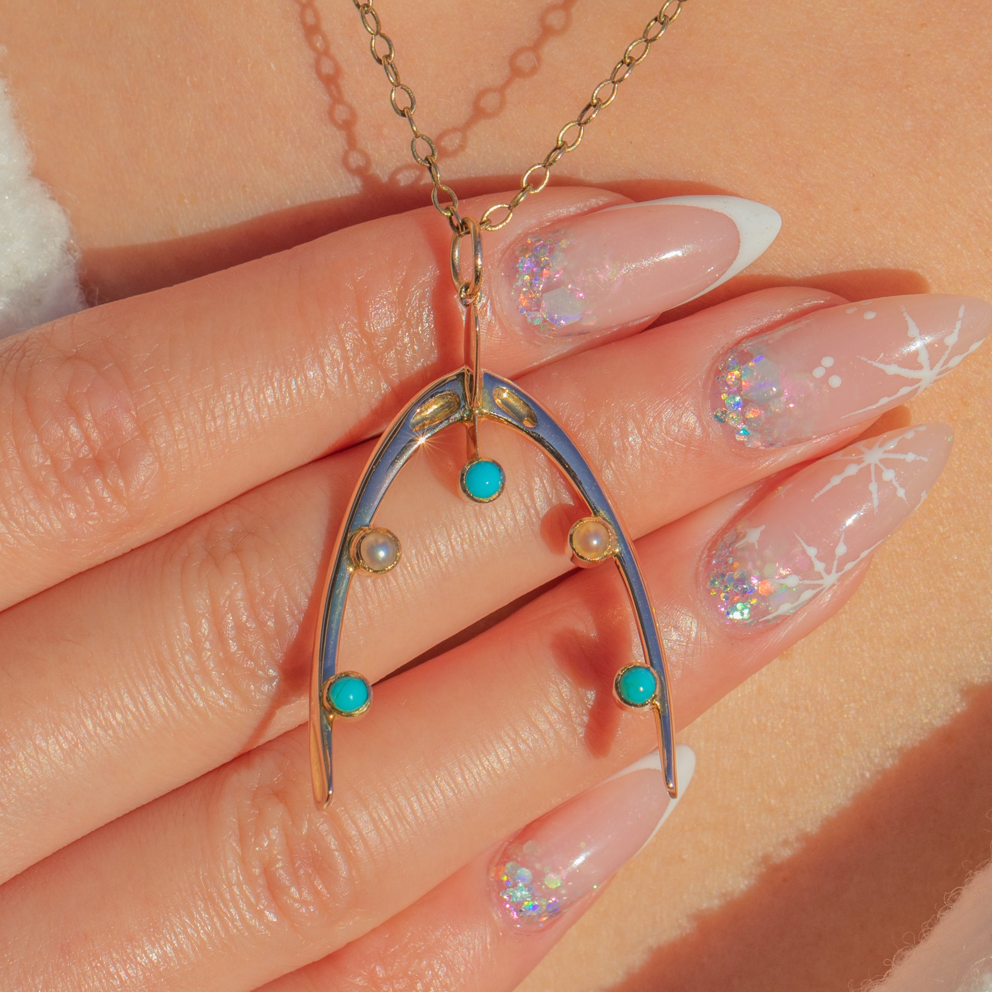 A charming Edwardian wishbone pendant crafted in rich 15ct Gold, set with petite Turquoise and a creamy Pearl along the inner arc. The open-frame silhouette feels airy and refined, adding a touch of luxury to every outfit.