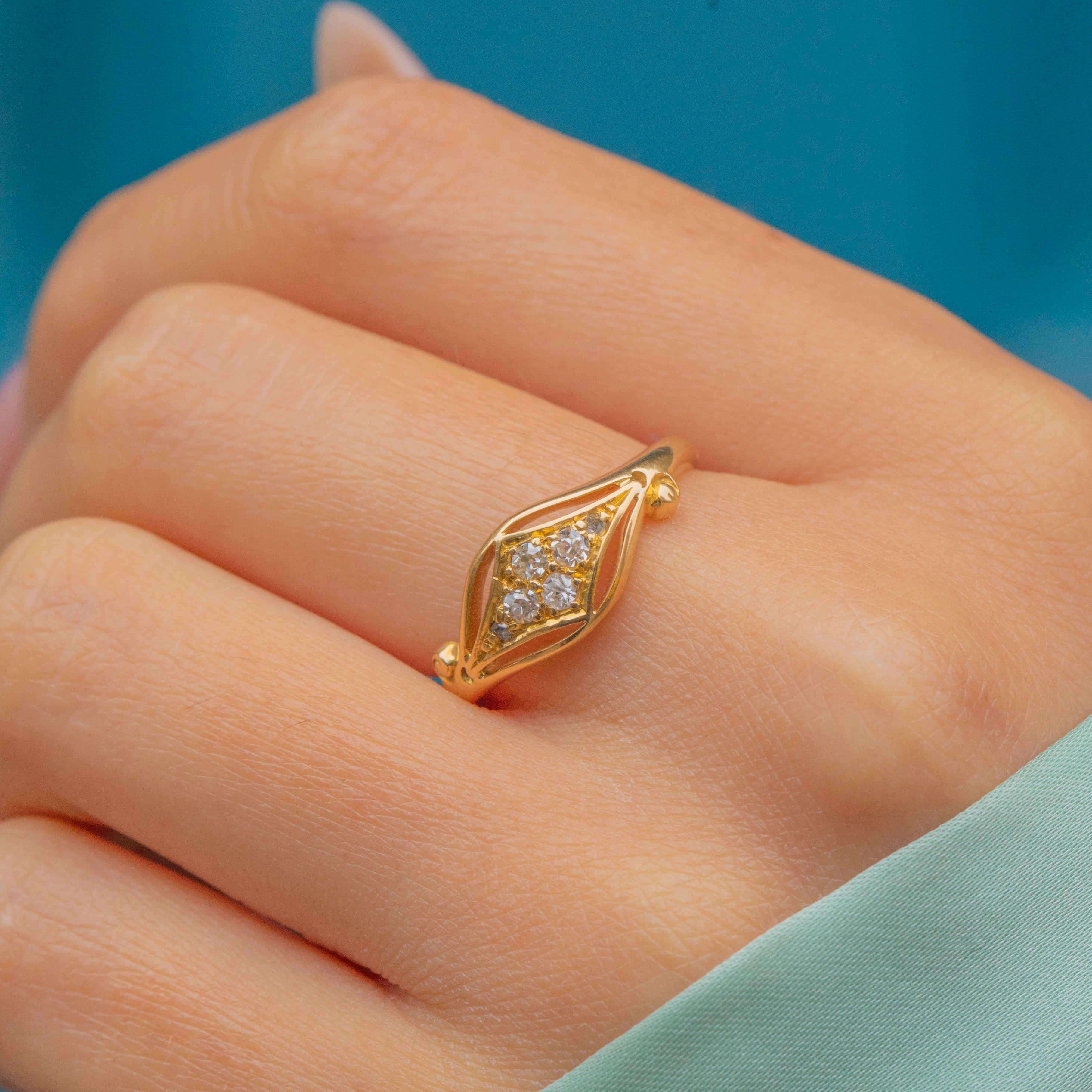 This elegant 18ct Gold Diamond ring showcases six sparkling Diamonds with a combined weight of approximately 0.15ct, flanked by a buttery knife-edge shank. A charming piece of antique jewellery, this ring carries a full set of English hallmarks and is dated to 1916.