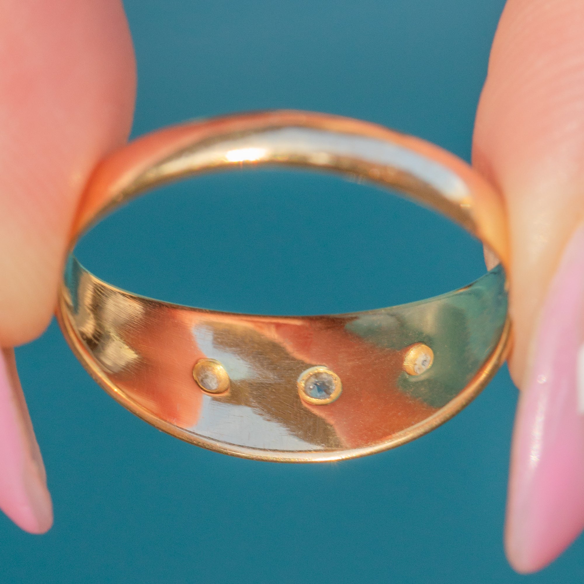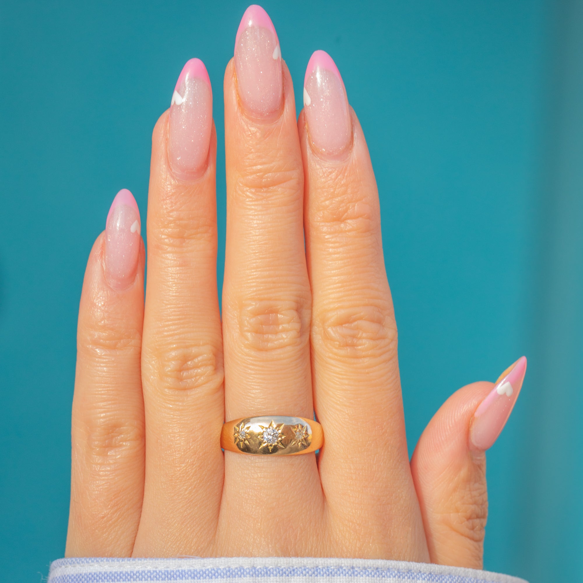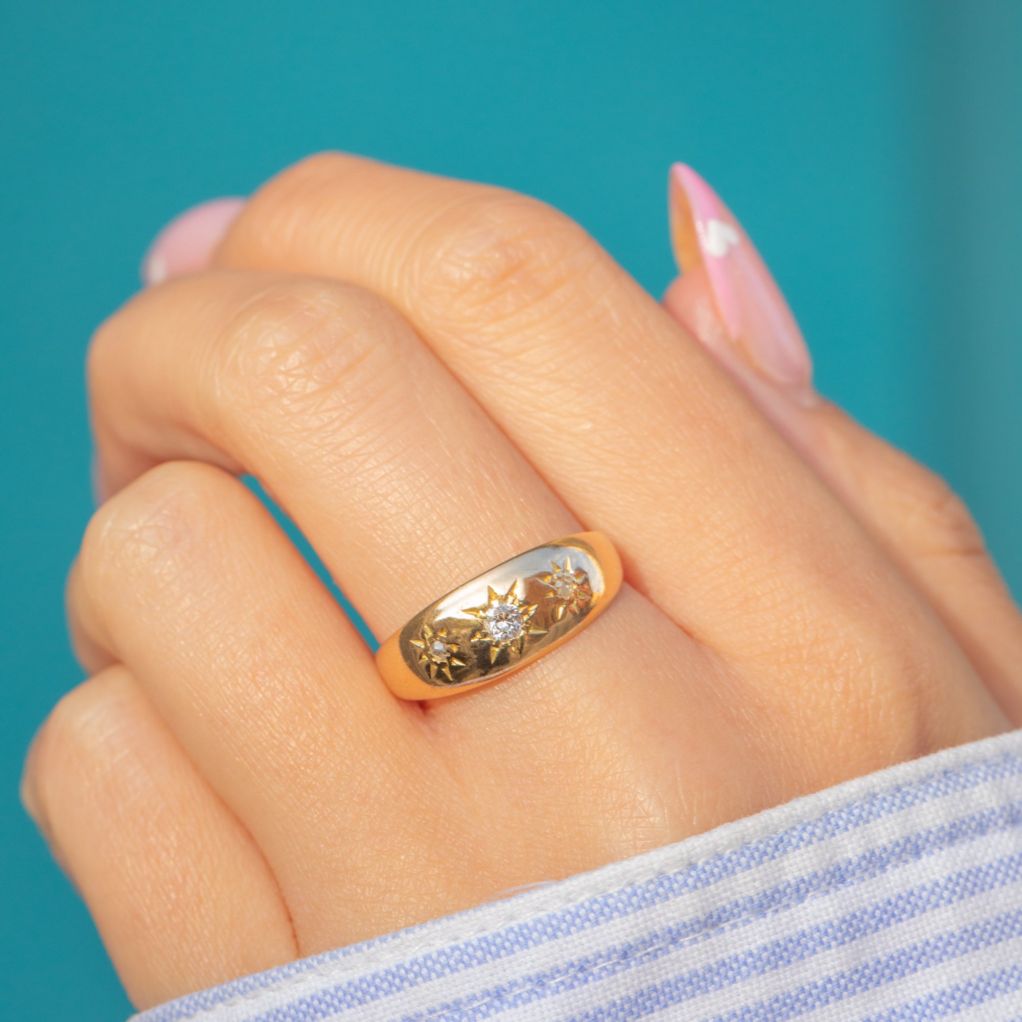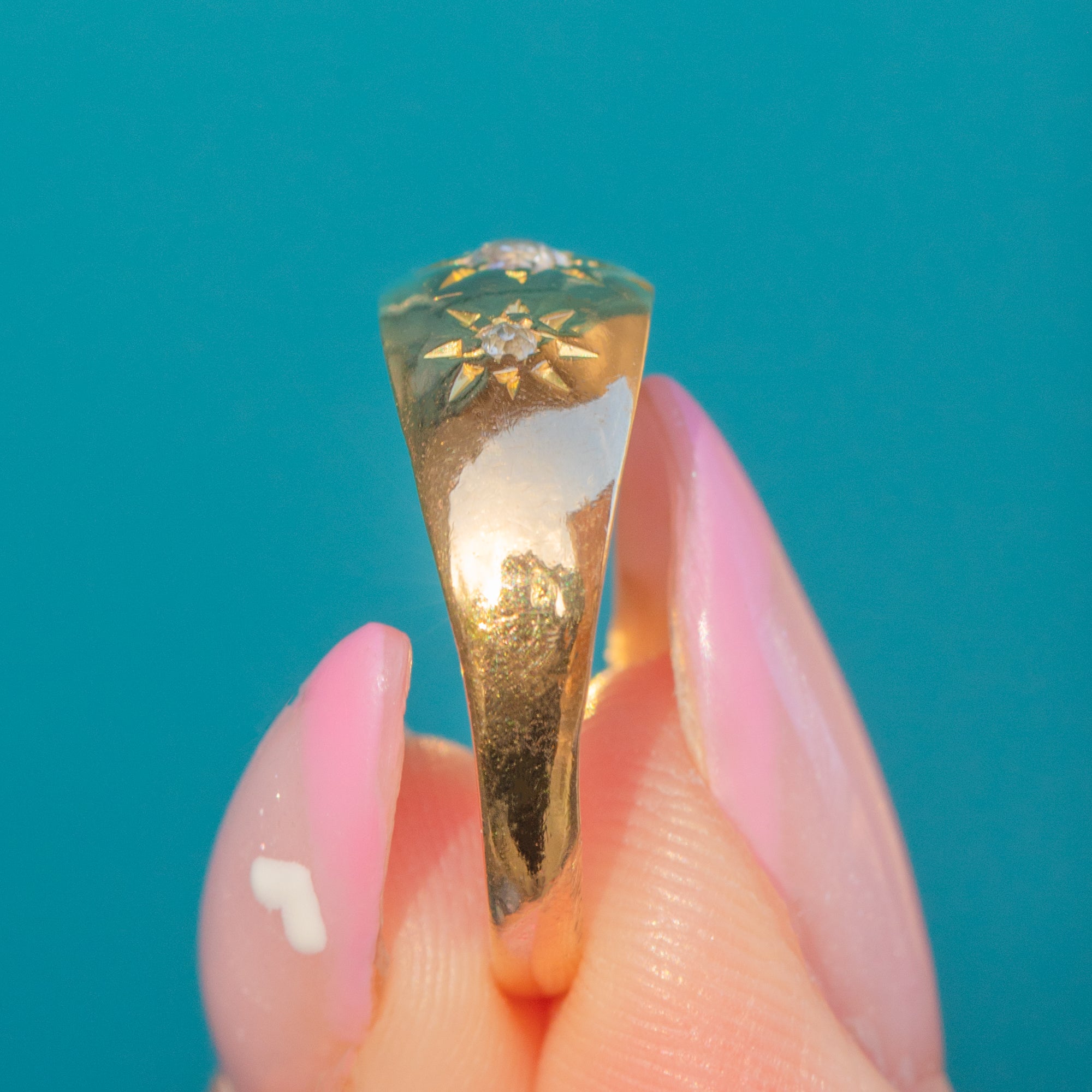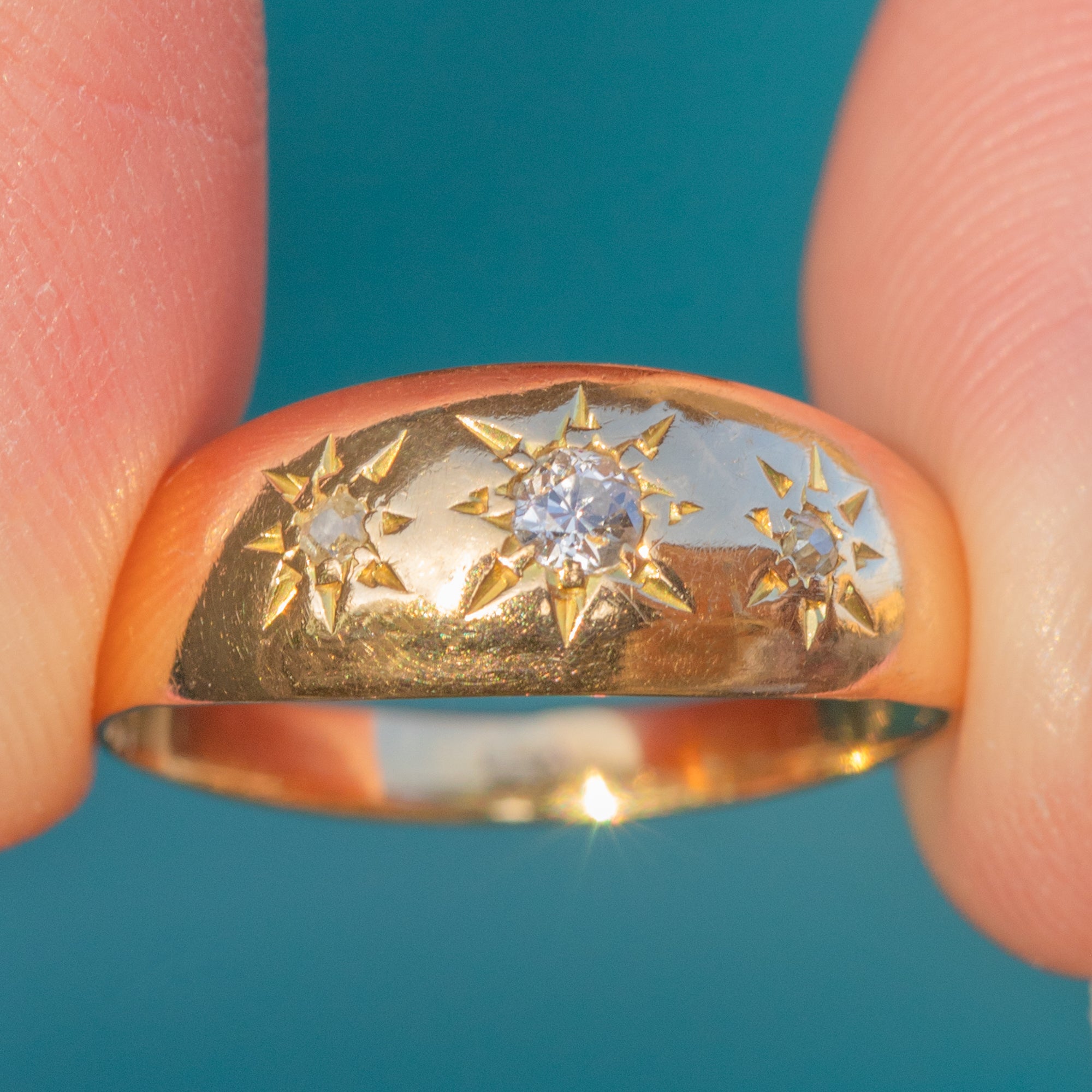 This classic Edwardian Gypsy ring is crafted in rich 18ct Gold and set with three sparkling Diamonds in traditional star-shaped settings. The centre Diamond is slightly larger, framed by two smaller stones to create a perfectly balanced and timeless look.