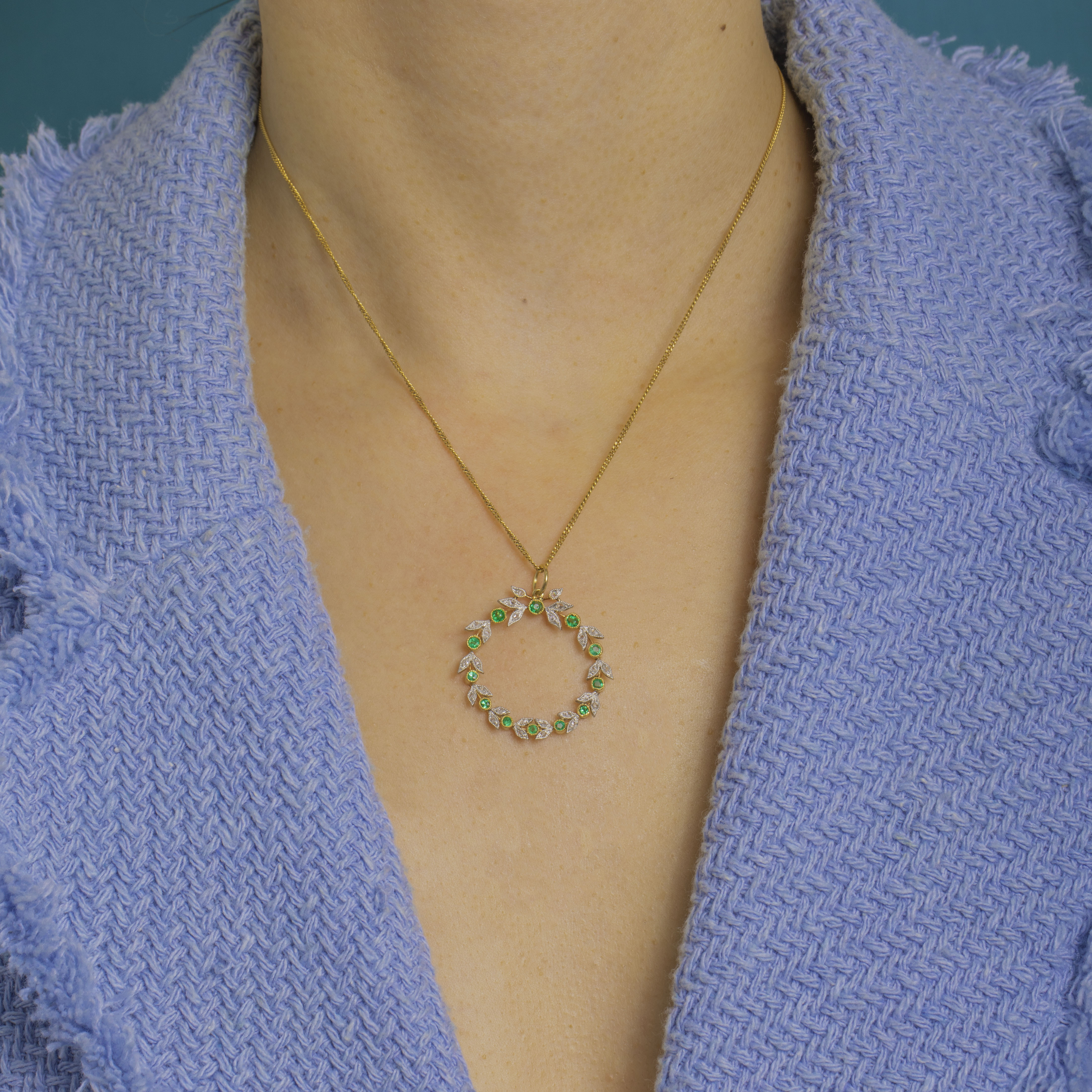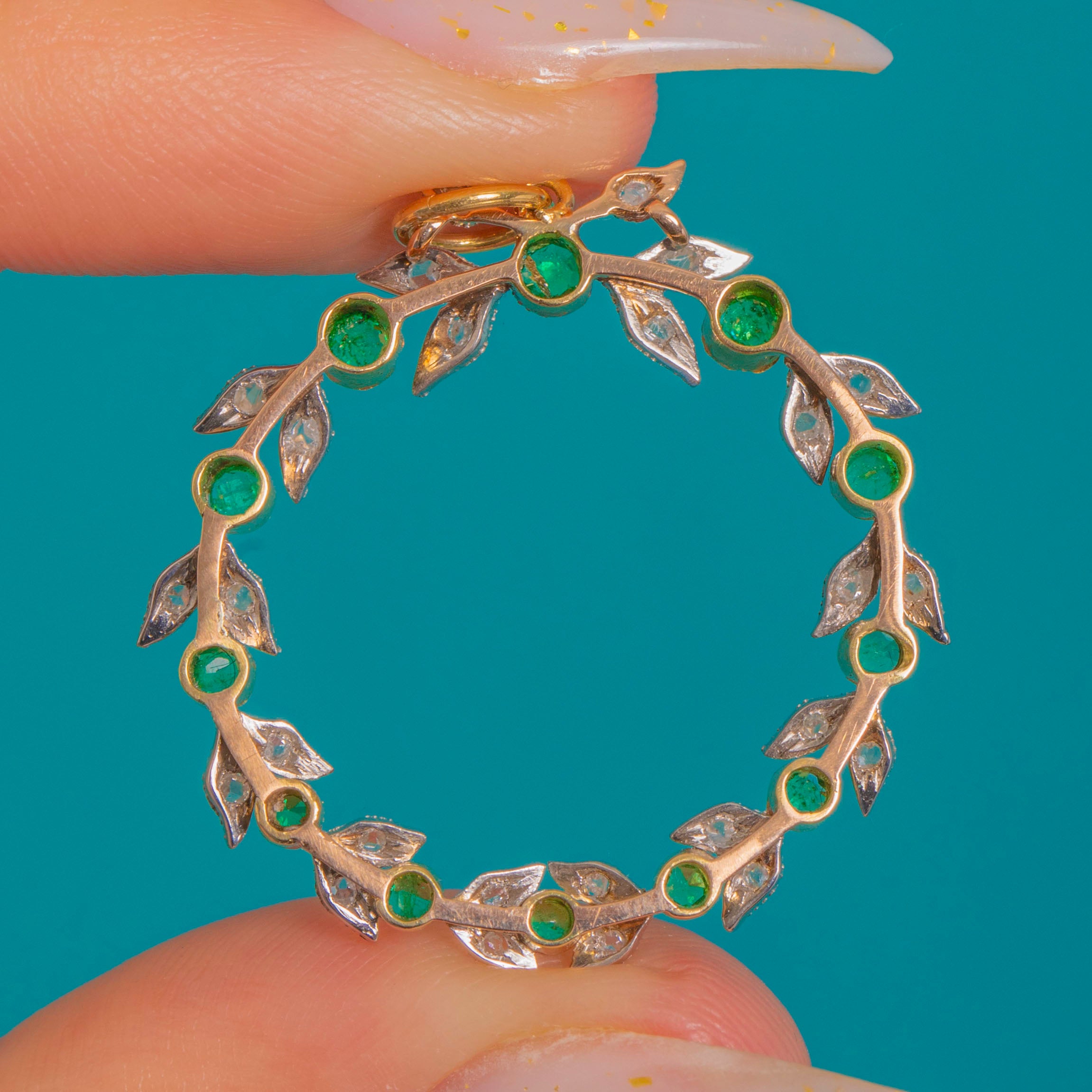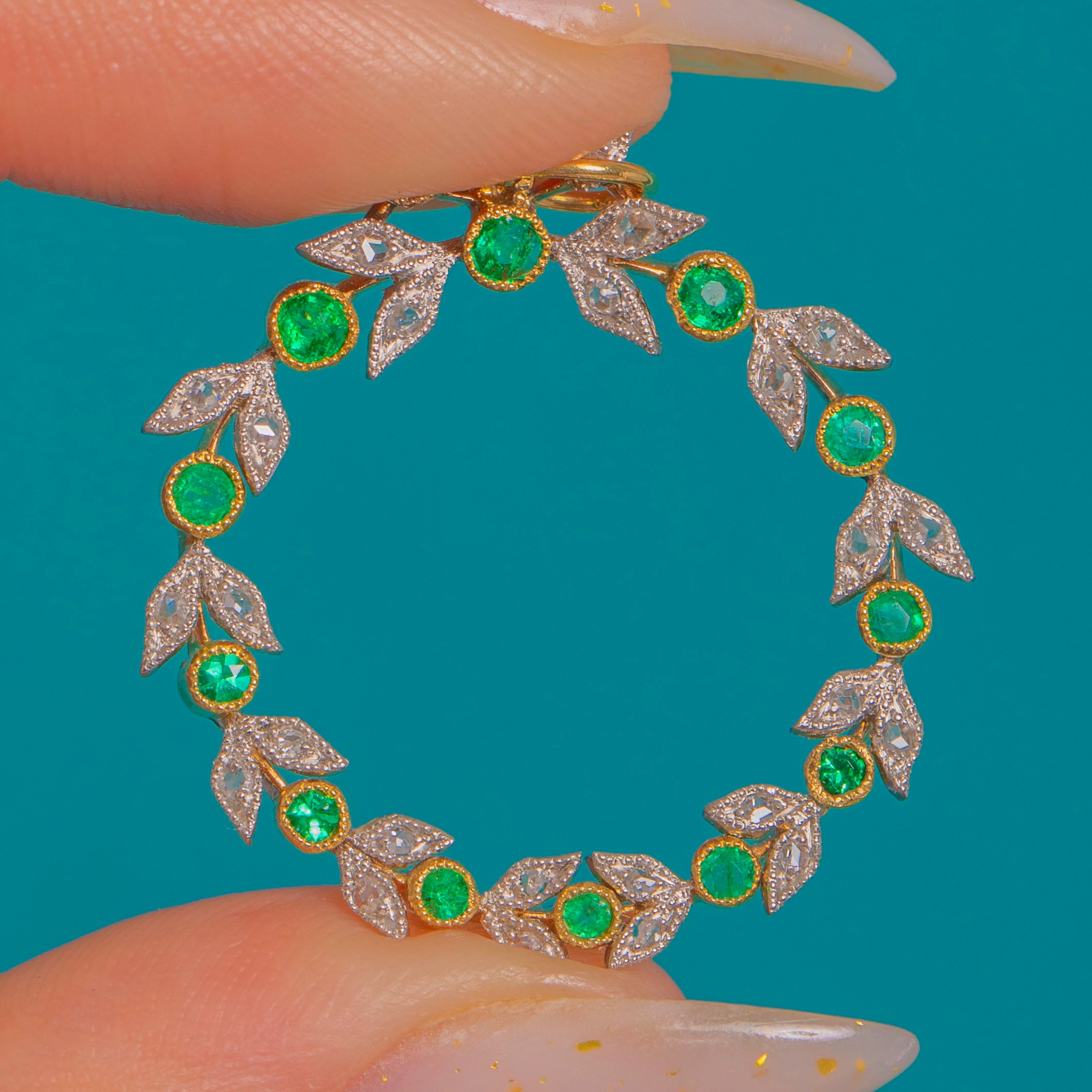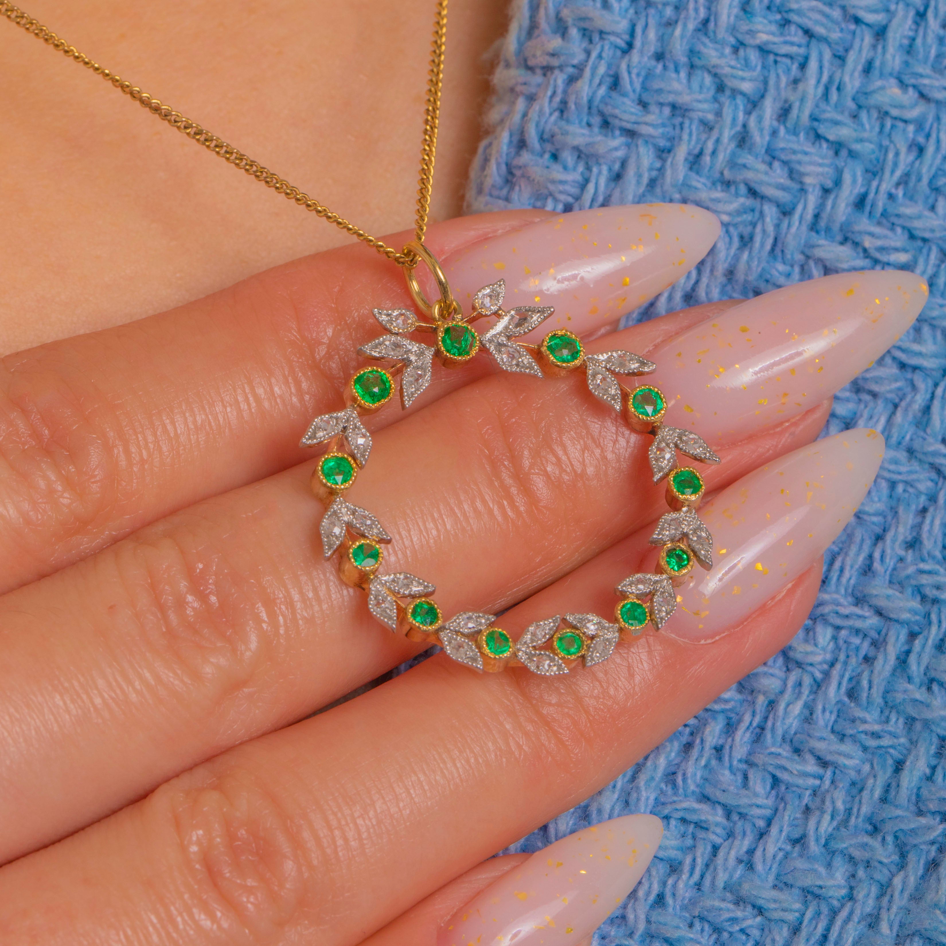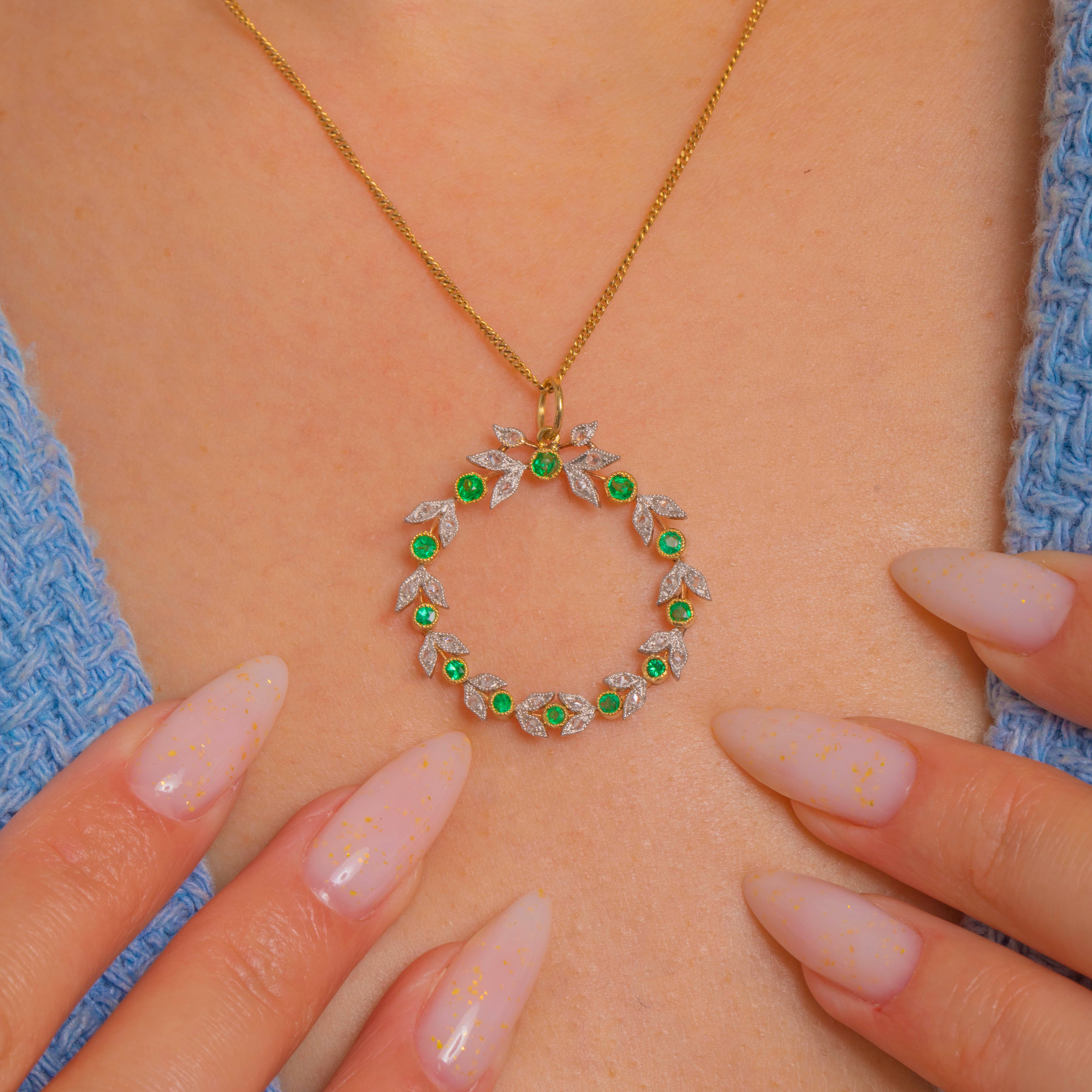 A beguiling Edwardian garland pendant, formed as a delicate open wreath where vivid round Emeralds alternate with foliate leaf motifs sparkling with tiny Diamond accents. The leaves are edged with fine milgrain for that soft, lace-like glimmer so beloved of the period, and the circular form sits with effortless grace—refined, airy and beautifully balanced.