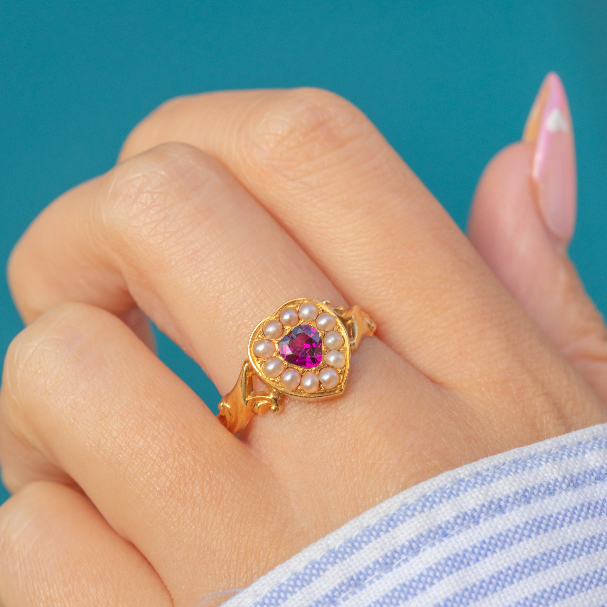 Edwardian 18ct Gold Garnet & Pearl Heart Ring