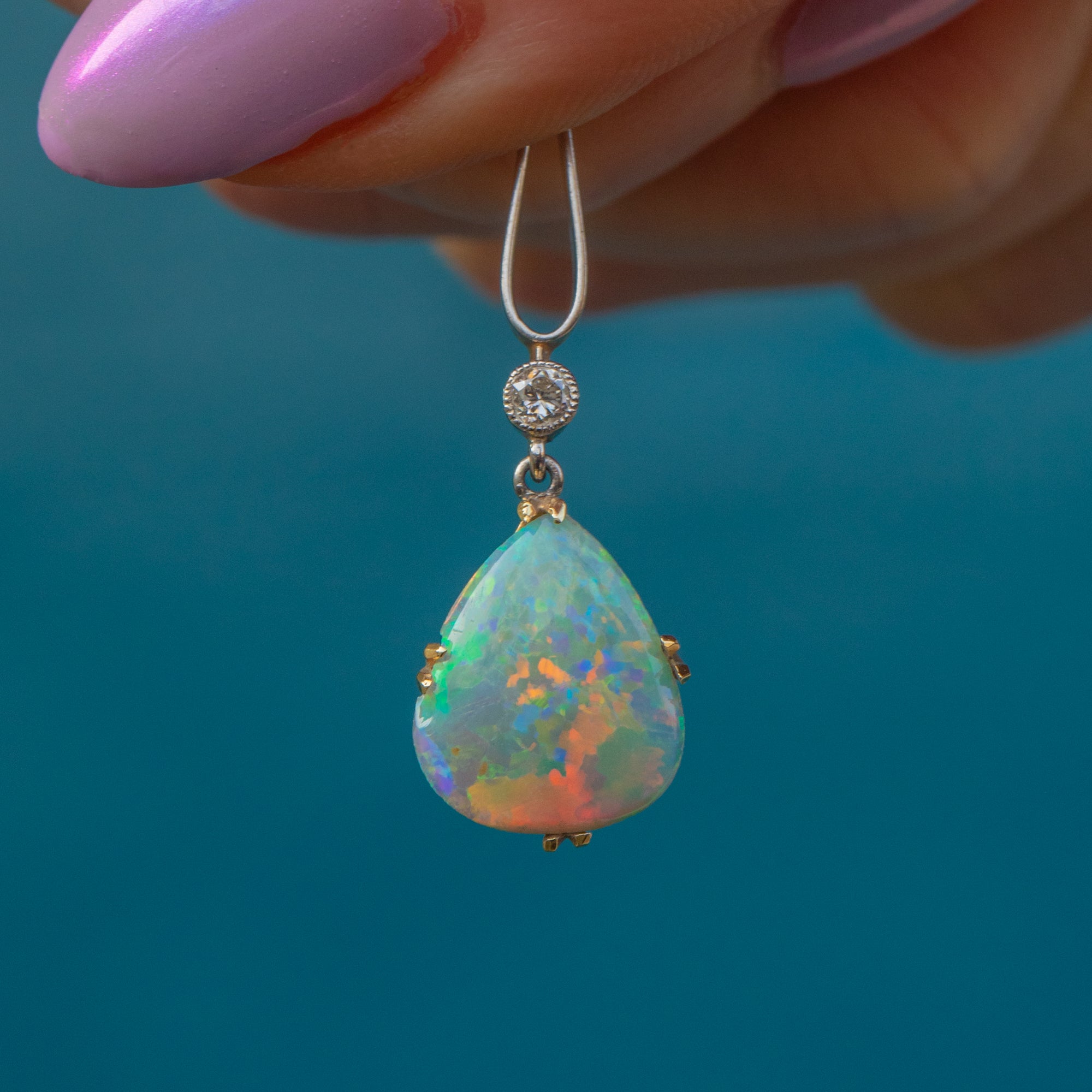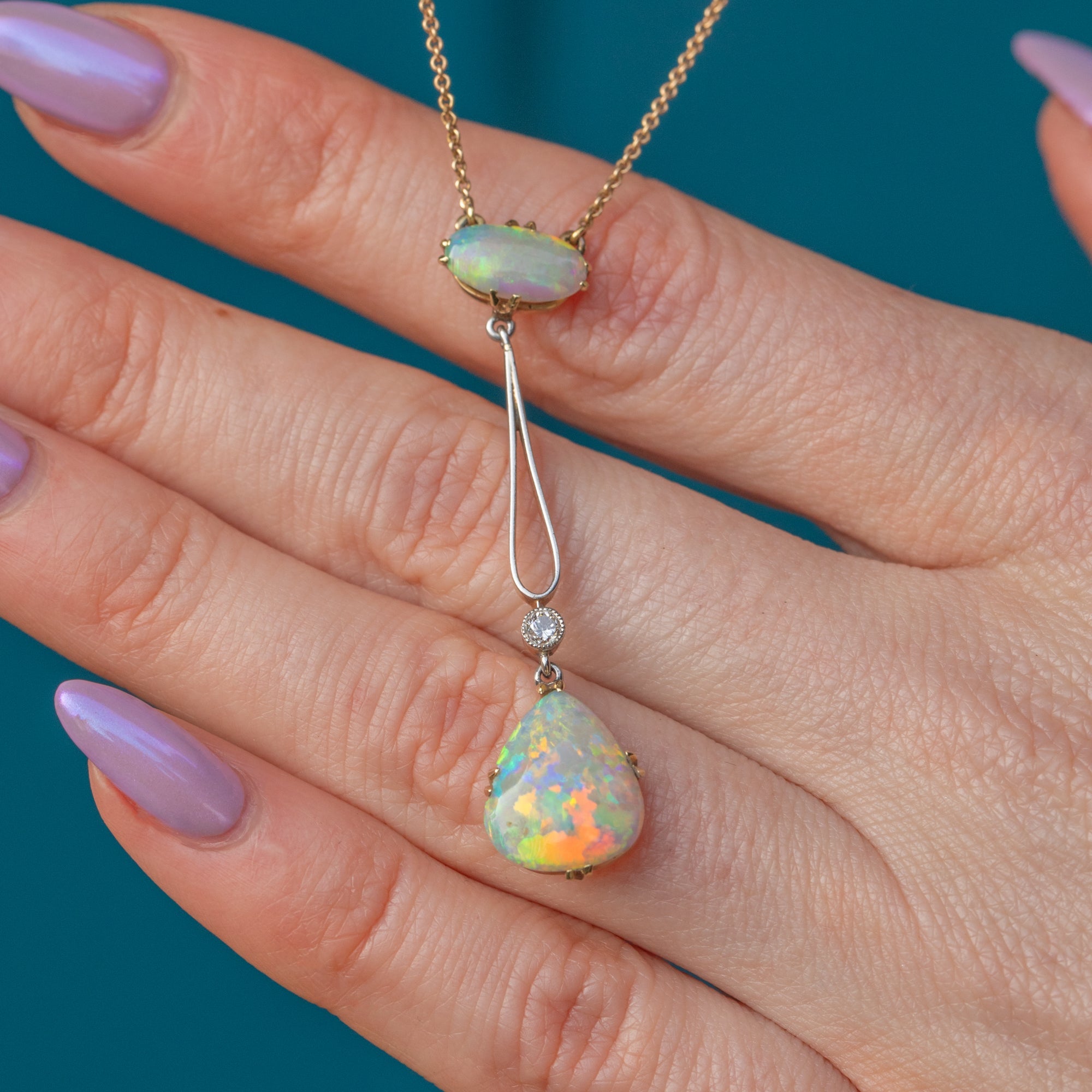 The large teardrop Opal is suspended from a Gold bar drop with Platinum detailing, giving this antique necklace a lovely fluidity. Her scintillating Diamond marries perfectly with the galactic spectrum of her Opals, making for the most splendorous combination.