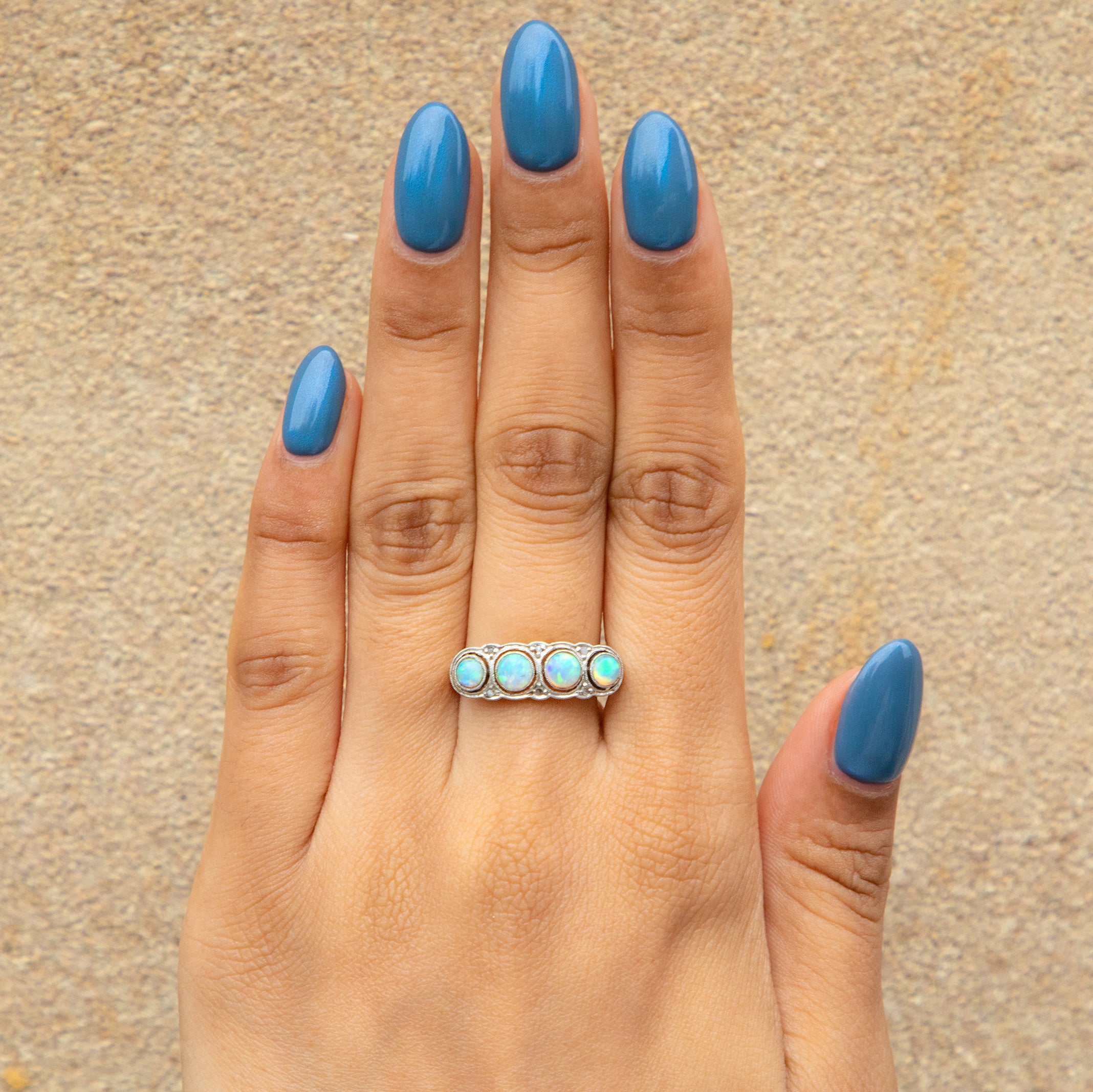 This sensational Edwardian 18ct Gold Opal Diamond four stone ring has an unmatched ethereal beauty! Boasting four iridescent Opal cabochons, each perfectly poised and possessing neon hues of blues, greens and purples, this antique ring radiates elegance from her every curve.