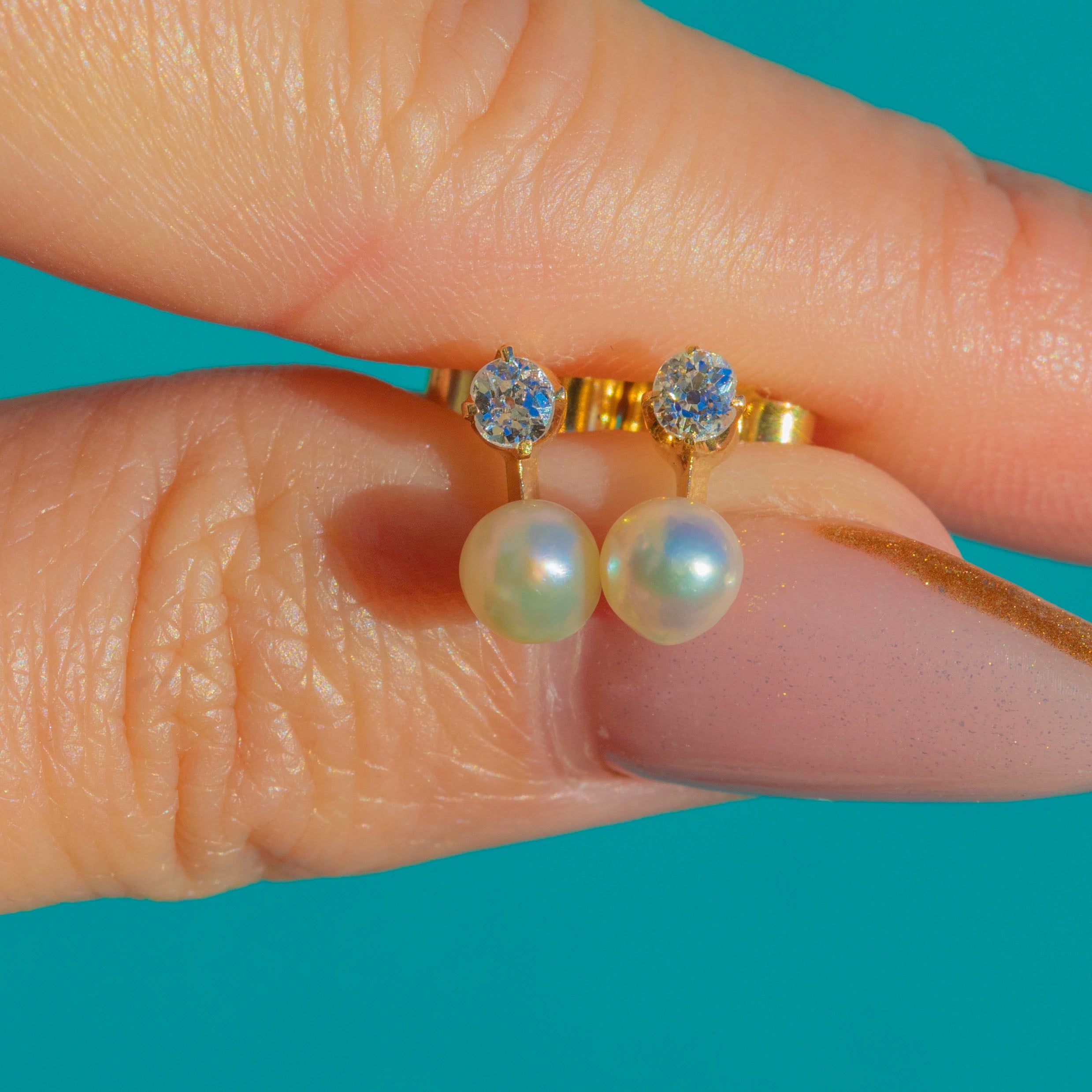 VERY GOOD: Pearls are lustrous with only light surface wear visible under close inspection. Diamonds are securely set and bright, with no obvious chips or damage. Gold settings and posts show minor surface wear in keeping with age but no repairs or issues affecting wear, and the studs present beautifully when worn.