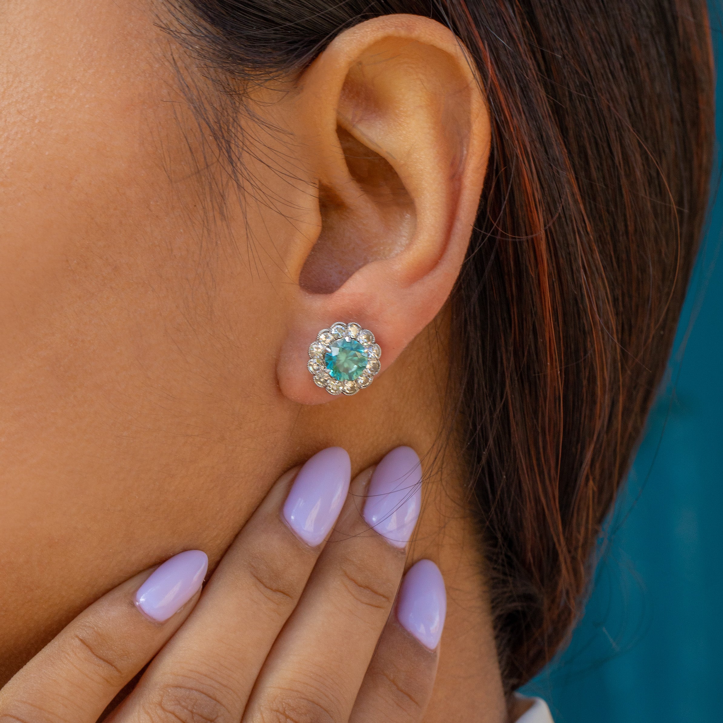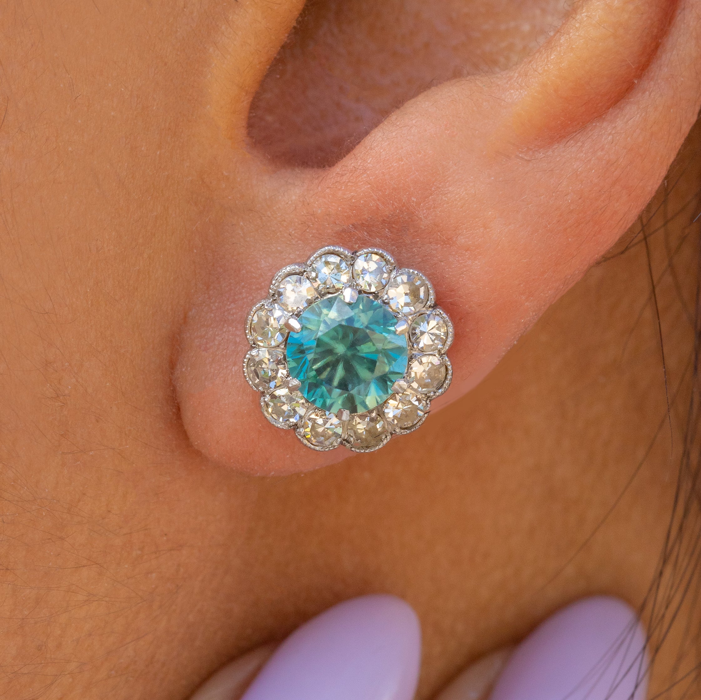 These Edwardian 18ct Gold & Platinum blue Zircon Diamond cluster earrings are the perfect pair for glamorous occasions! Each cluster has a glorious display of scintillating Diamonds haloing a bright icy blue Zircon, with a combined weight of 3.30ct, that will catch the attention of any onlooker.