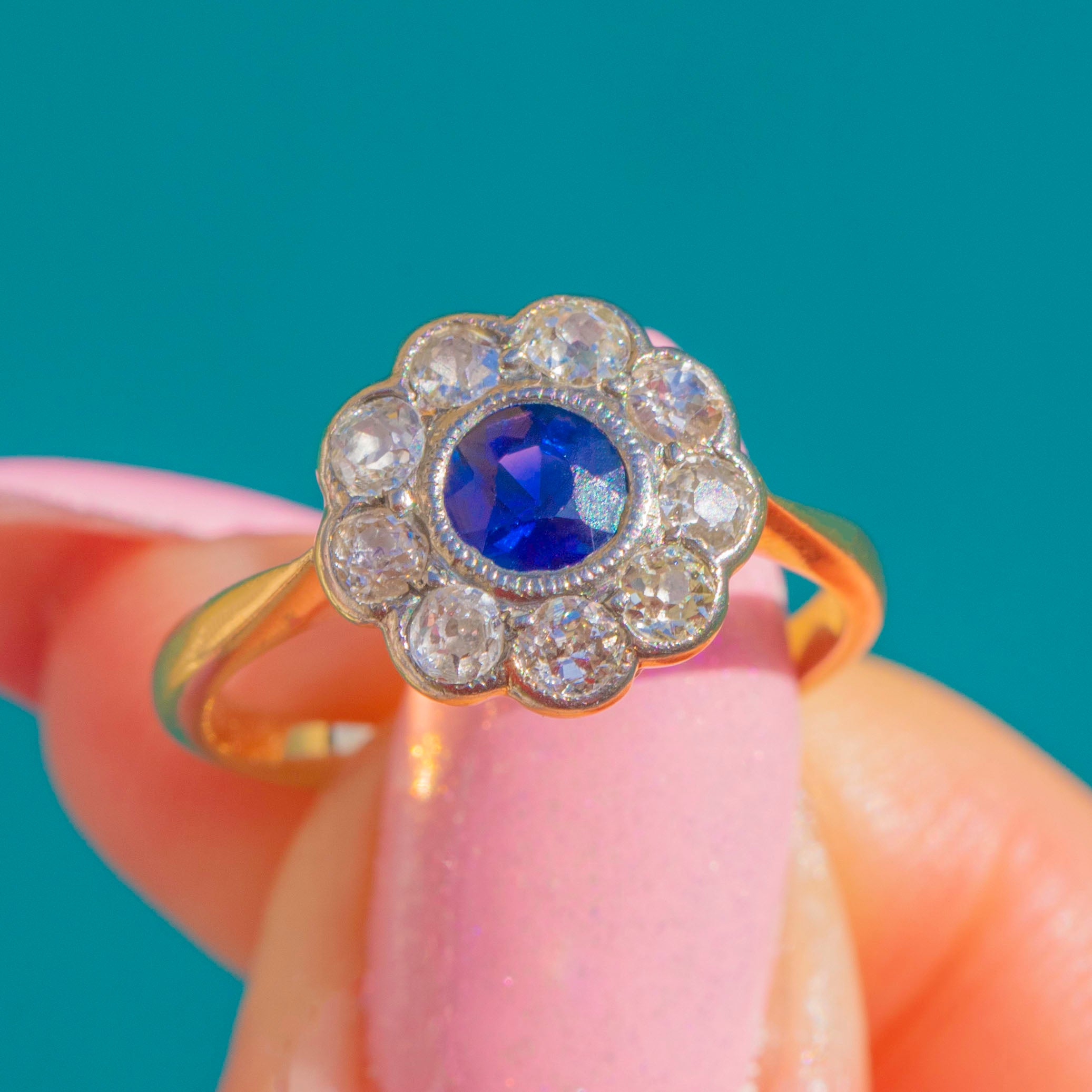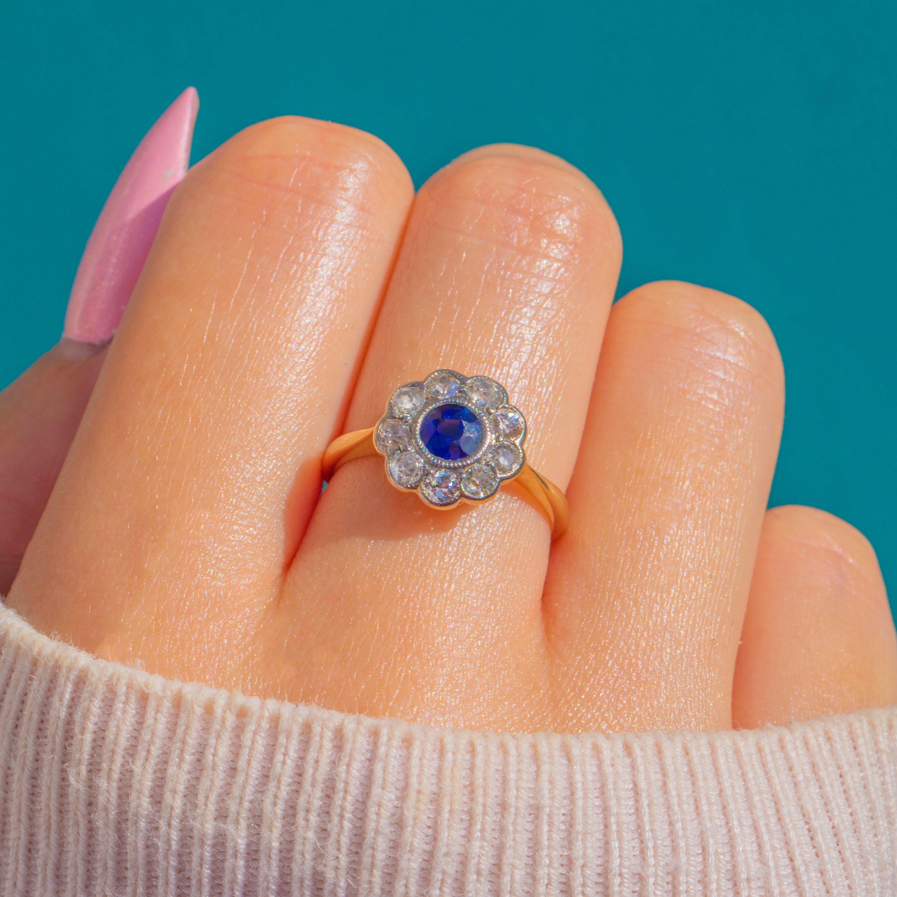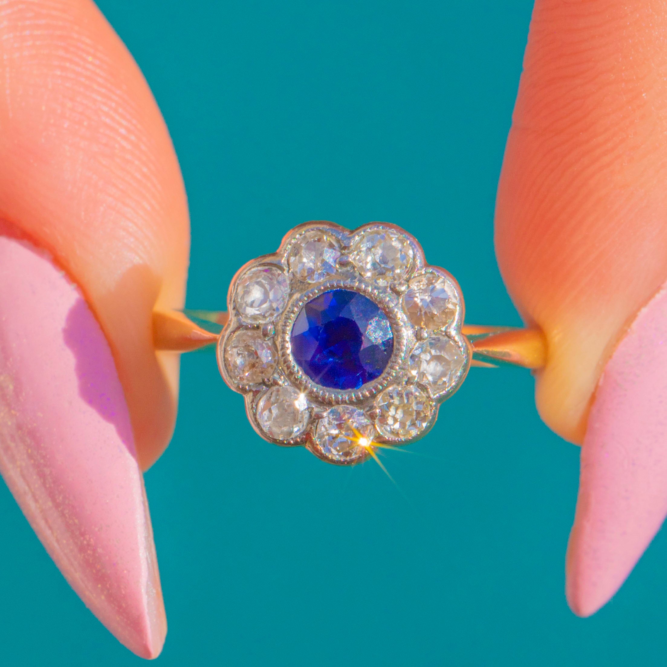 A classic Edwardian daisy cluster ring with a rich, royal-blue Sapphire at its heart, framed by a halo of bright round Diamonds. The floral head is finished with fine milgrain and a graceful scalloped outline, lending a delicate, lace-like sparkle.