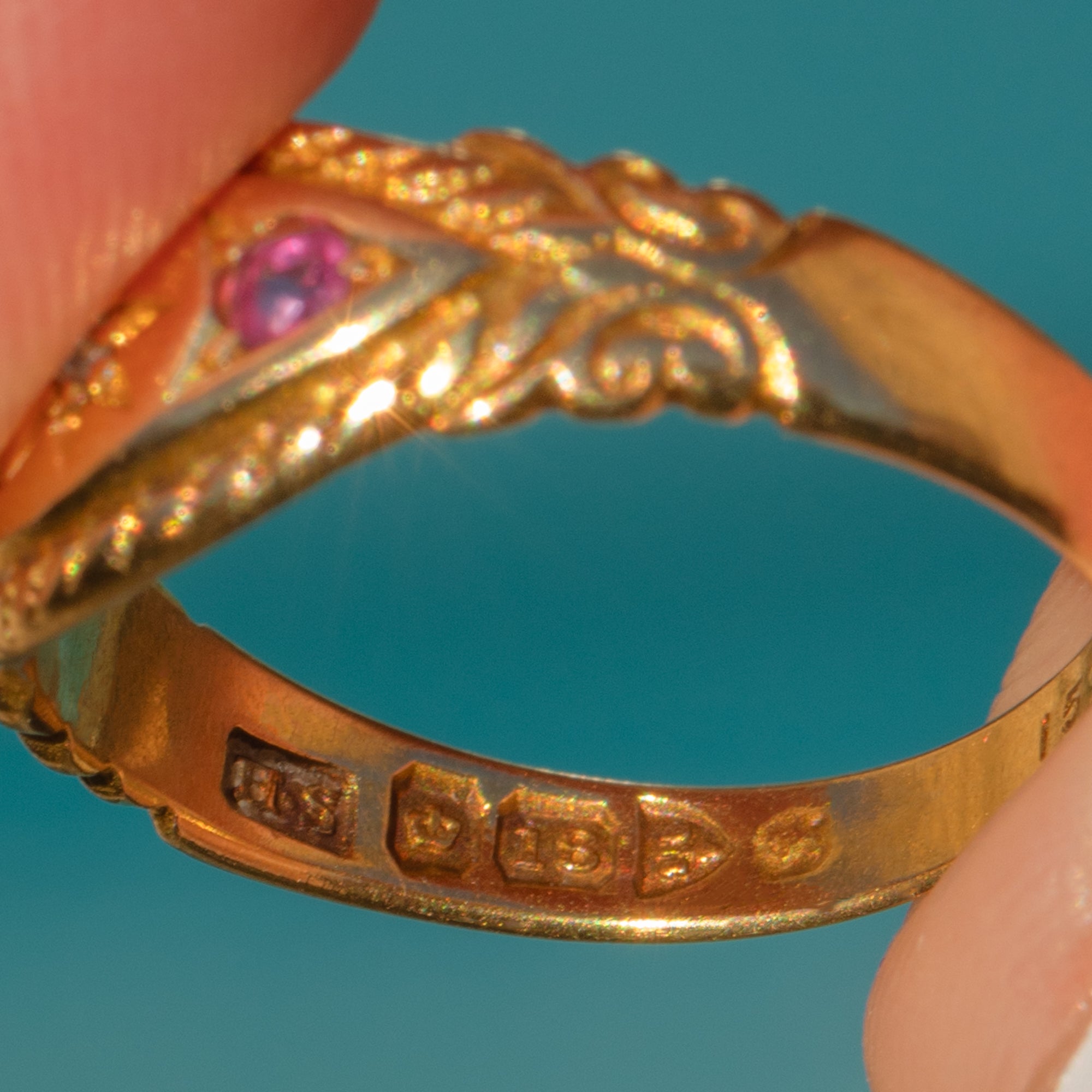 EXCELLENT: This antique 18ct Gold Ruby and Diamond gypsy ring is in excellent condition. Each of her gemstones is radiant and set securely, with no visible surface wear. The Gold is glossy and the band has kept its form well, with a full set of hunky antique hallmarks inside. With little else to note, she is a wonderful piece!
