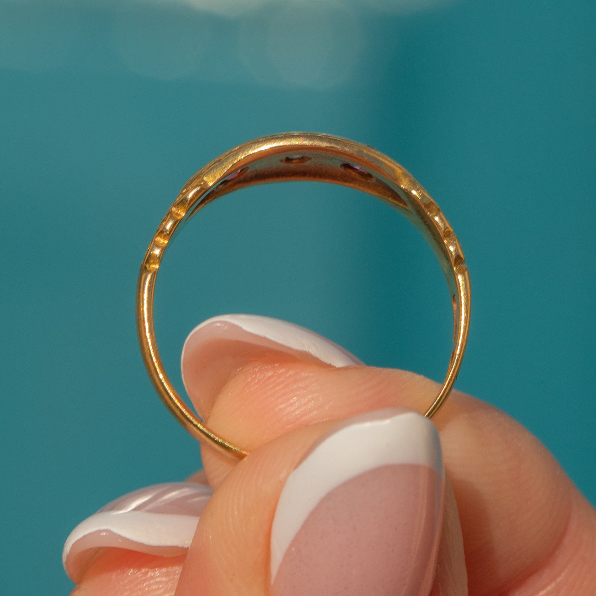 Fully hallmarked and dated to 1906, including the rare Chester Assay, this Edwardian gypsy ring is a highly coveted piece steeped in antique character!