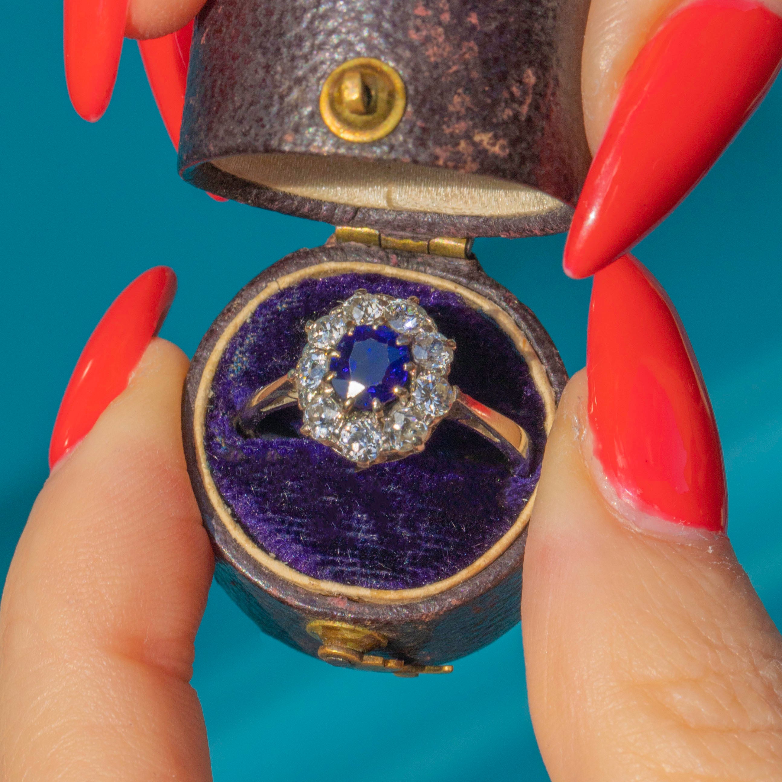 This is an exquisite antique Edwardian 18ct Gold Sapphire and Diamond cluster ring with a beautiful "pop" of colour! At its centre lies a stunning natural royal blue Sapphire, with exquisite saturation and colour... haloed by over half a carat of incredibly bright and sparkly natural old mine Diamonds!!