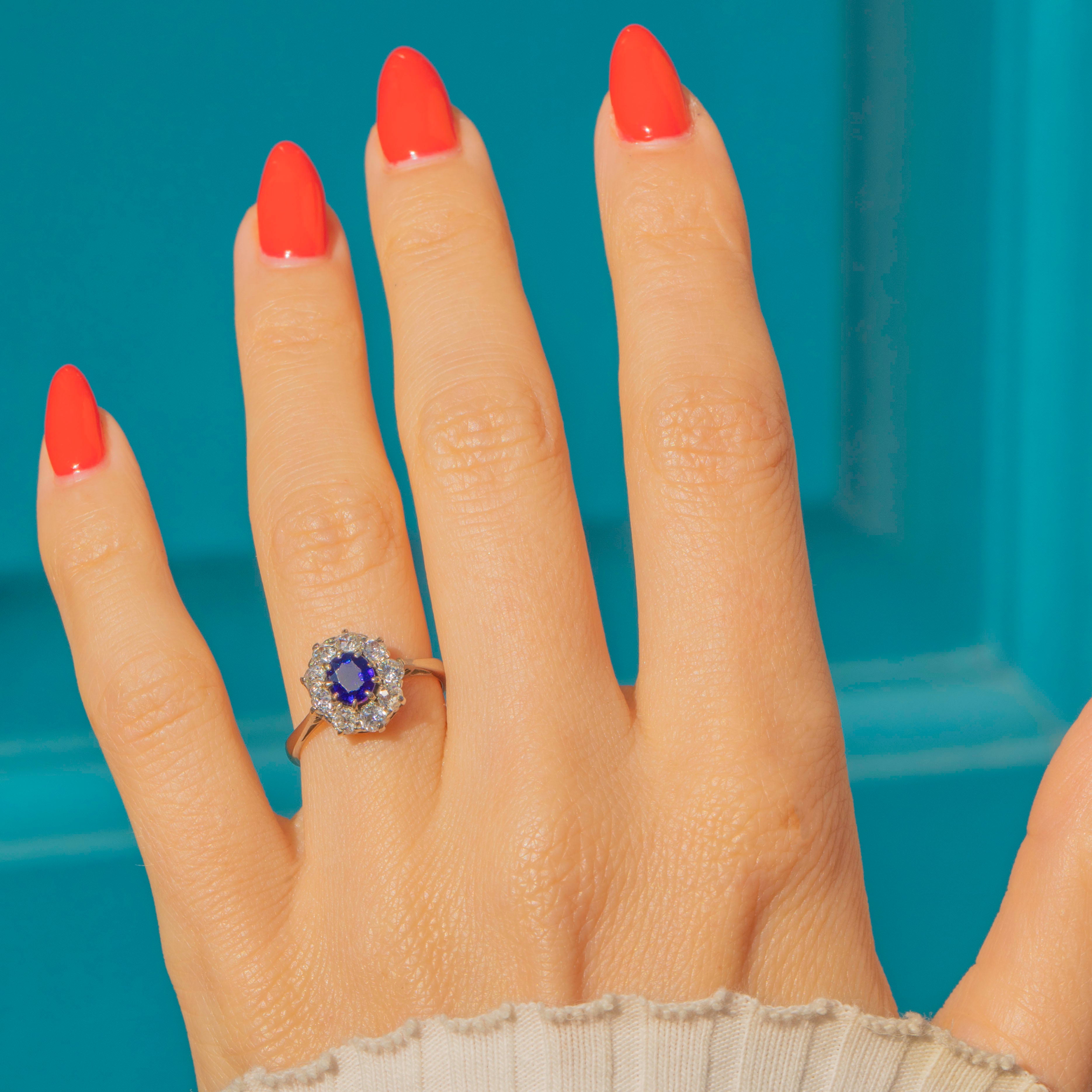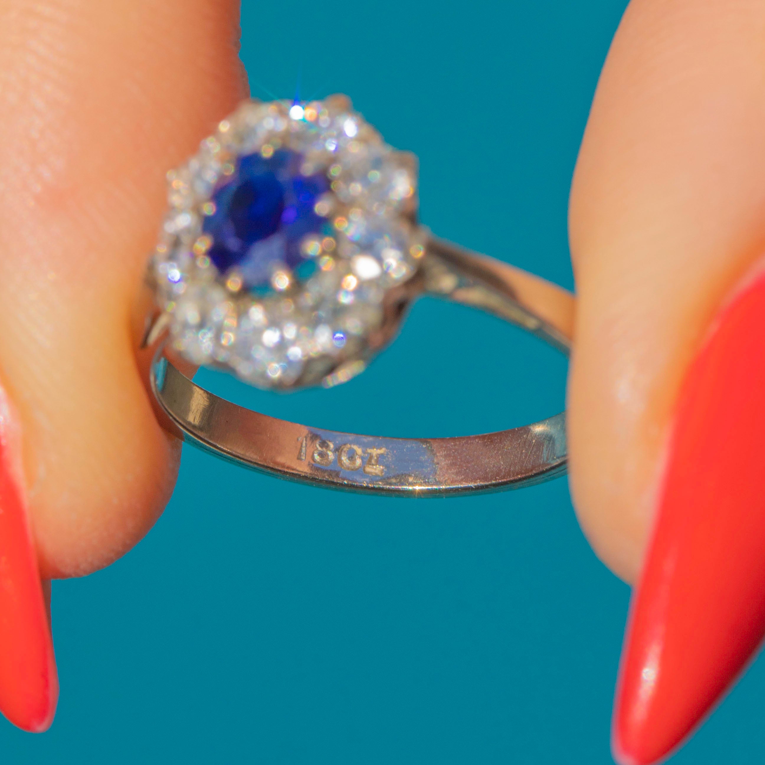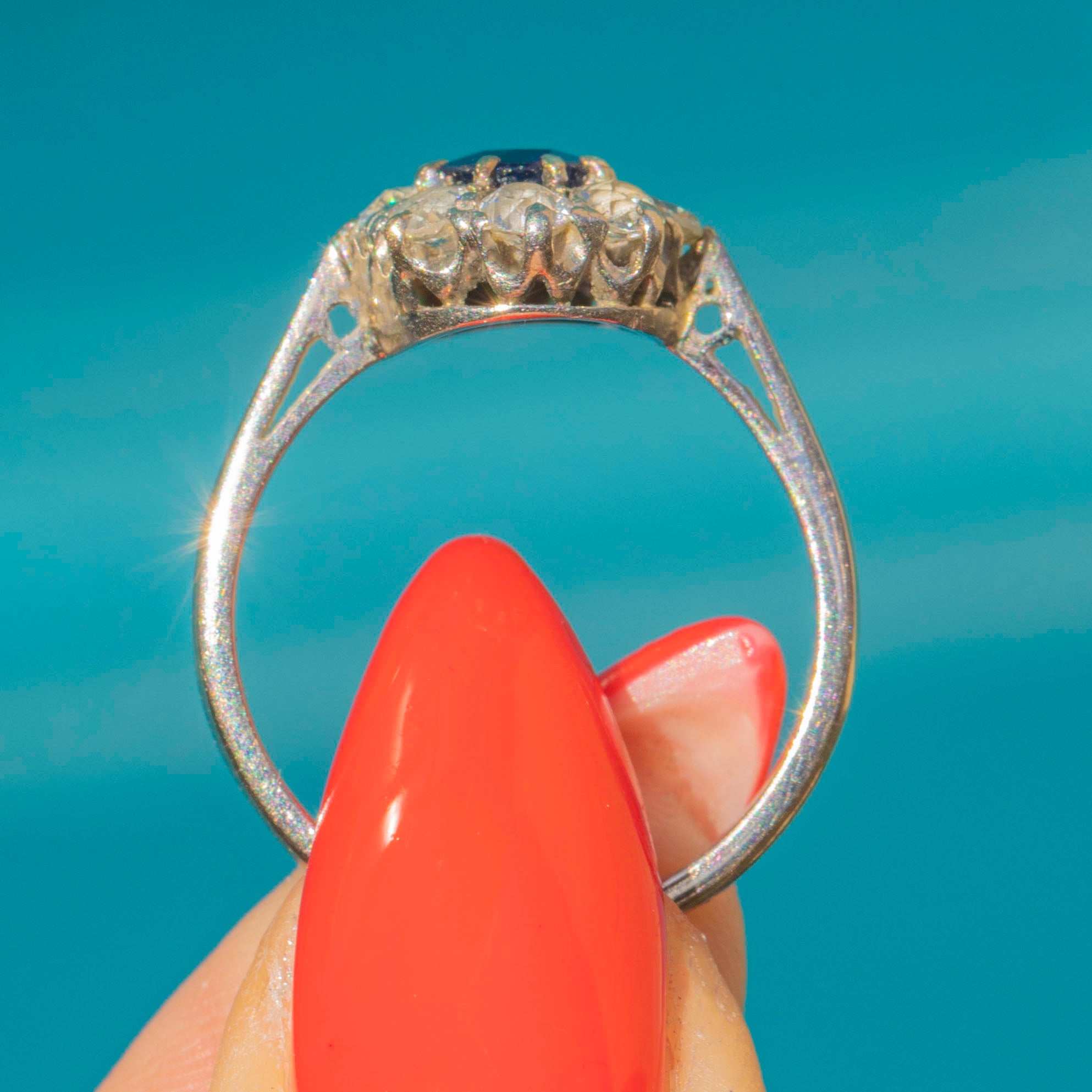 EXCELLENT. This Edwardian 18ct Gold Sapphire and Diamond cluster ring is absolutely delightful. The Sapphire is exquisite and boasts a richly saturated hue, free from chips or abrasions. The Diamonds are secure within their settings and sparkle brilliantly. The ring band is robust and her 18ct Gold has a lovely luster. The settings are in pristine condition holding all the gemstones securely in place. This timeless antique cluster ring would make a wonderful investment piece to pass down to generations to come!